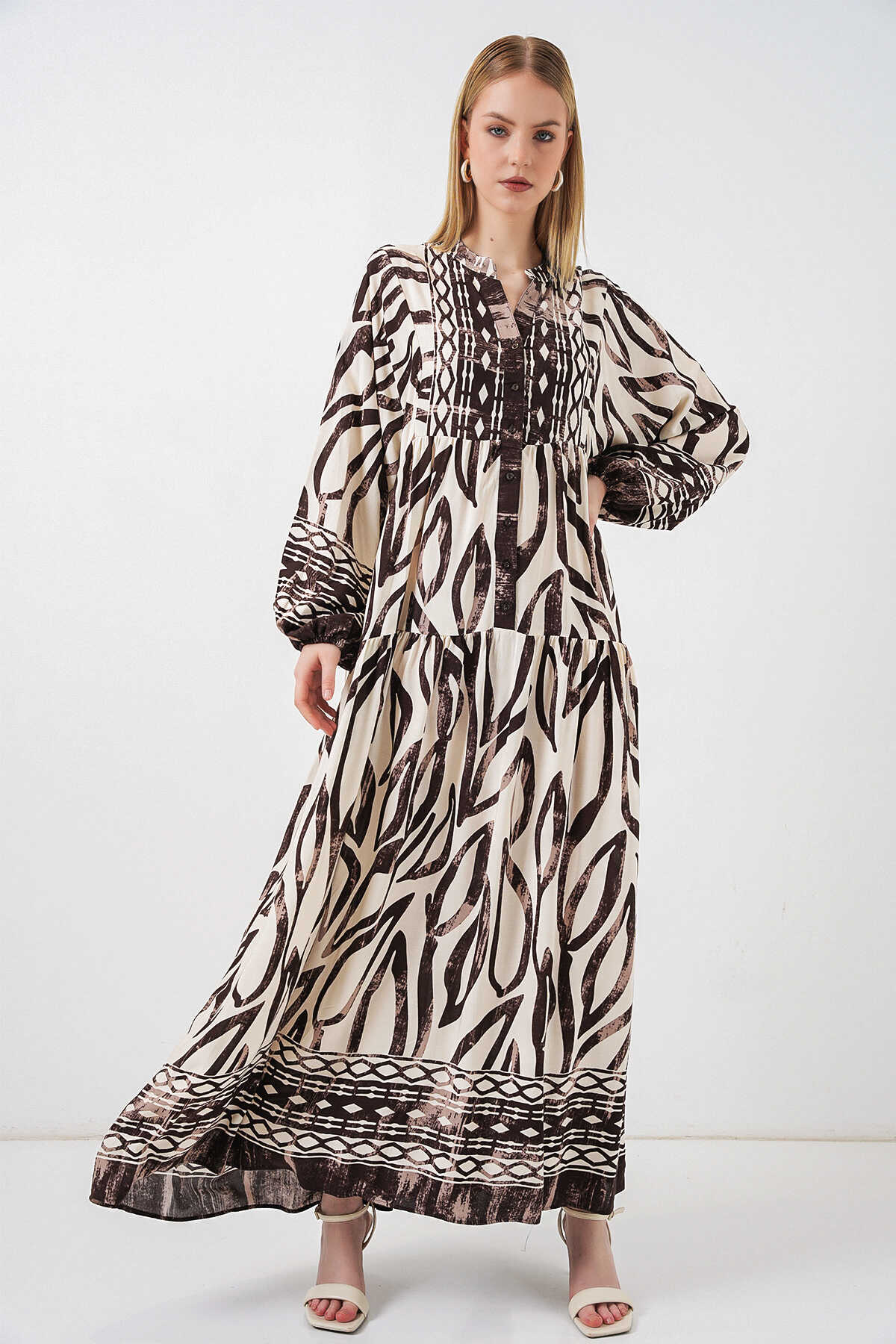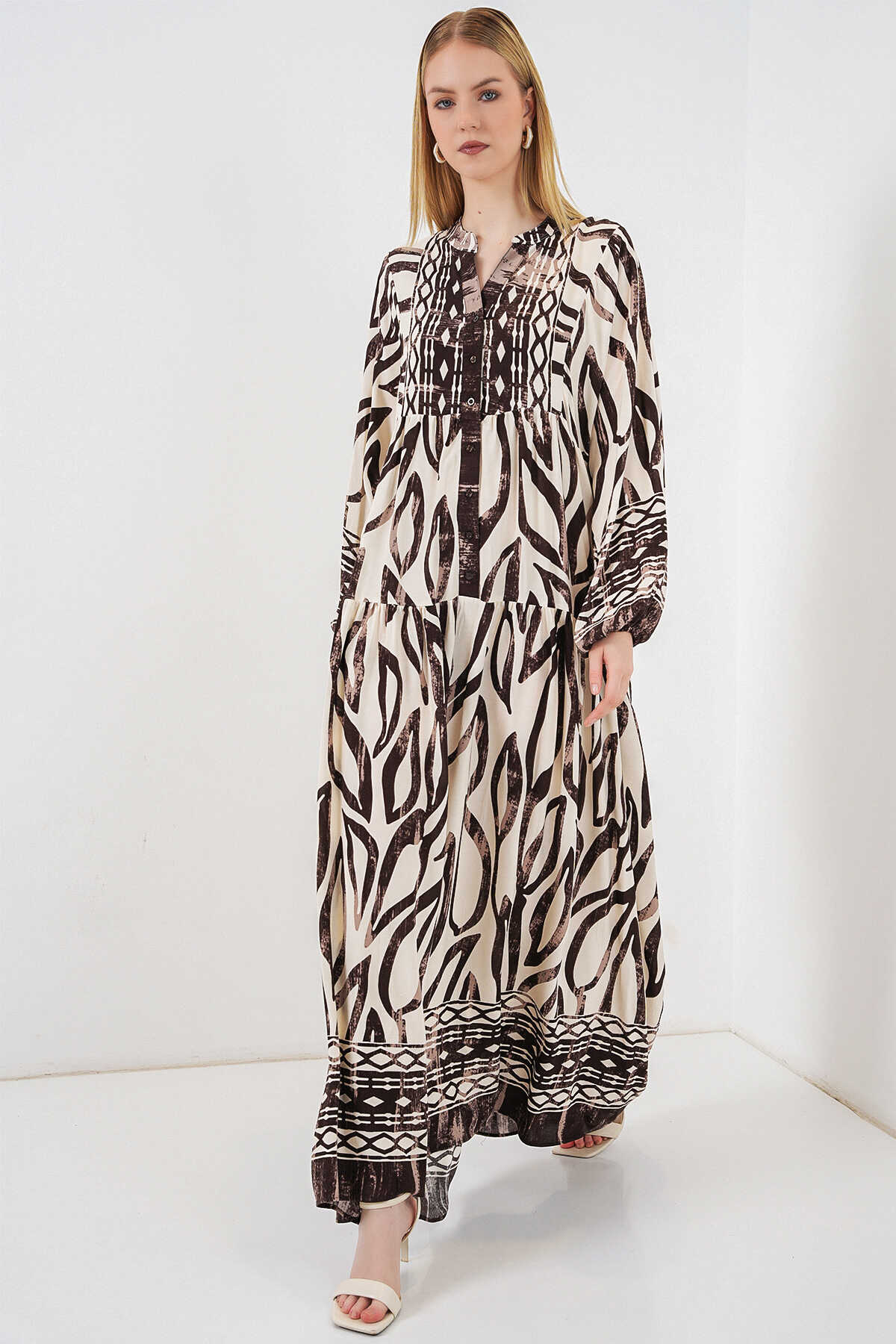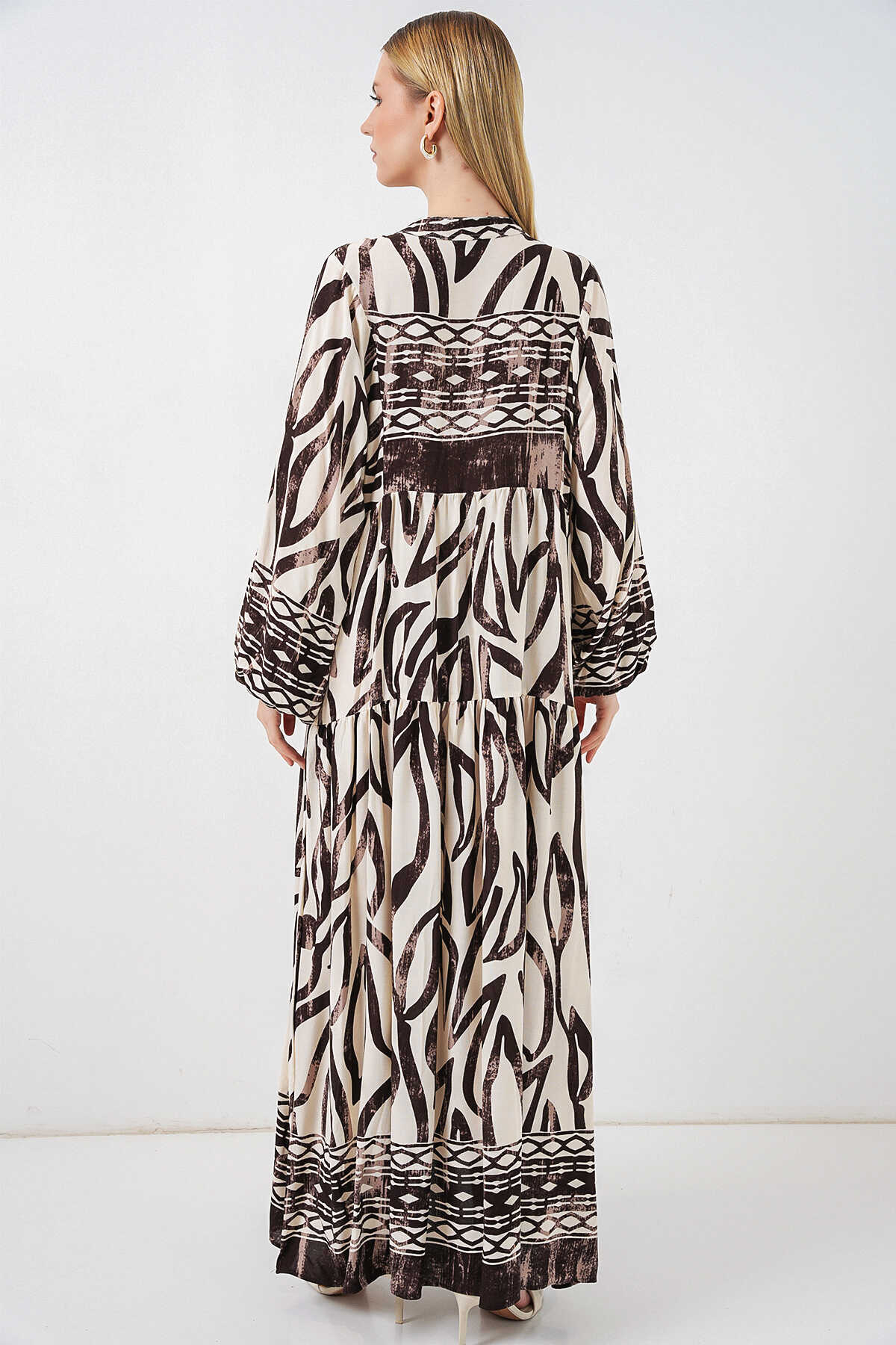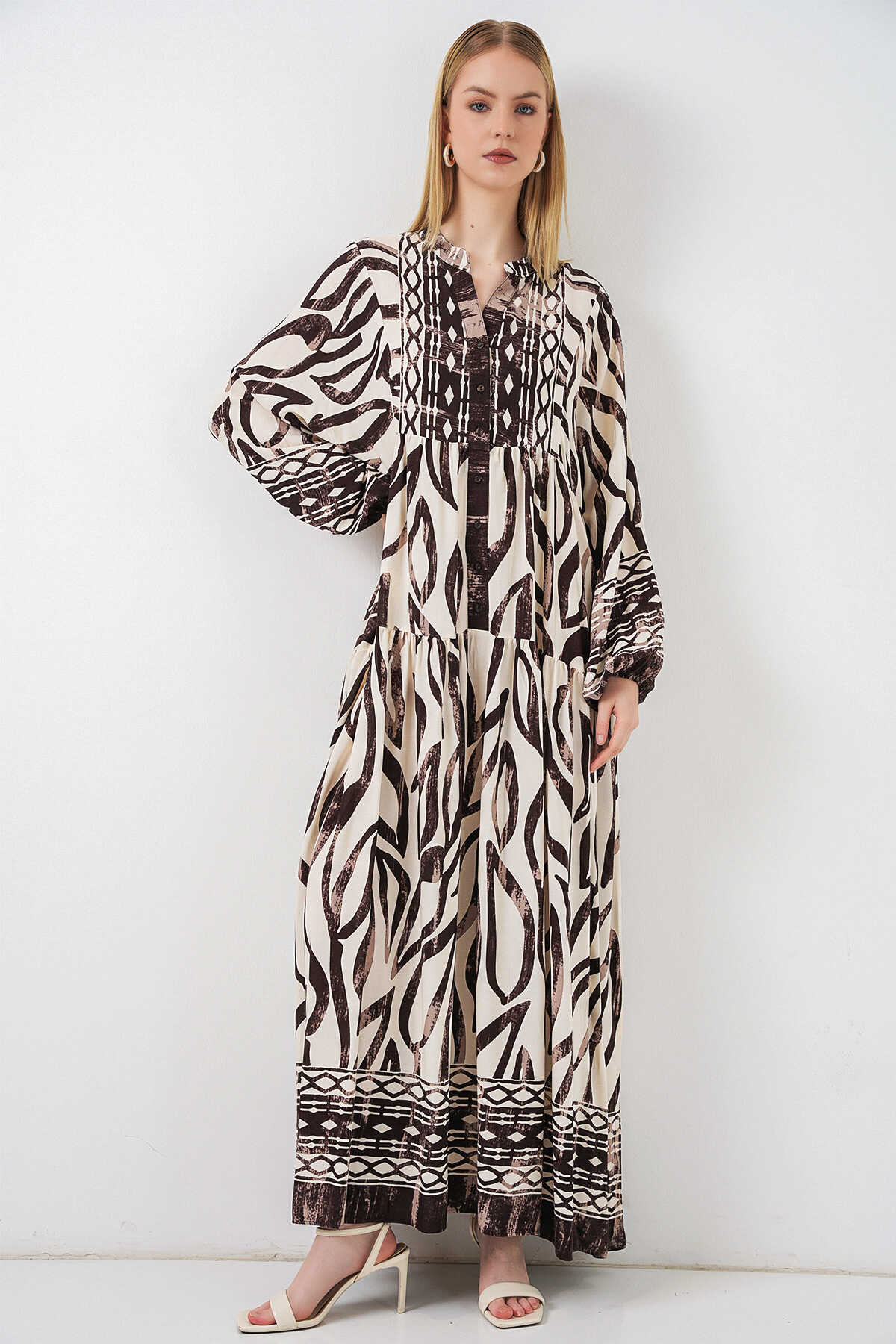Kadın Desenli Uzun Tesettür Elbise 2585 - K. Taba