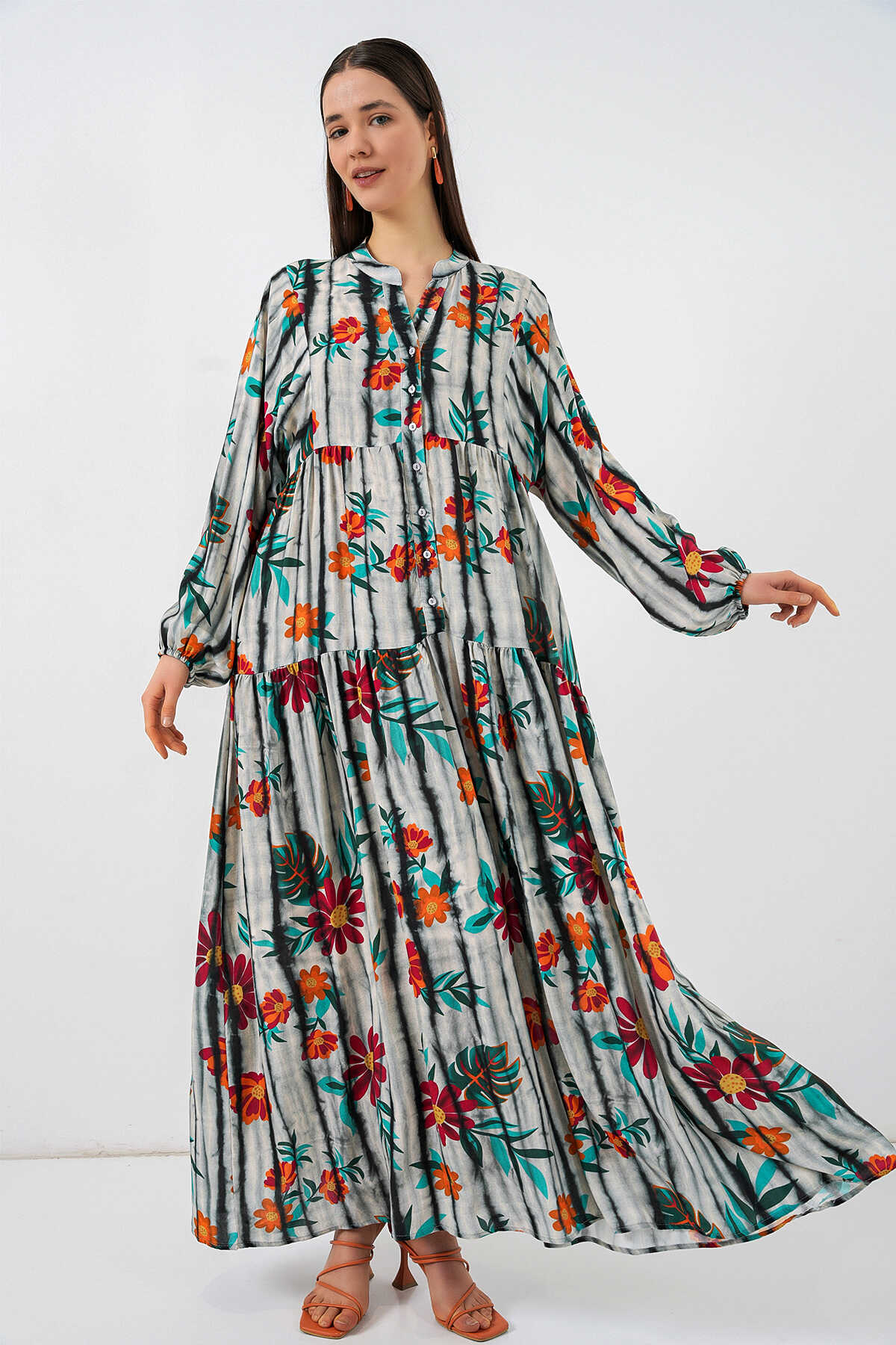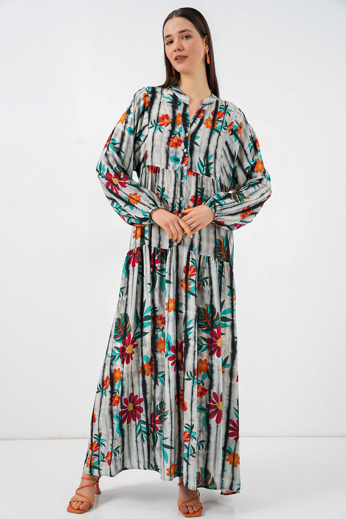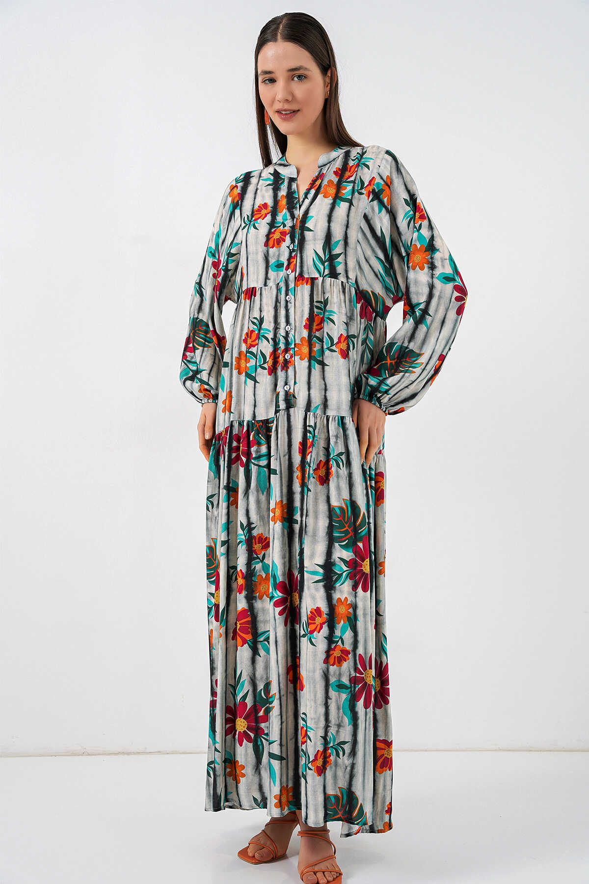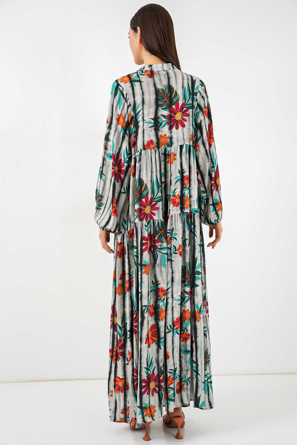 Kadın Desenli Uzun Tesettür Elbise 2585 - K. Antrasit - Kombin