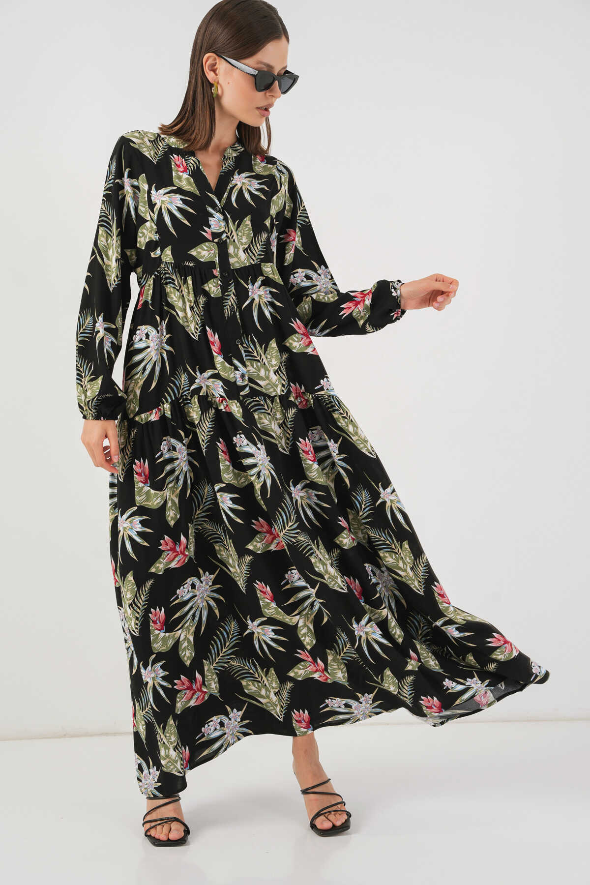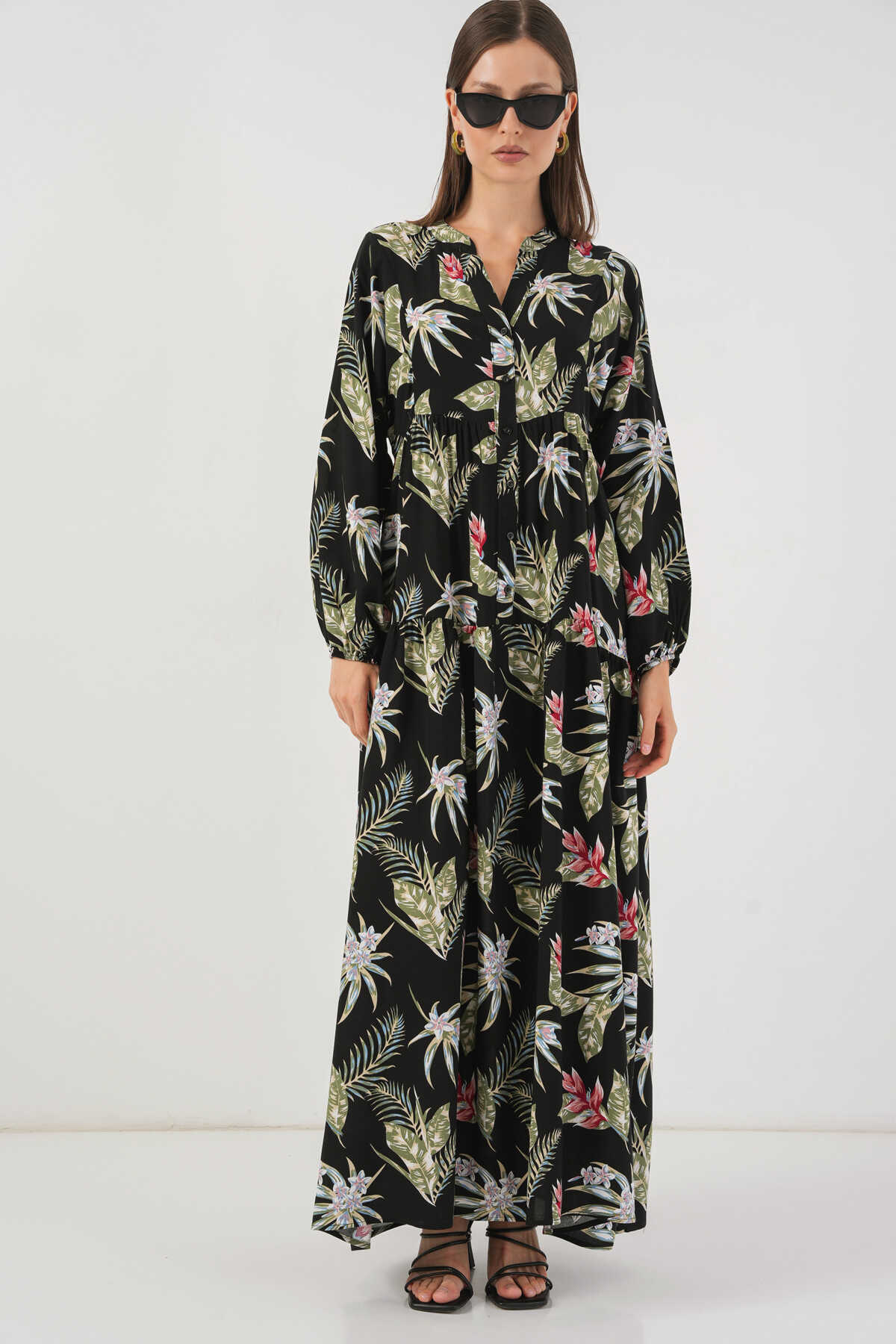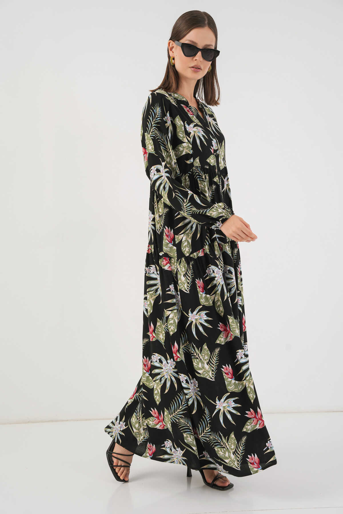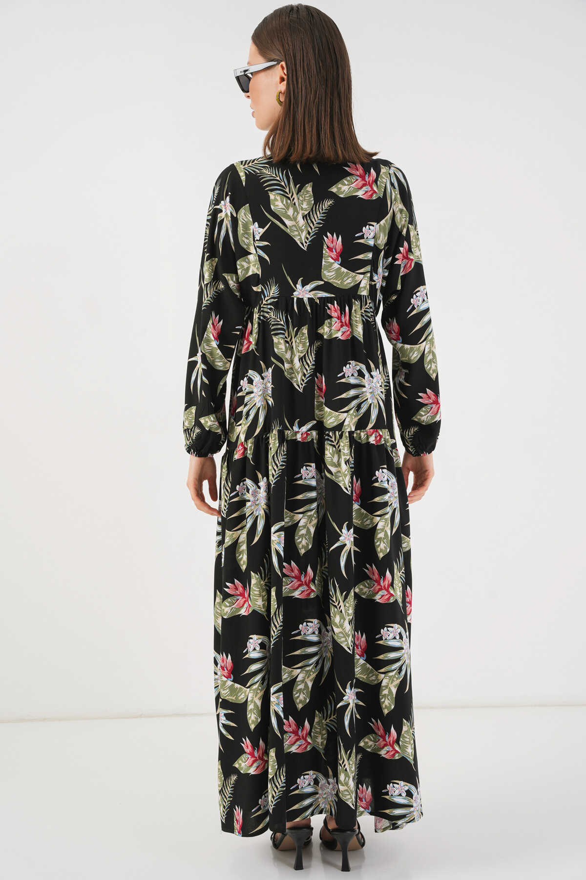 Kadın Desenli Uzun Tesettür Elbise 2585 - K. Siyah - Kombin