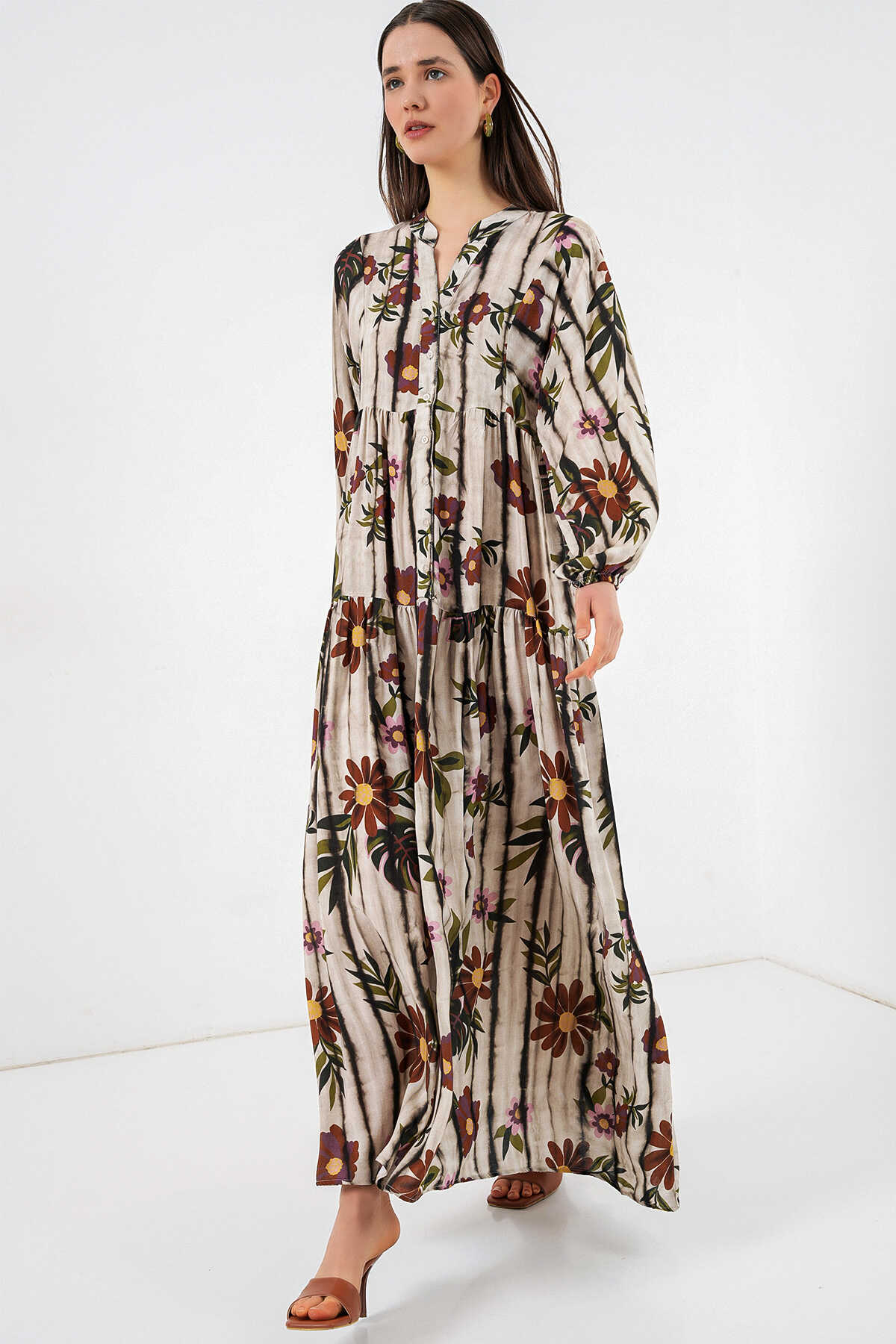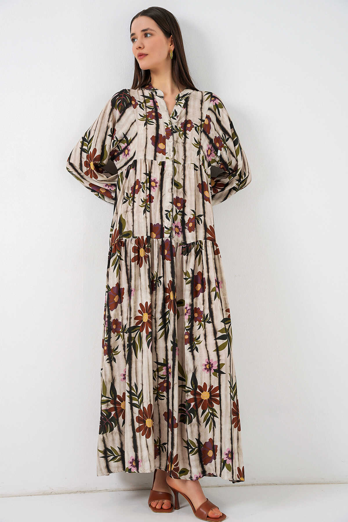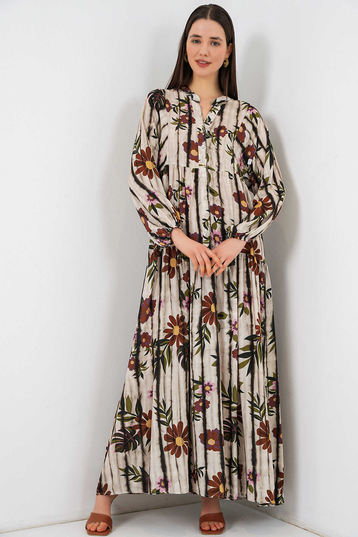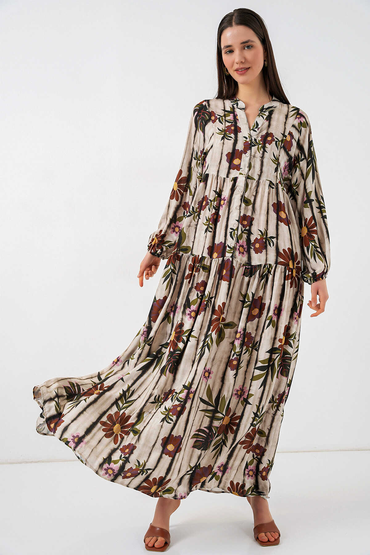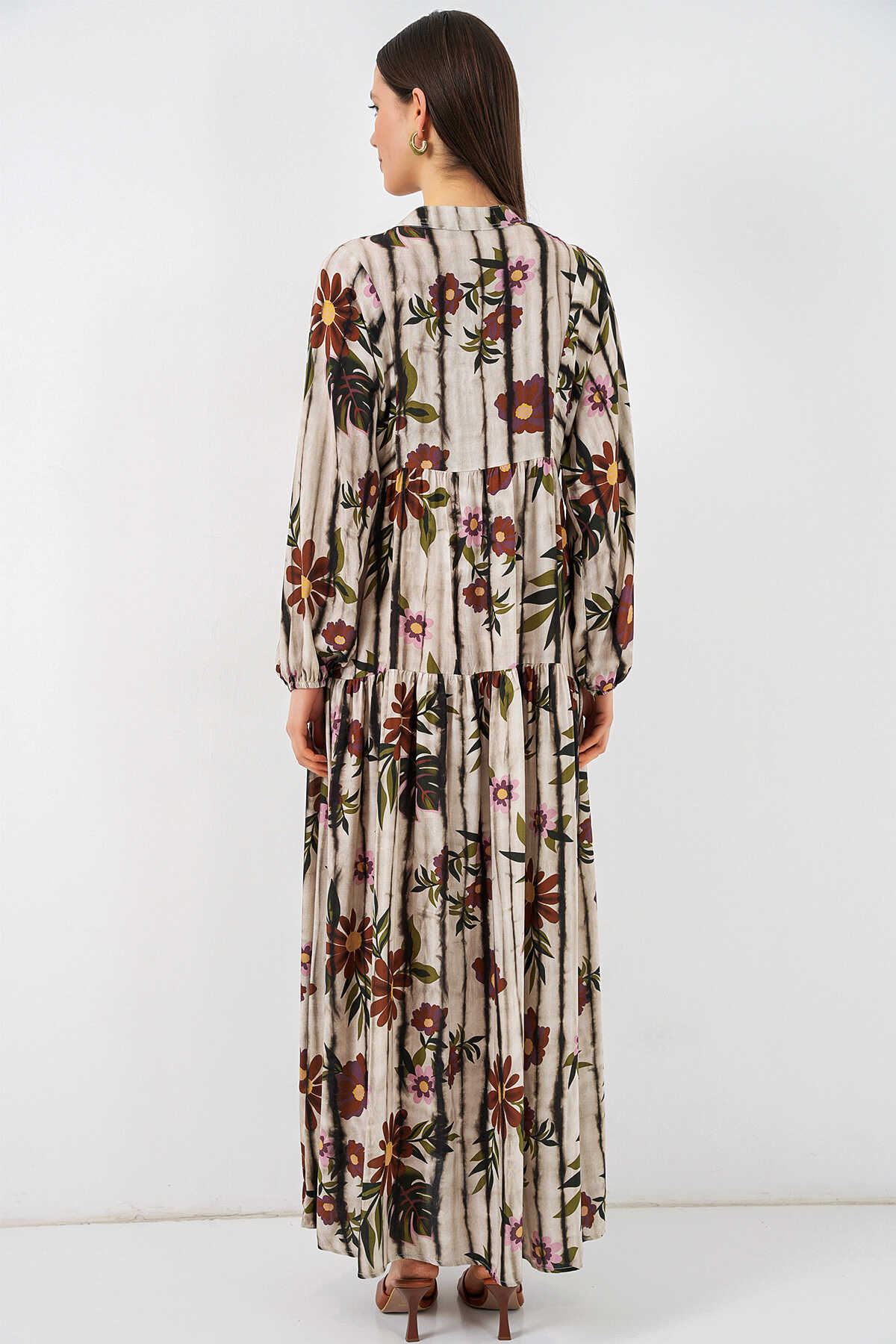 Kadın Desenli Uzun Tesettür Elbise 2585 - Kahve Bej - Kombin