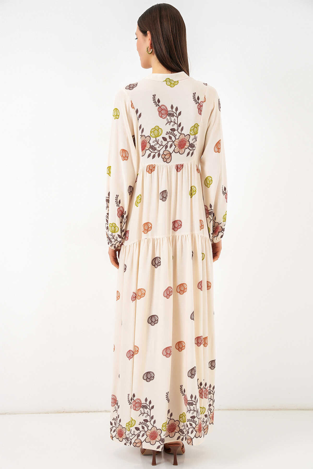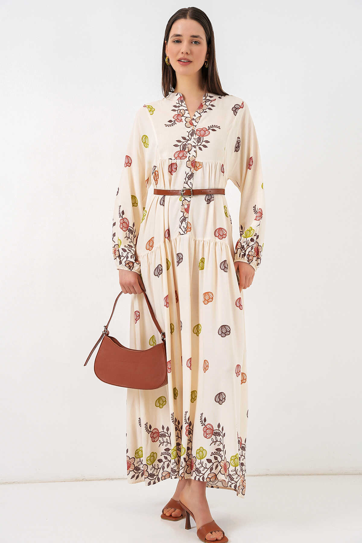 Kadın Desenli Uzun Tesettür Elbise 2585 - Kiremit