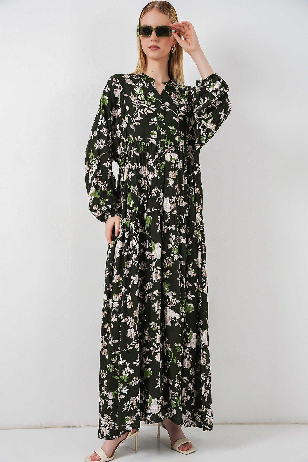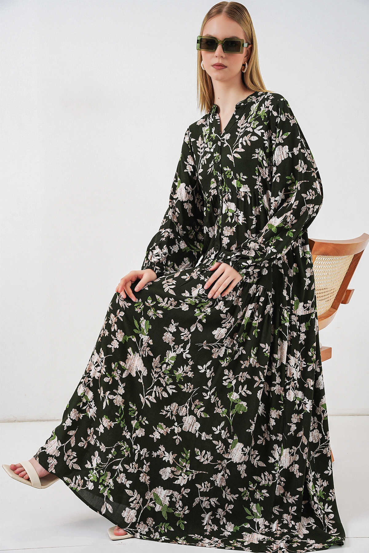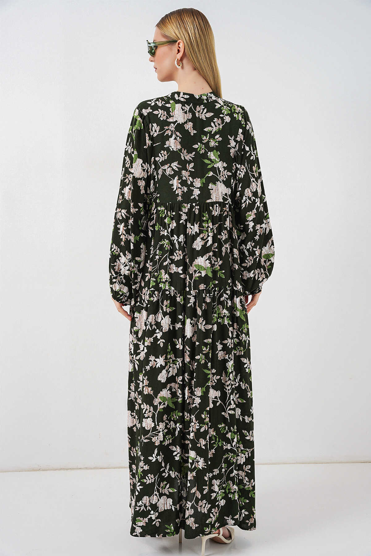 Kadın Desenli Uzun Tesettür Elbise 2585 - Koyu Haki - Kombin