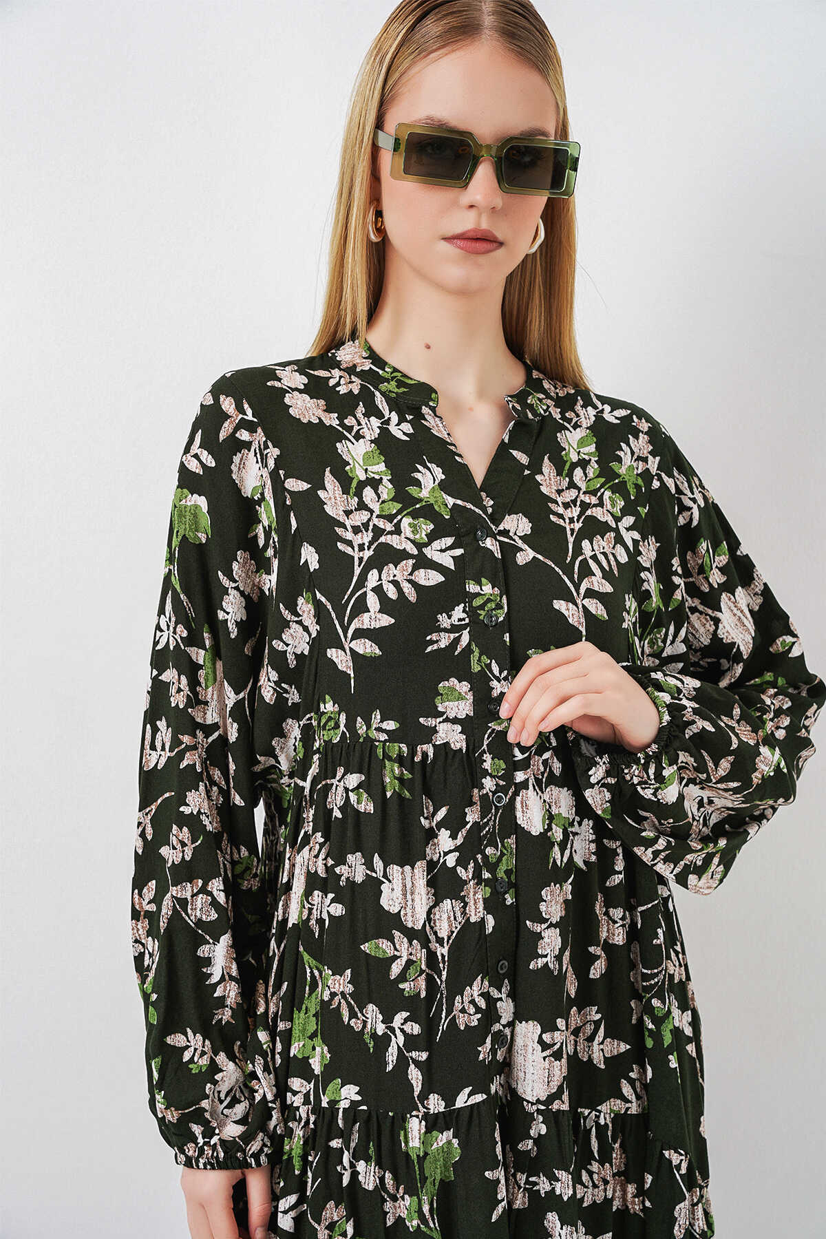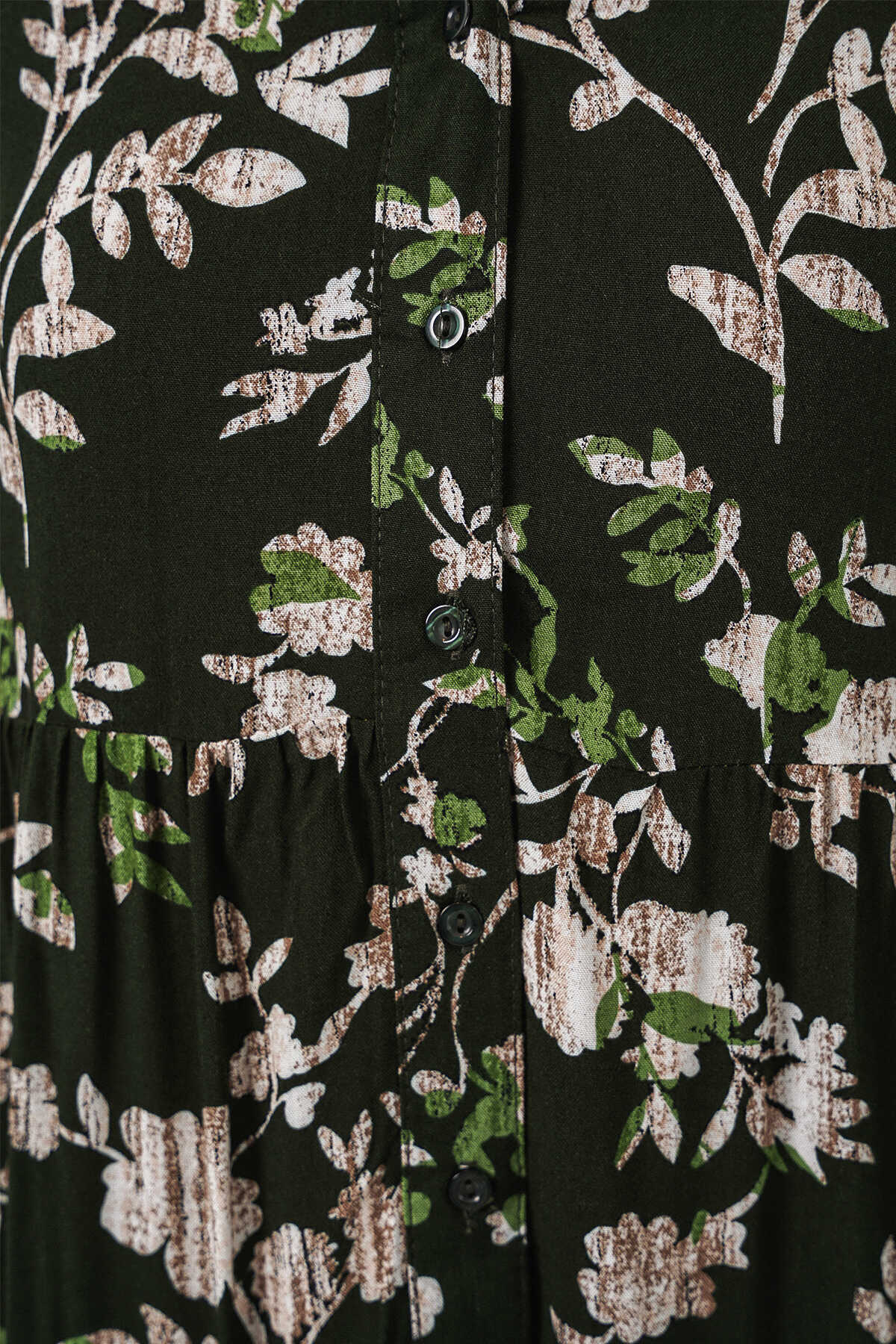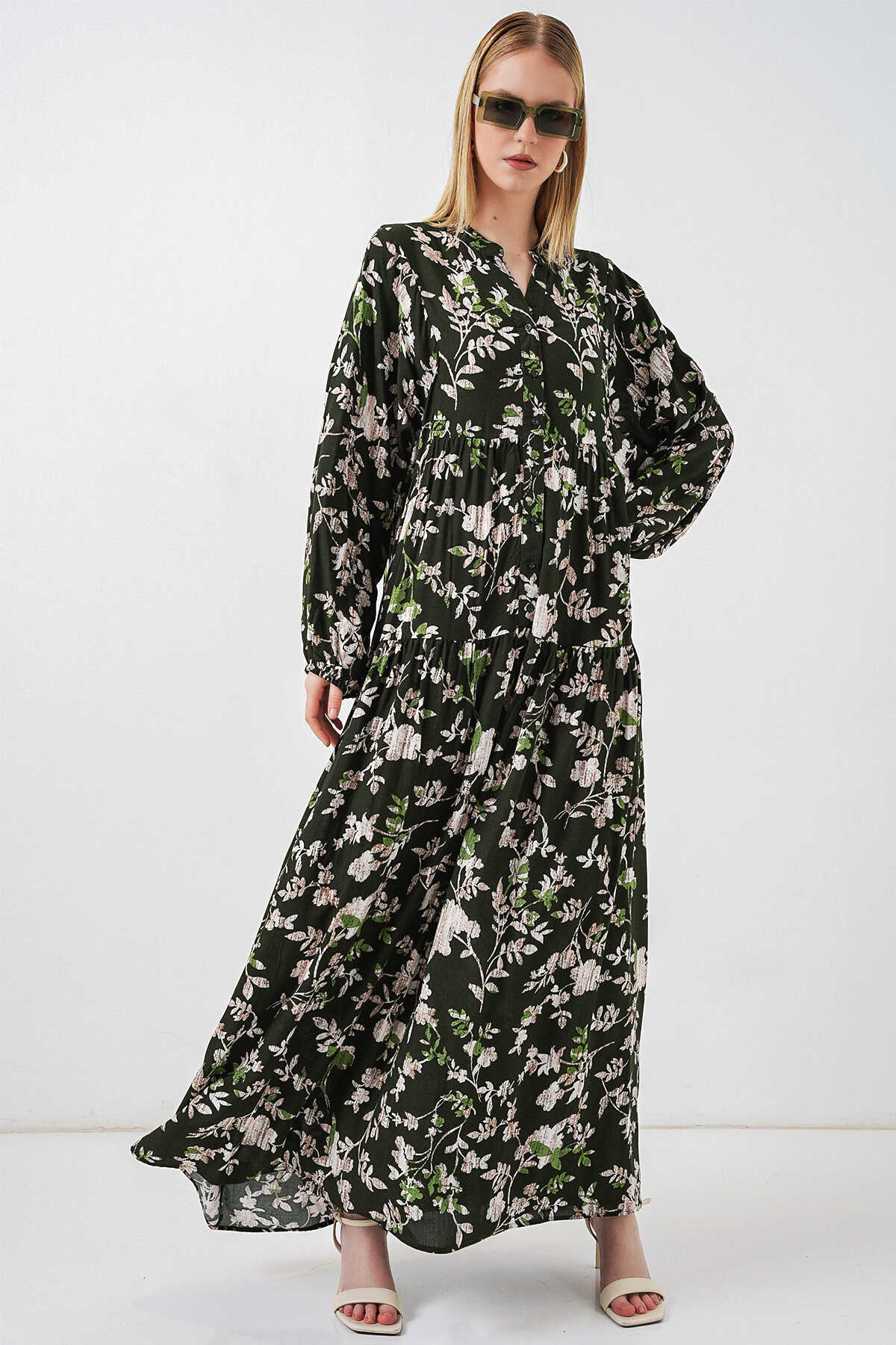 Kadın Desenli Uzun Tesettür Elbise 2585 - Koyu Haki - Kombin