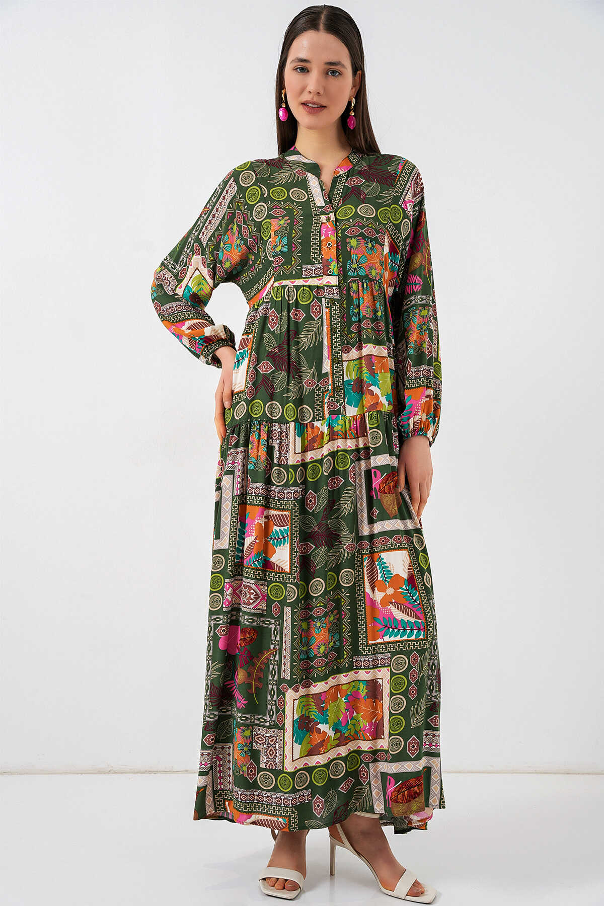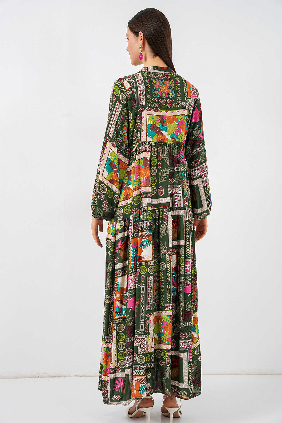 Kadın Desenli Uzun Tesettür Elbise 2585 - Koyu Yeşill - Kombin