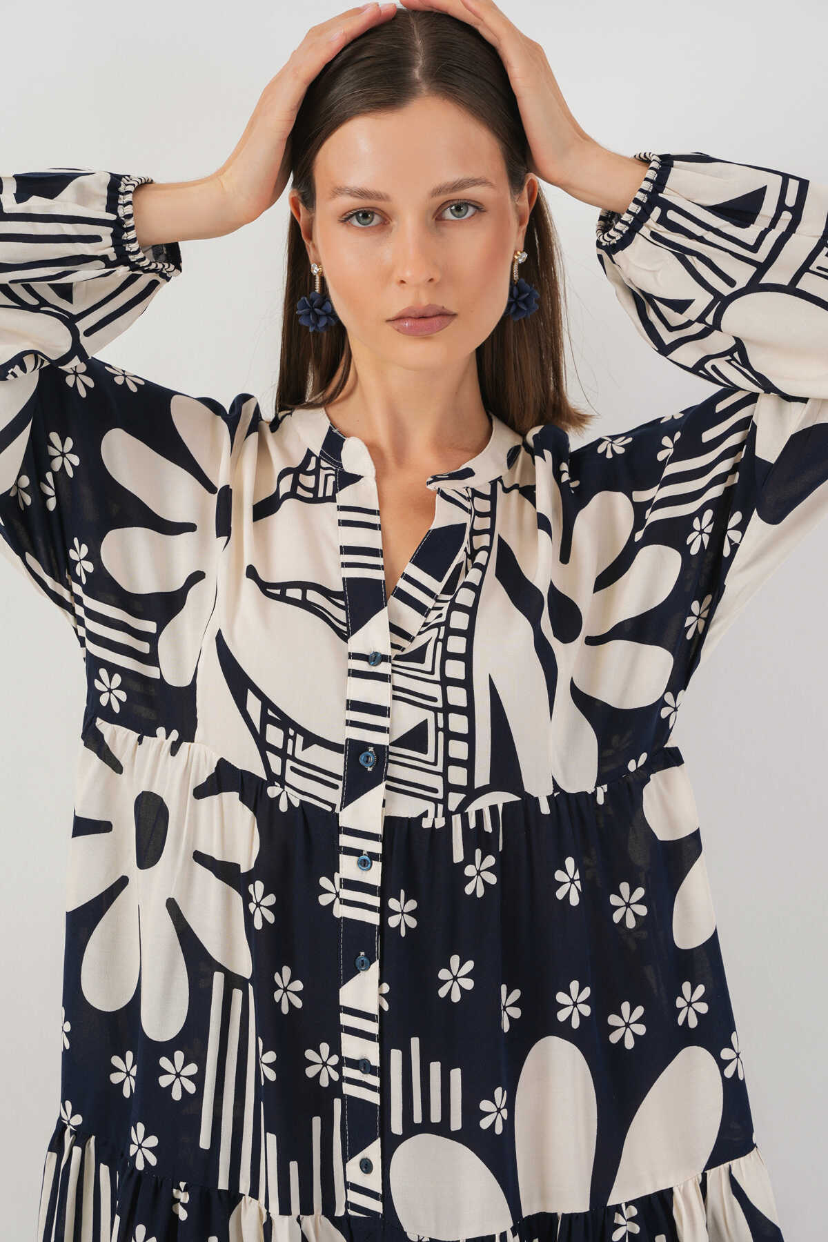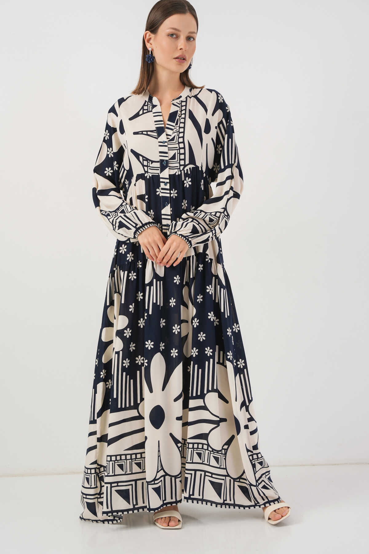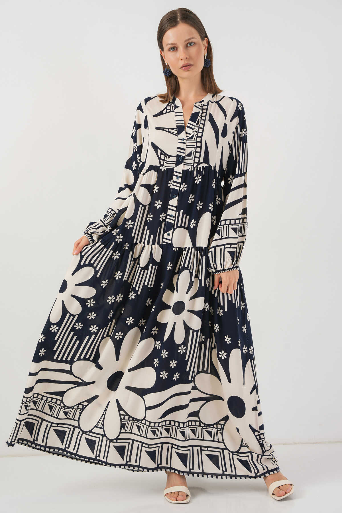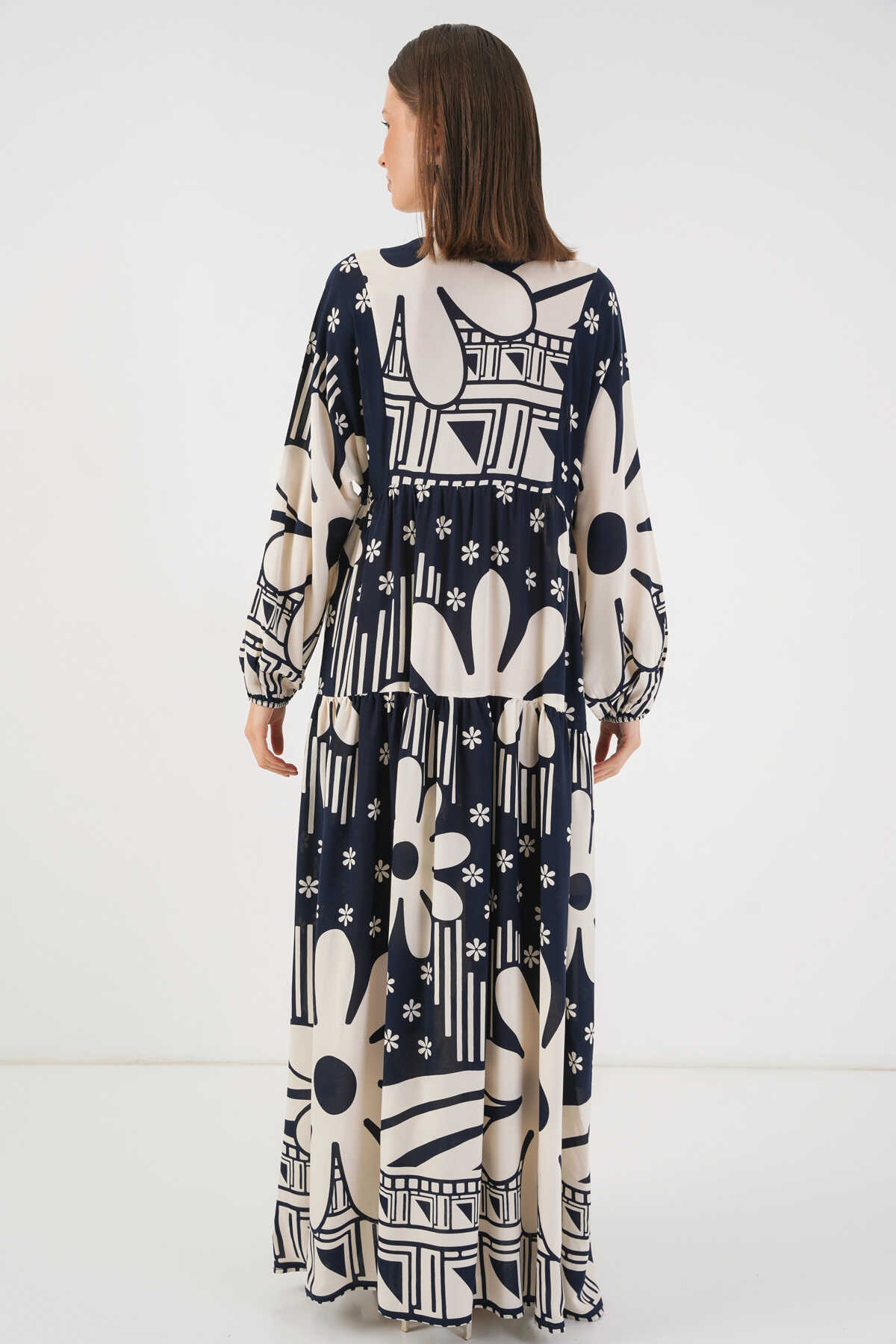 Kadın Desenli Uzun Tesettür Elbise 2585 - L. Lacivert