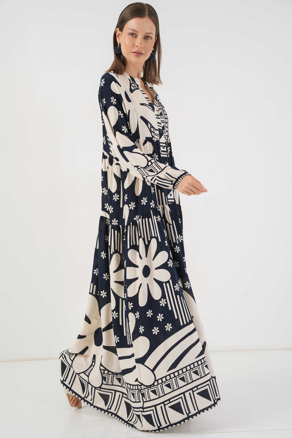 Kadın Desenli Uzun Tesettür Elbise 2585 - L. Lacivert - Kombin