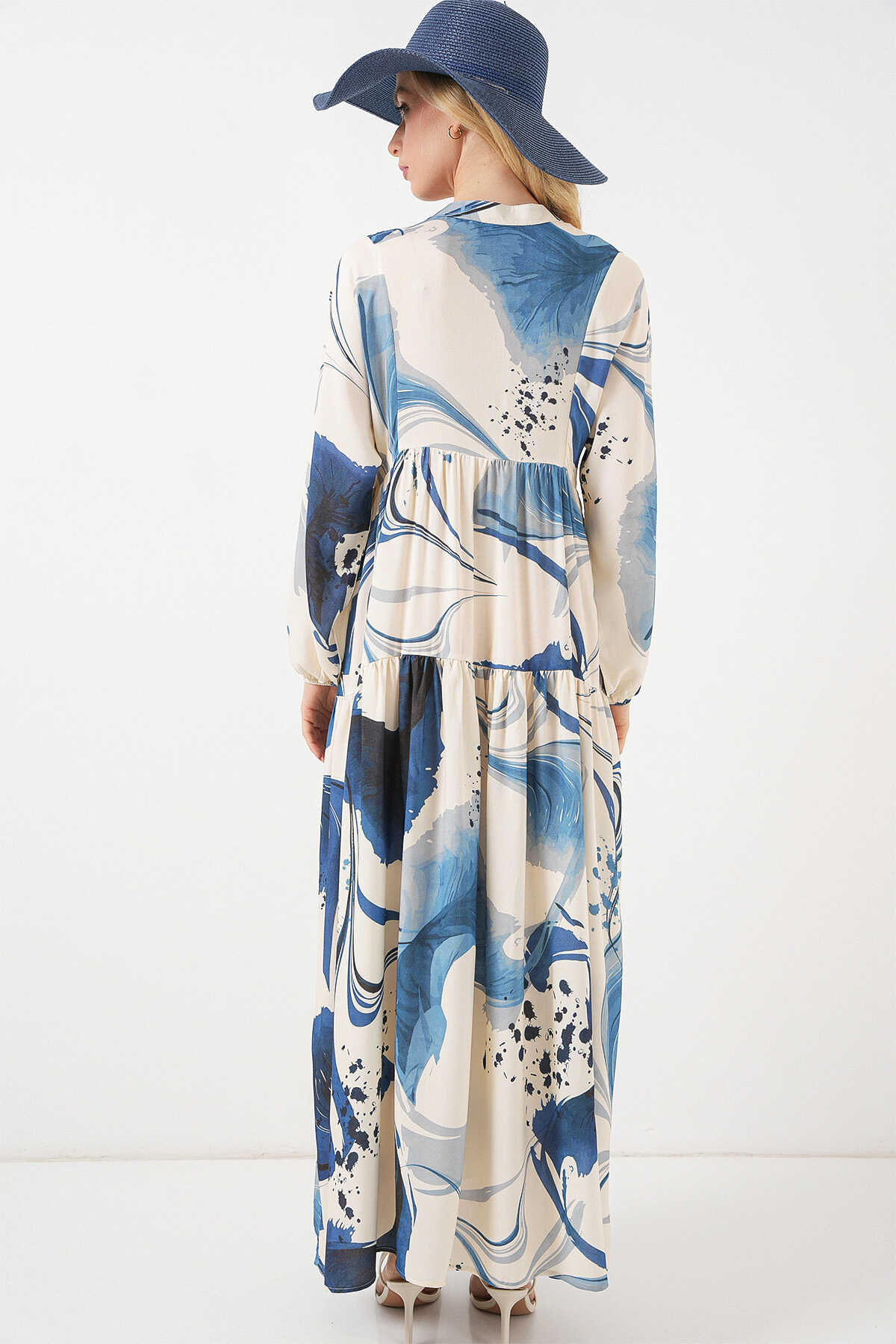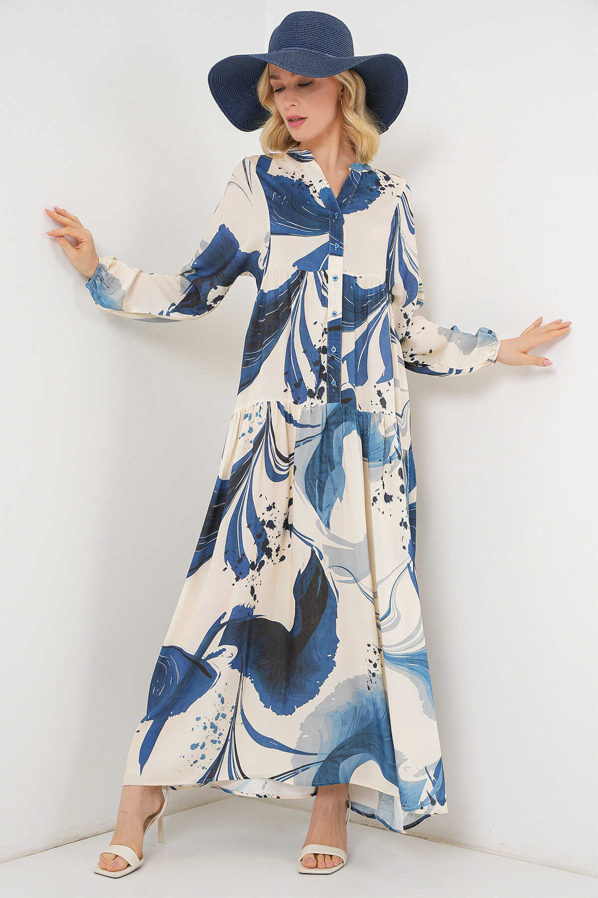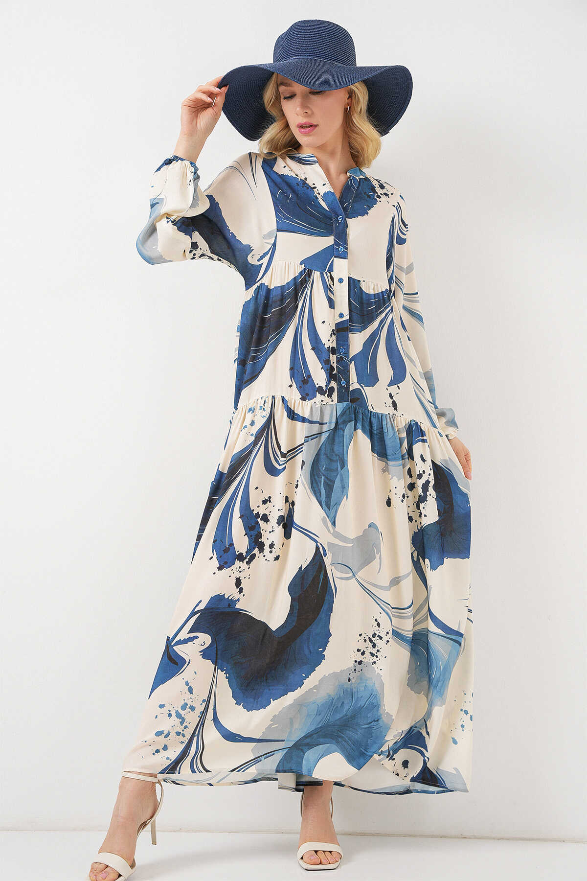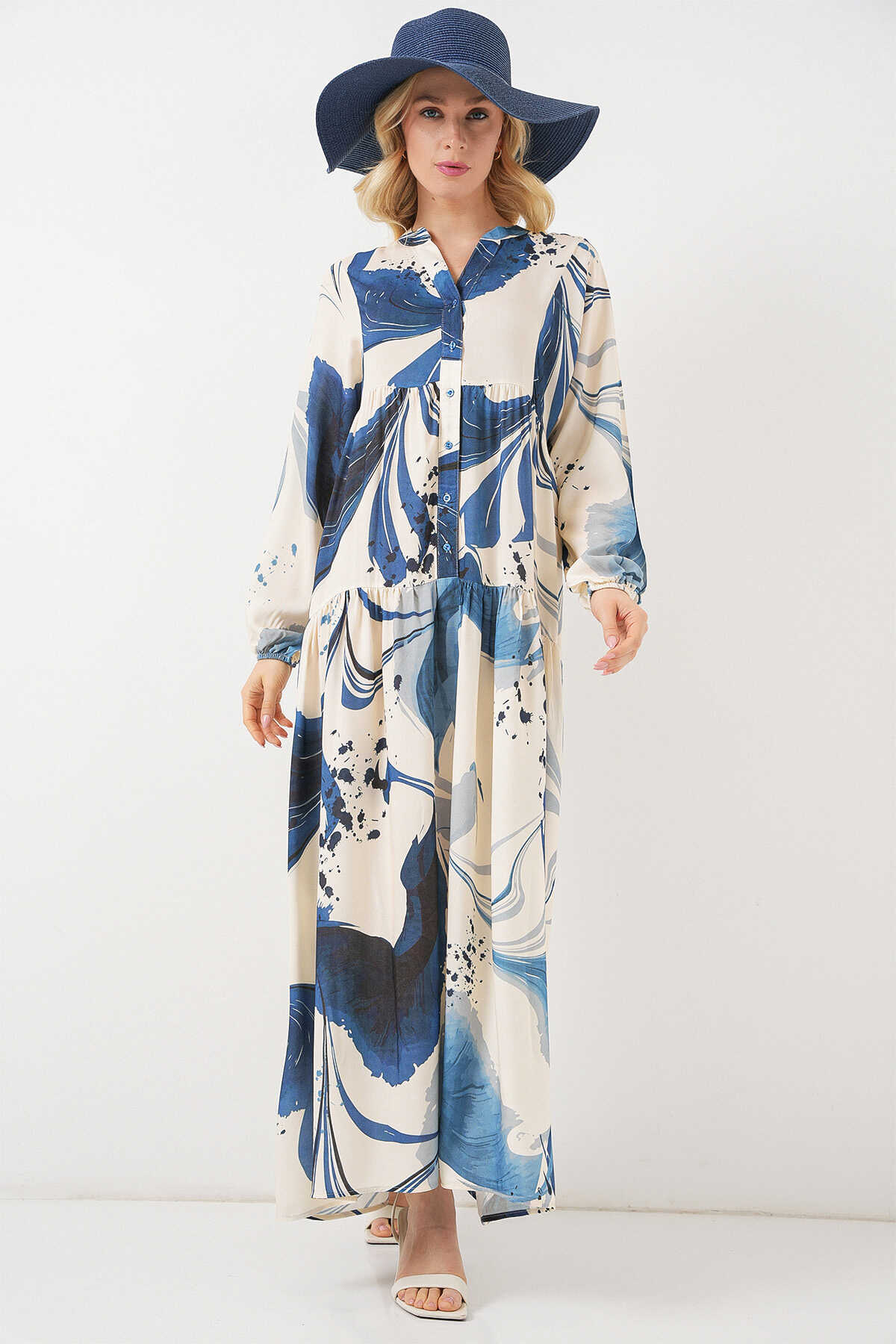 Kadın Desenli Uzun Tesettür Elbise 2585 - Lacivert - Kombin