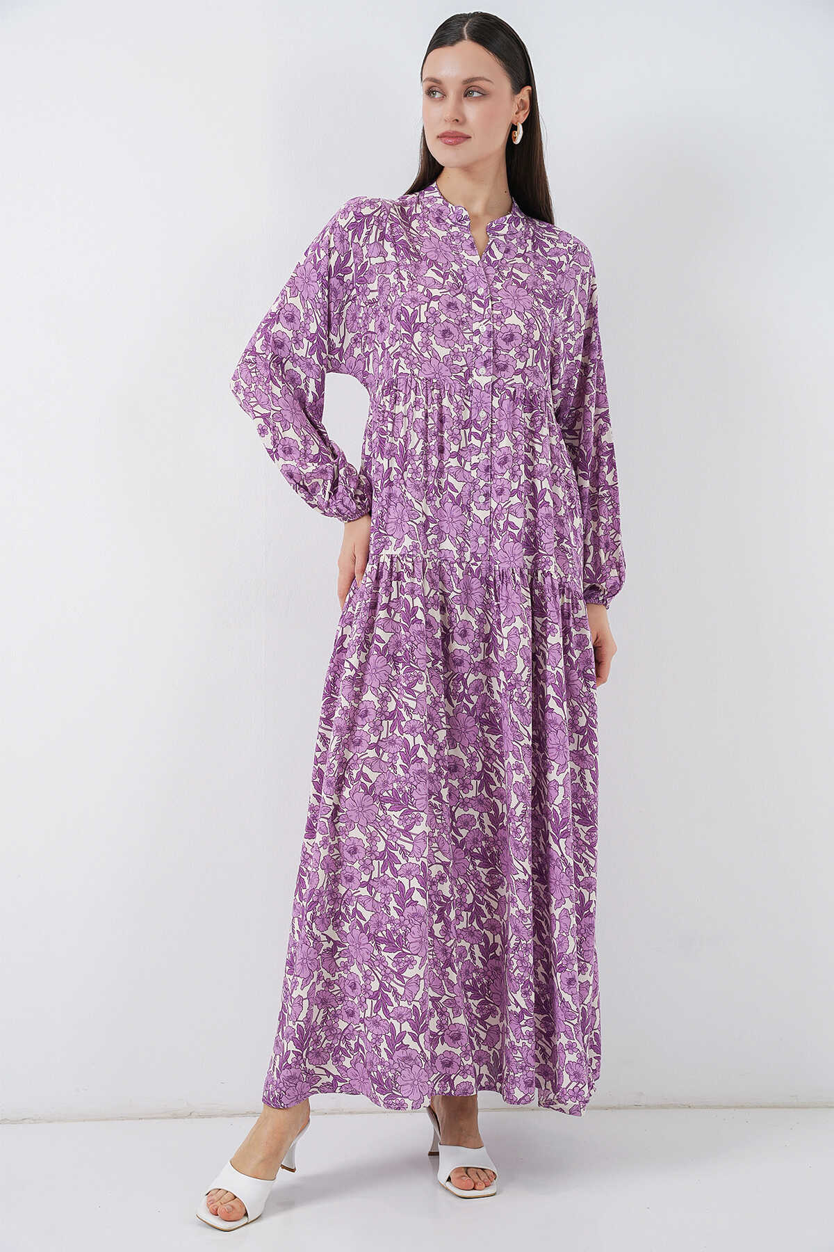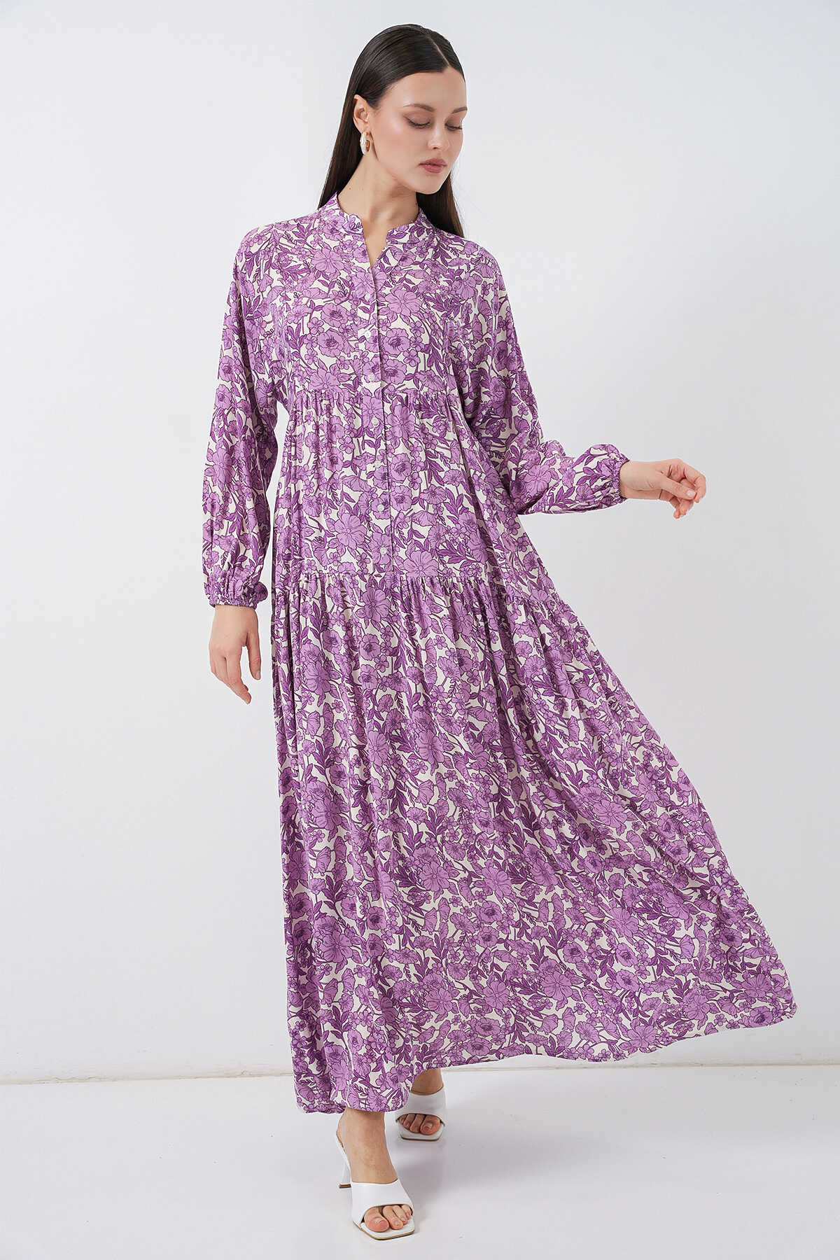 Kadın Desenli Uzun Tesettür Elbise 2585 - Lila - Kombin