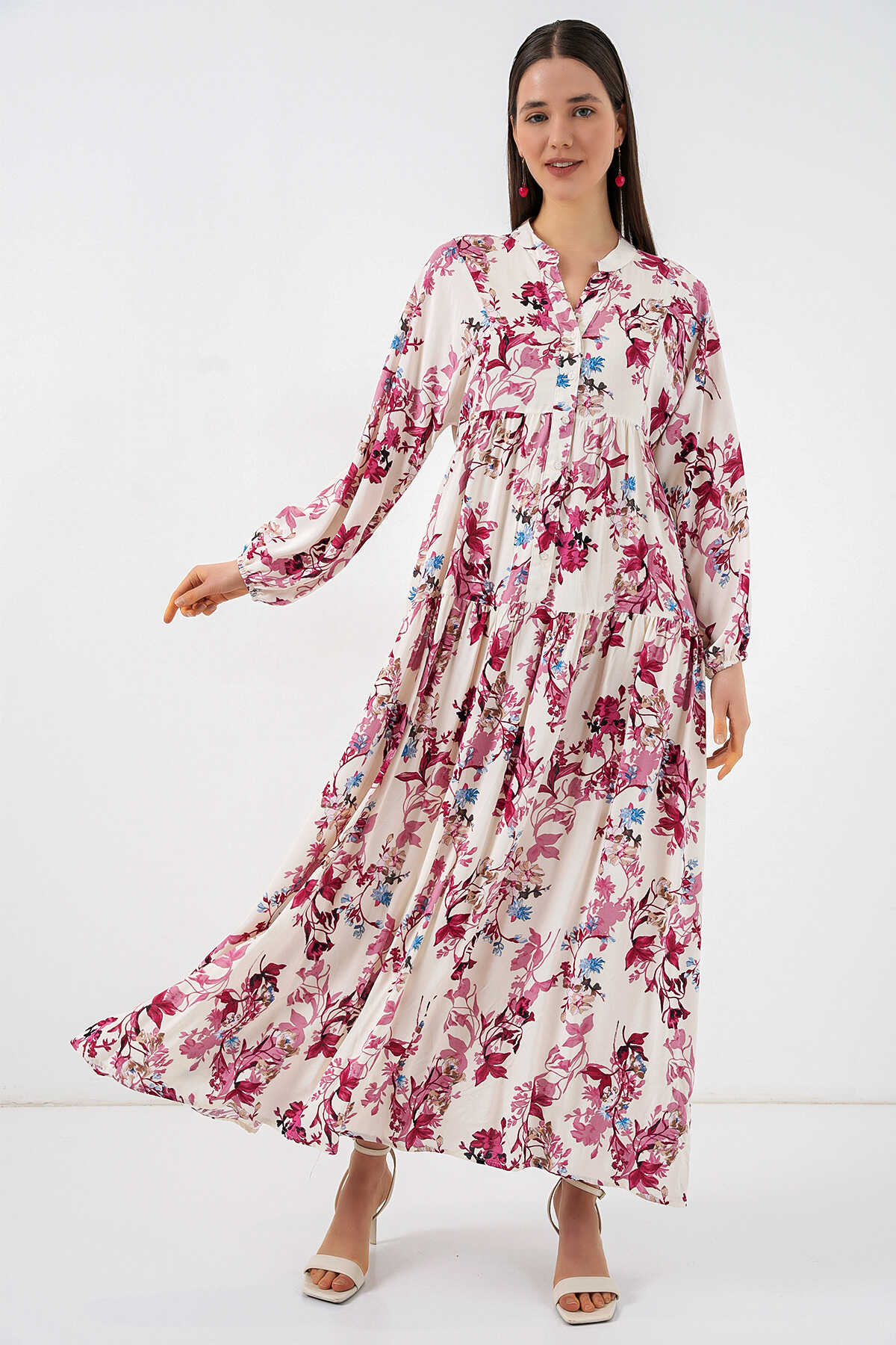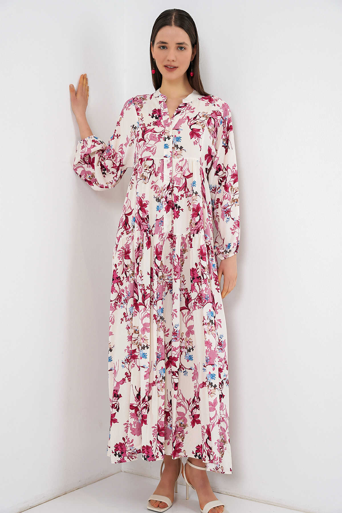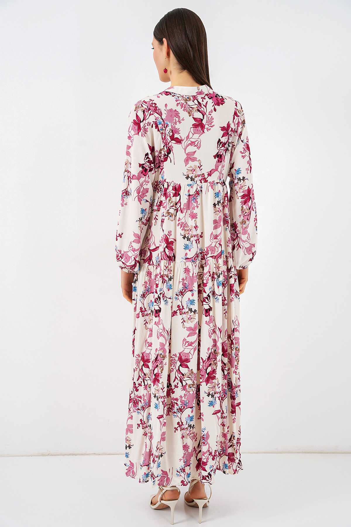Kadın Desenli Uzun Tesettür Elbise 2585 - M. Kırmızı