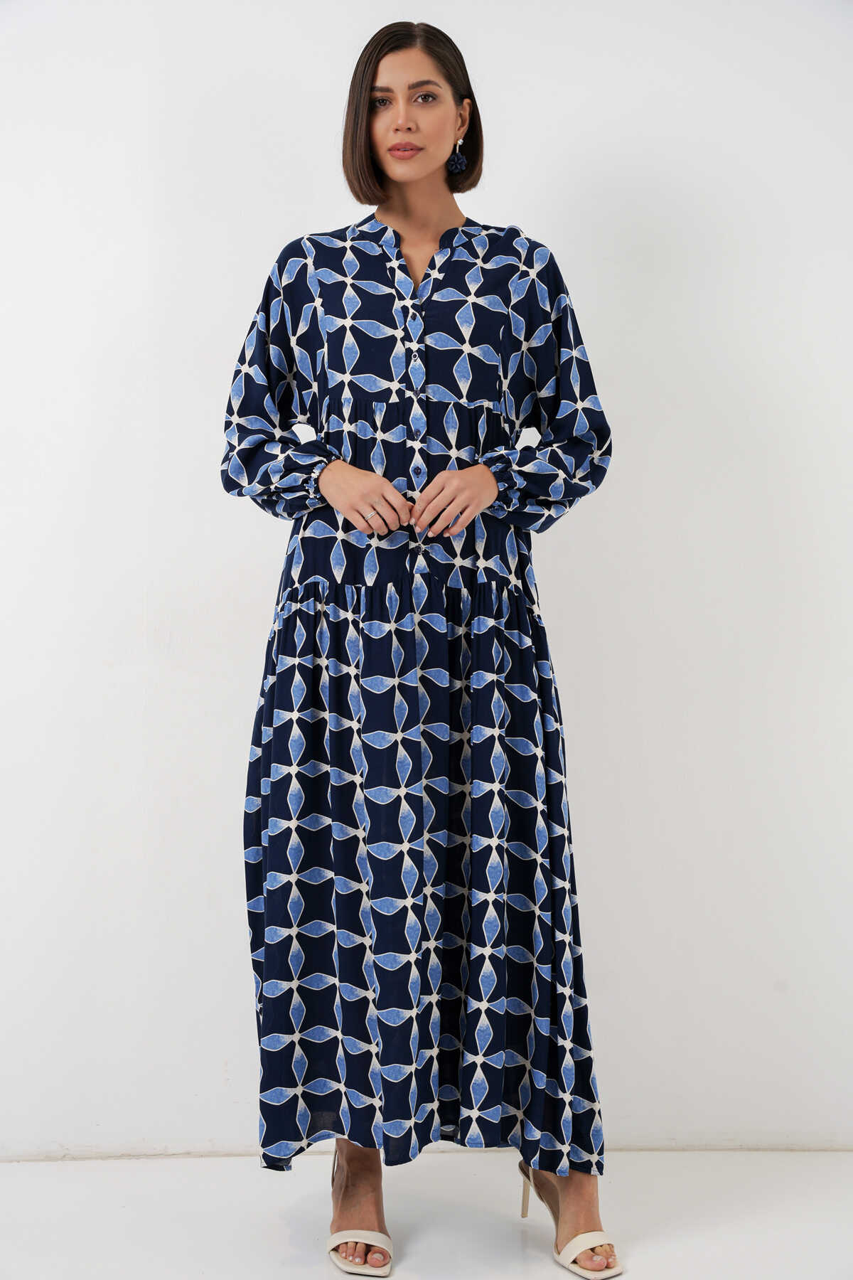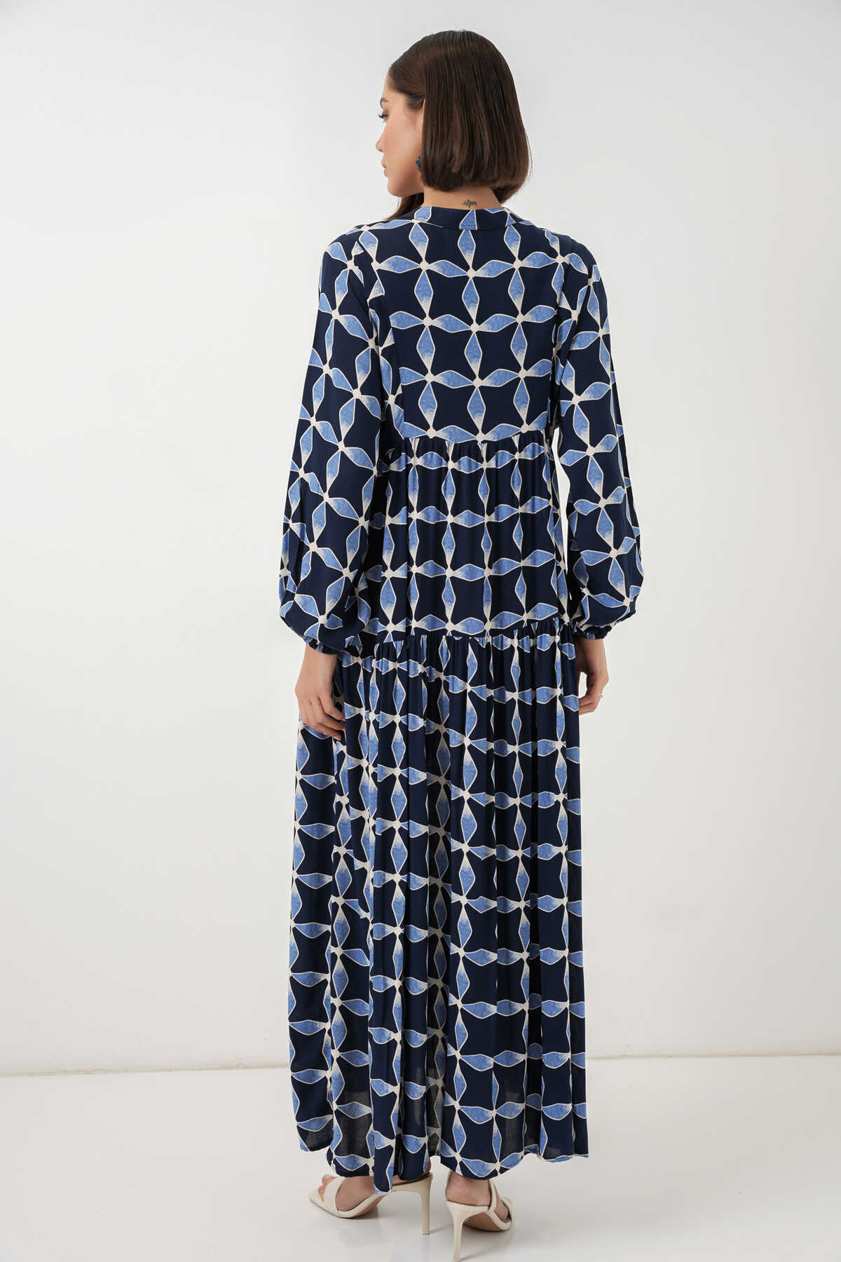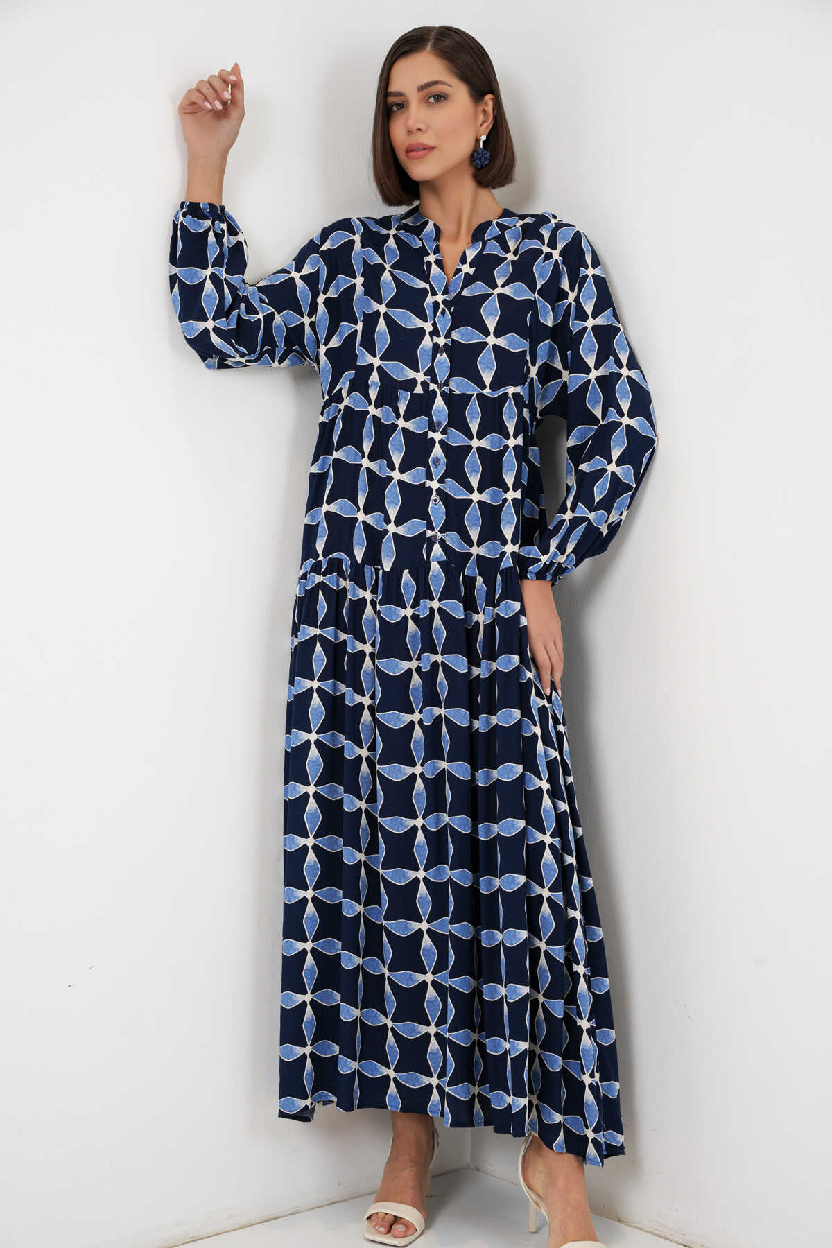 Kadın Desenli Uzun Tesettür Elbise 2585 - M. Lacivert