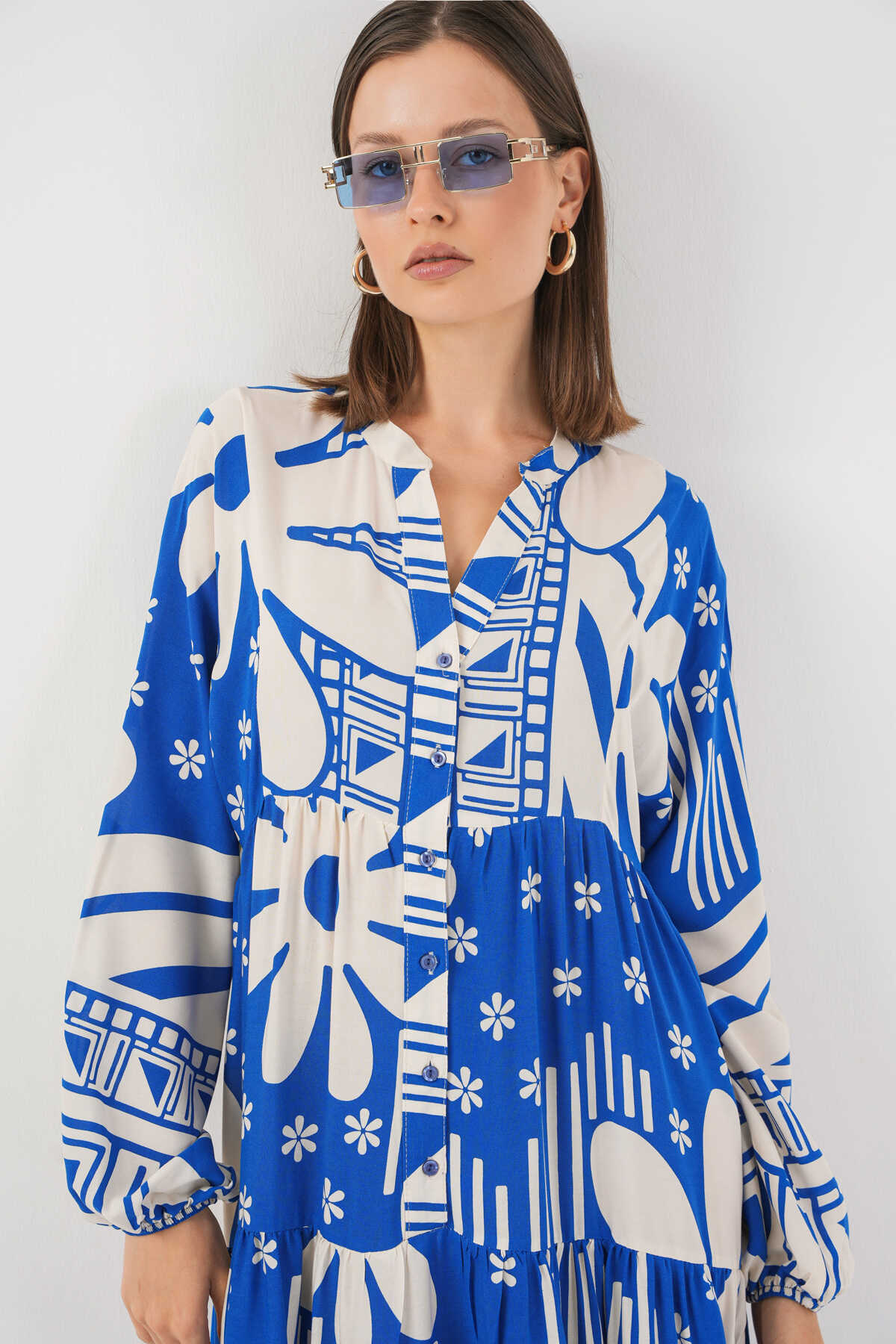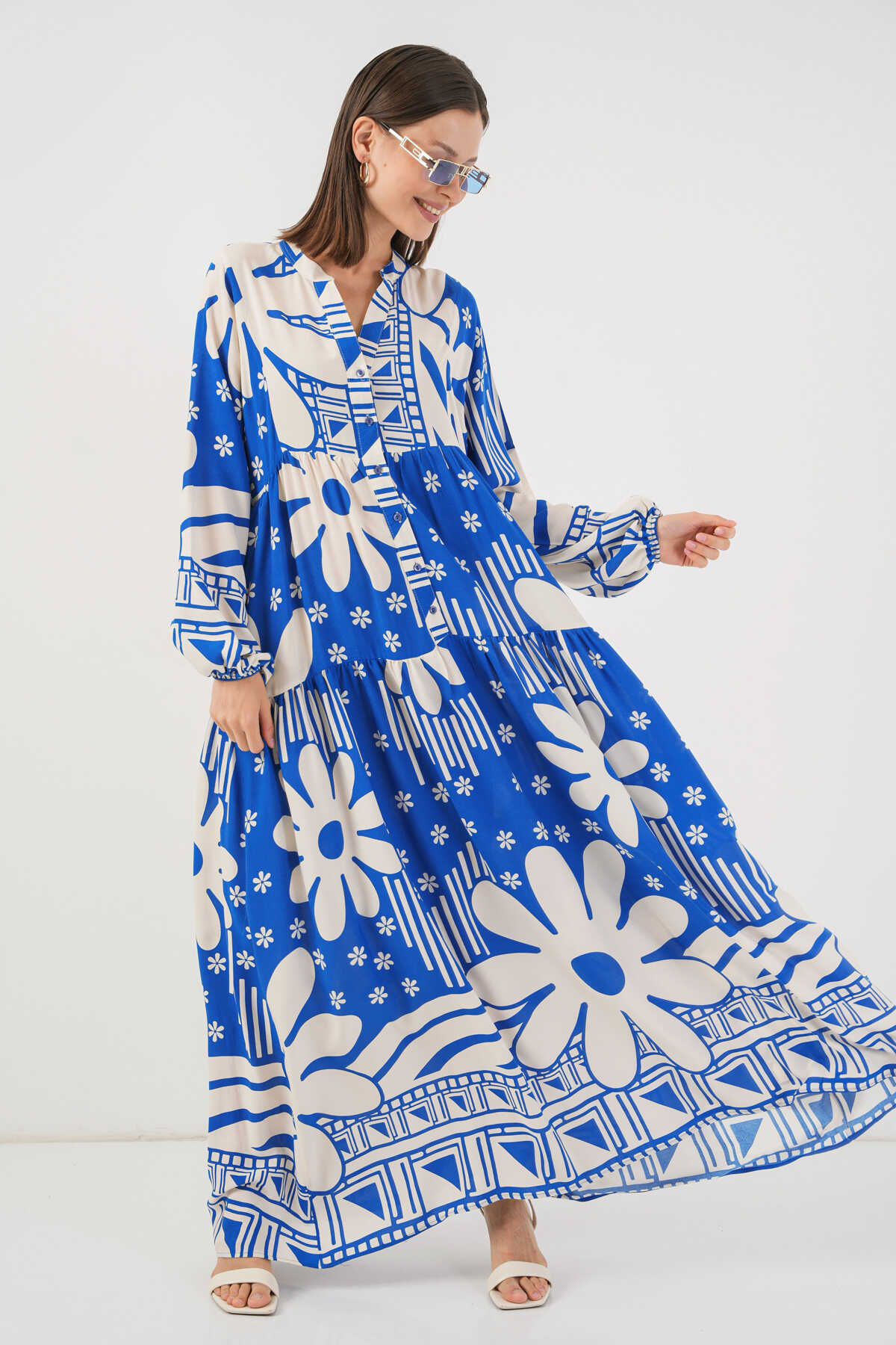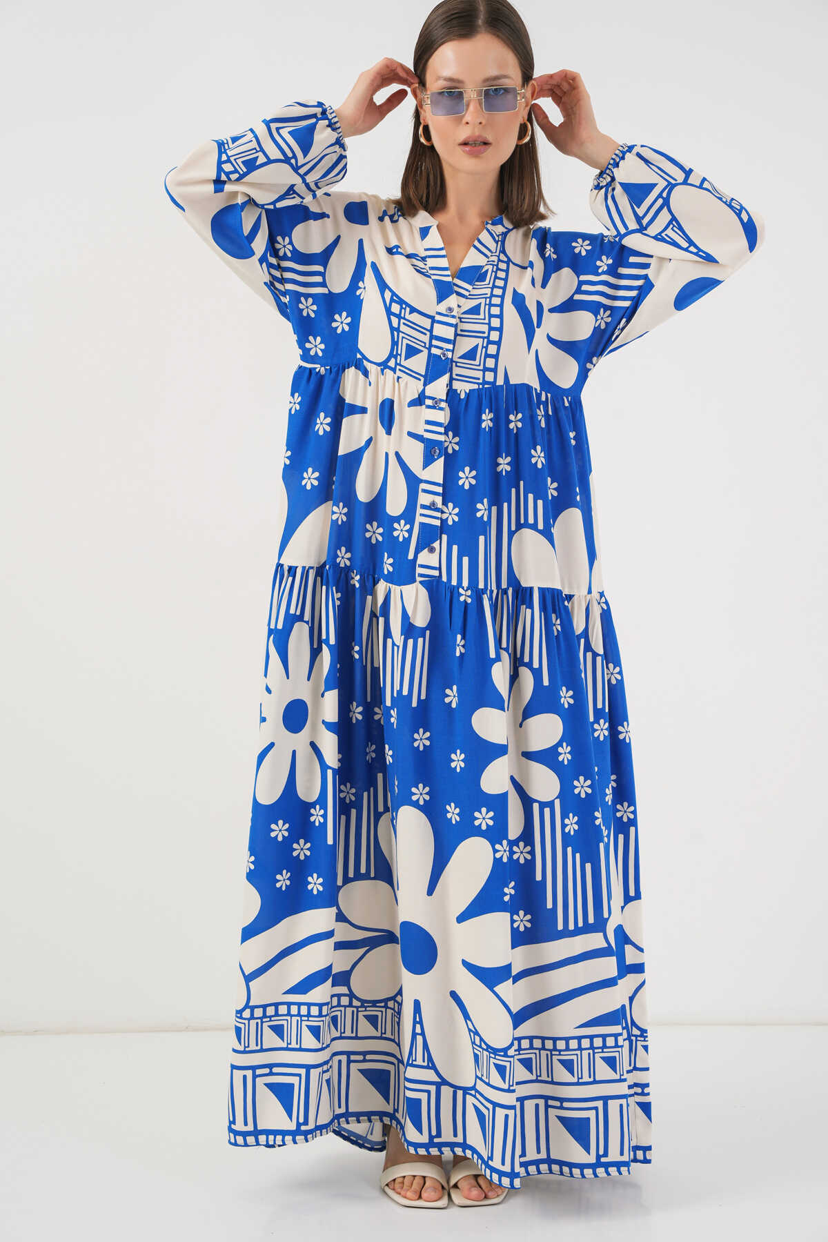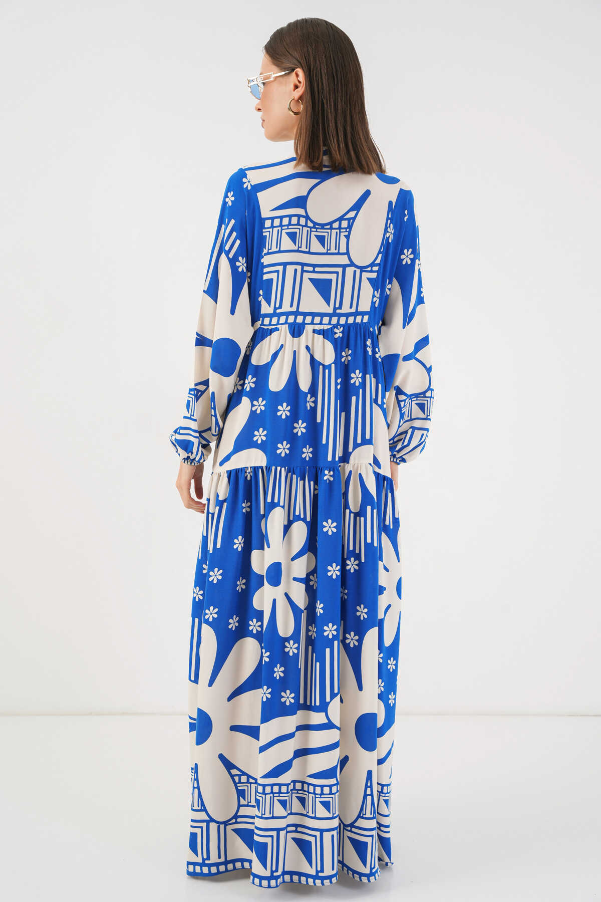 Kadın Desenli Uzun Tesettür Elbise 2585 - Mavi