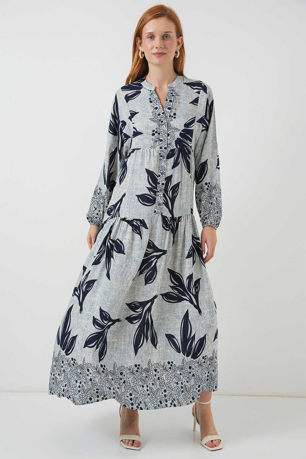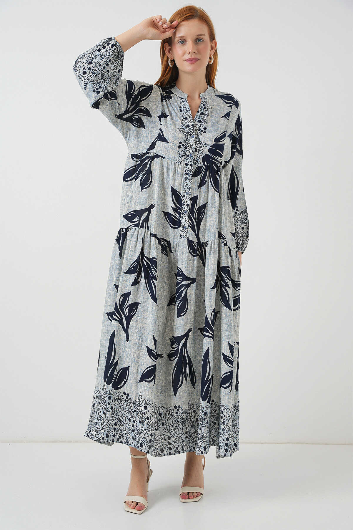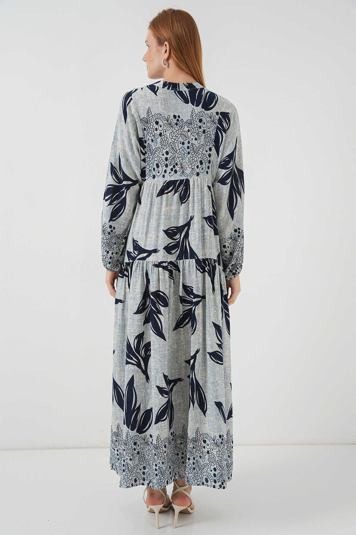Kadın Desenli Uzun Tesettür Elbise 2585 - Mavi - Lacivert