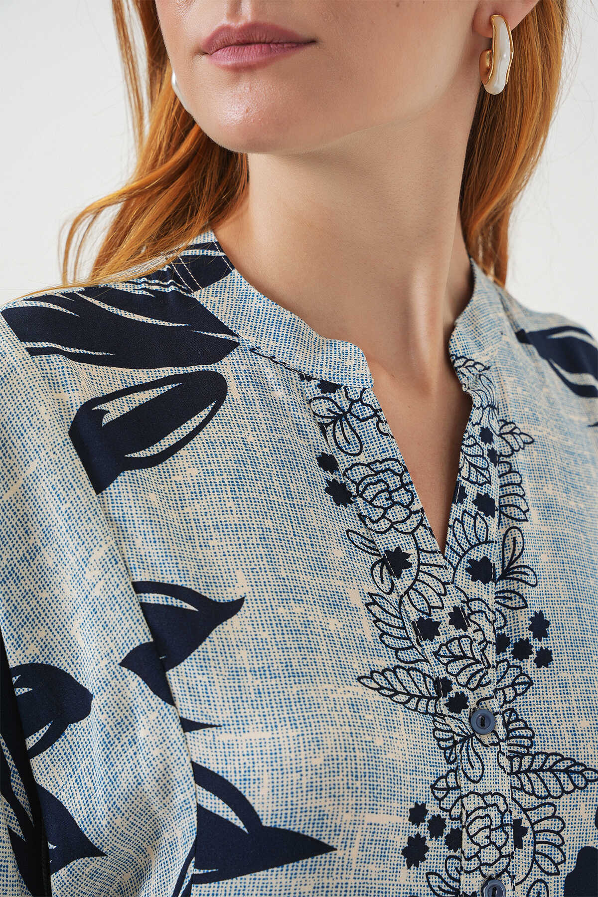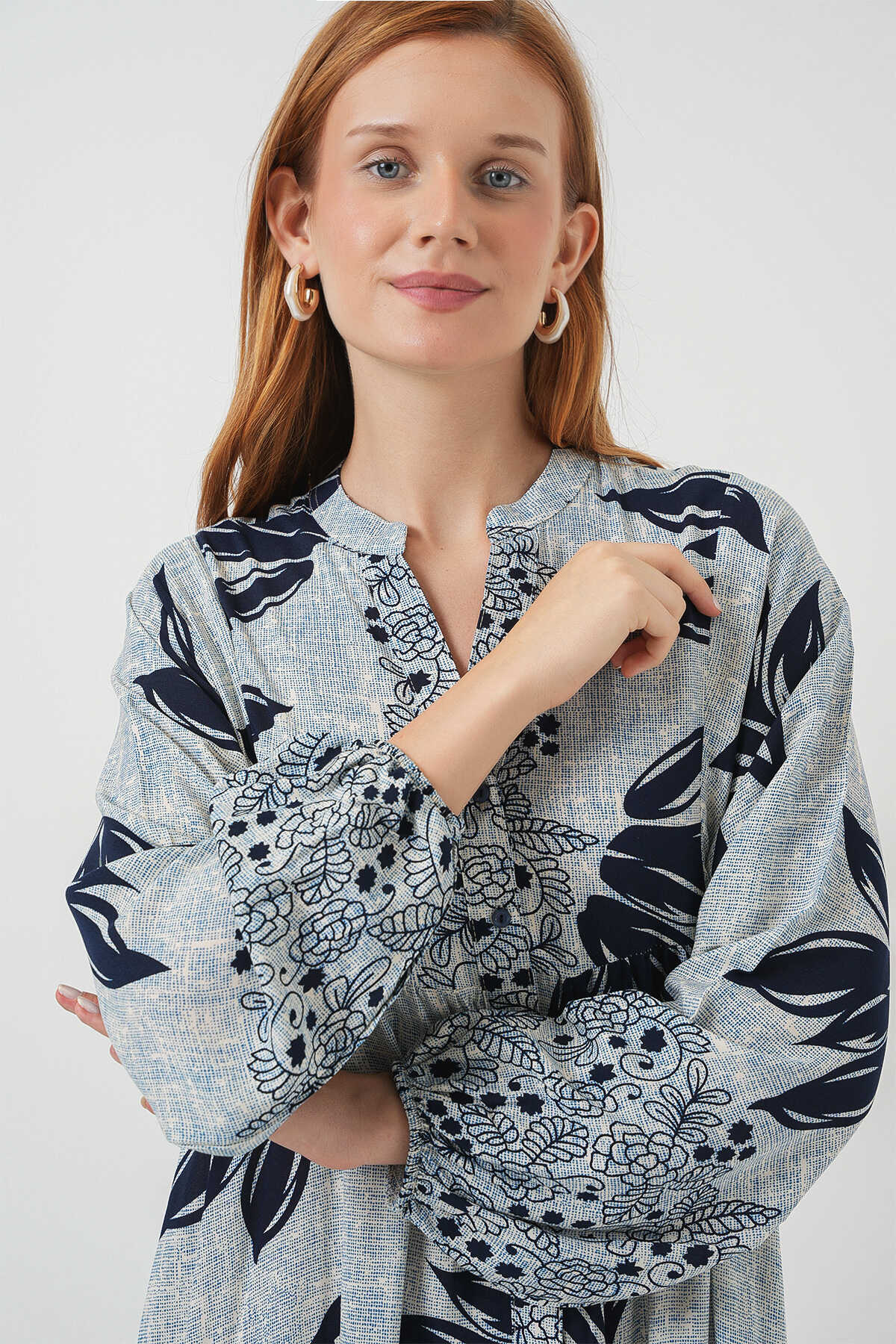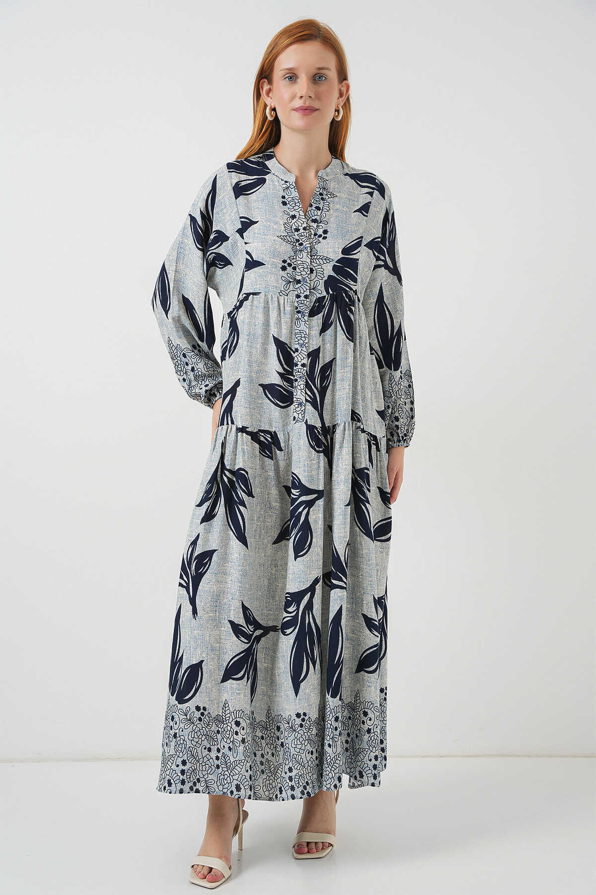 Kadın Desenli Uzun Tesettür Elbise 2585 - Mavi - Lacivert