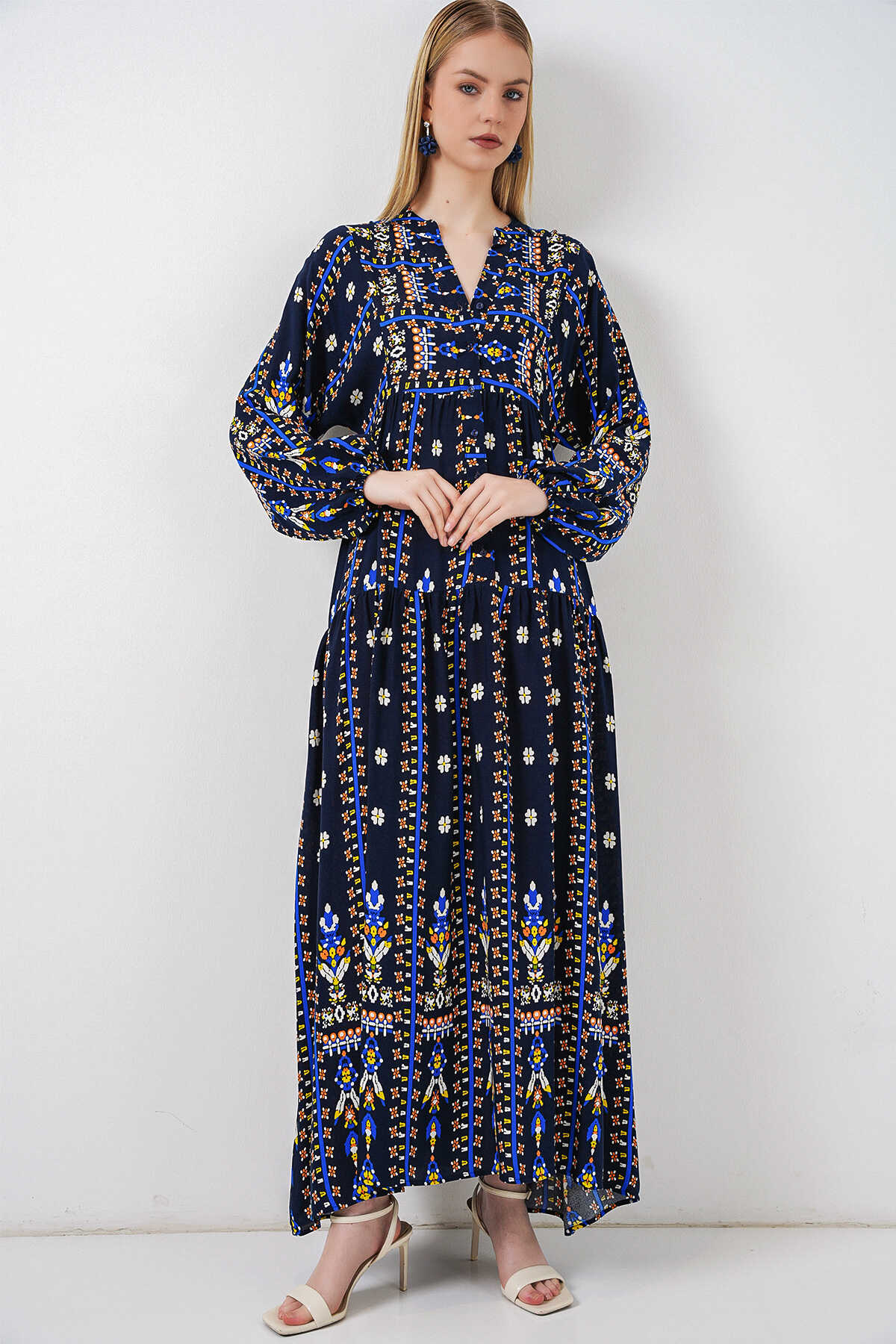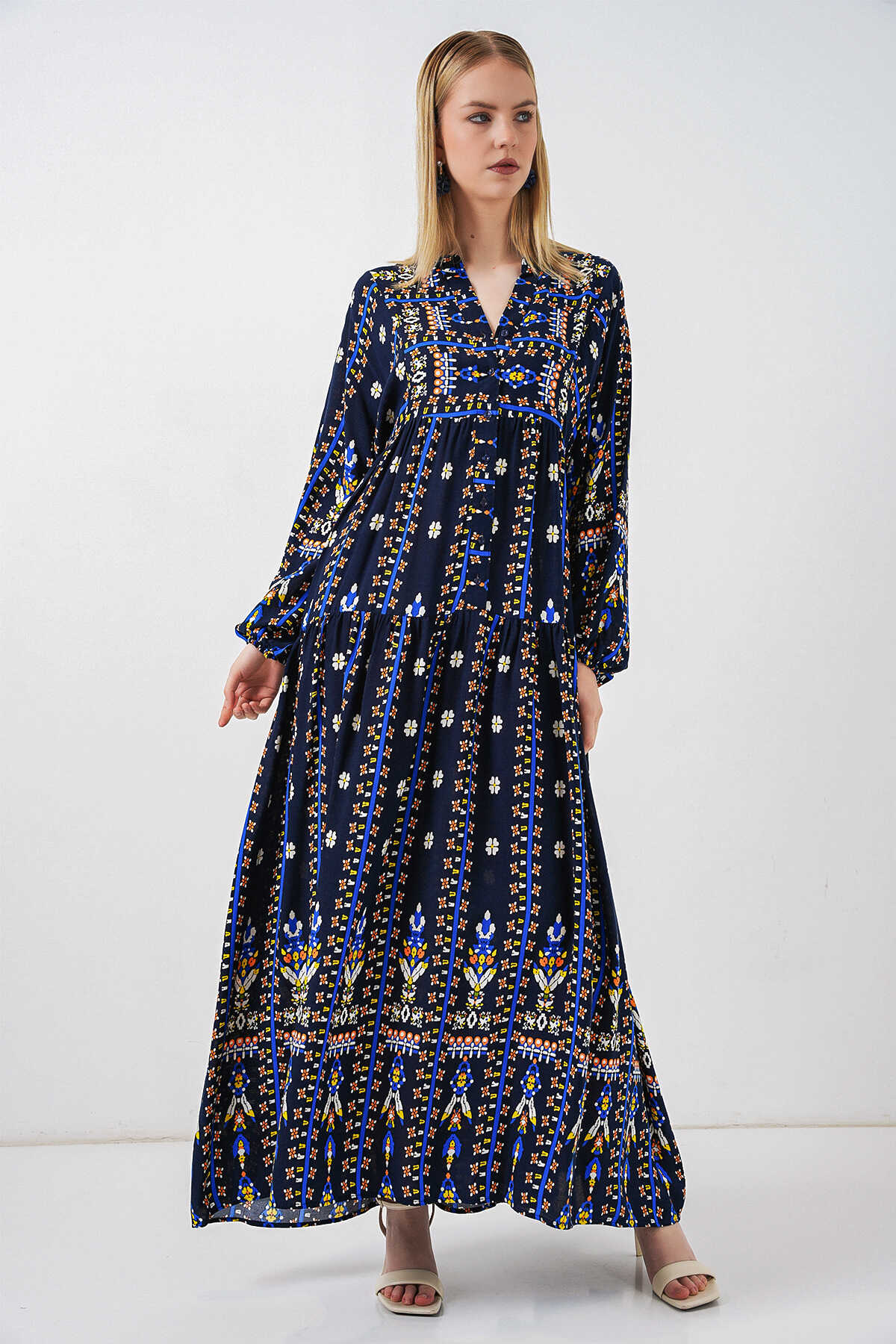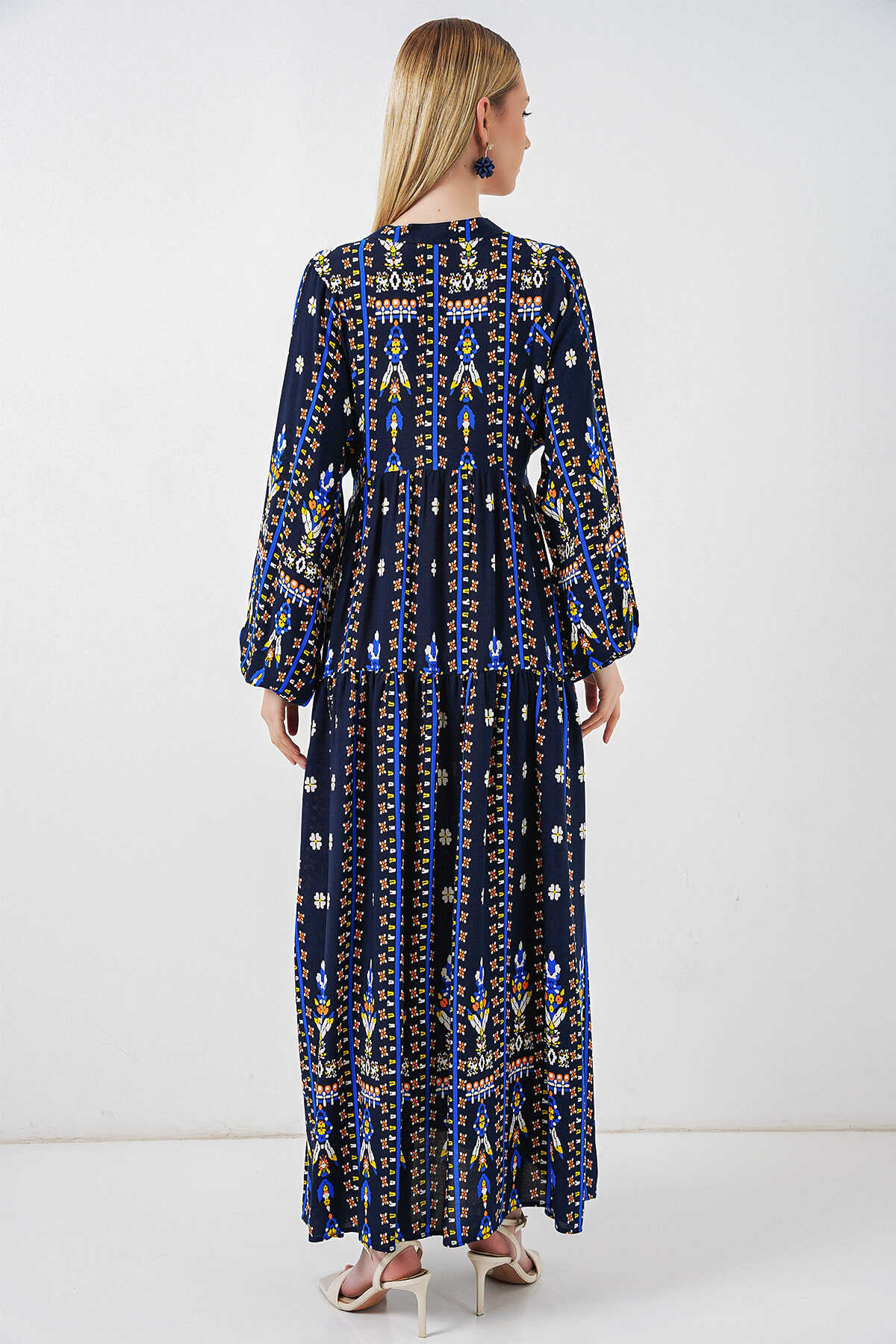 Kadın Desenli Uzun Tesettür Elbise 2585 - P. Lacivert