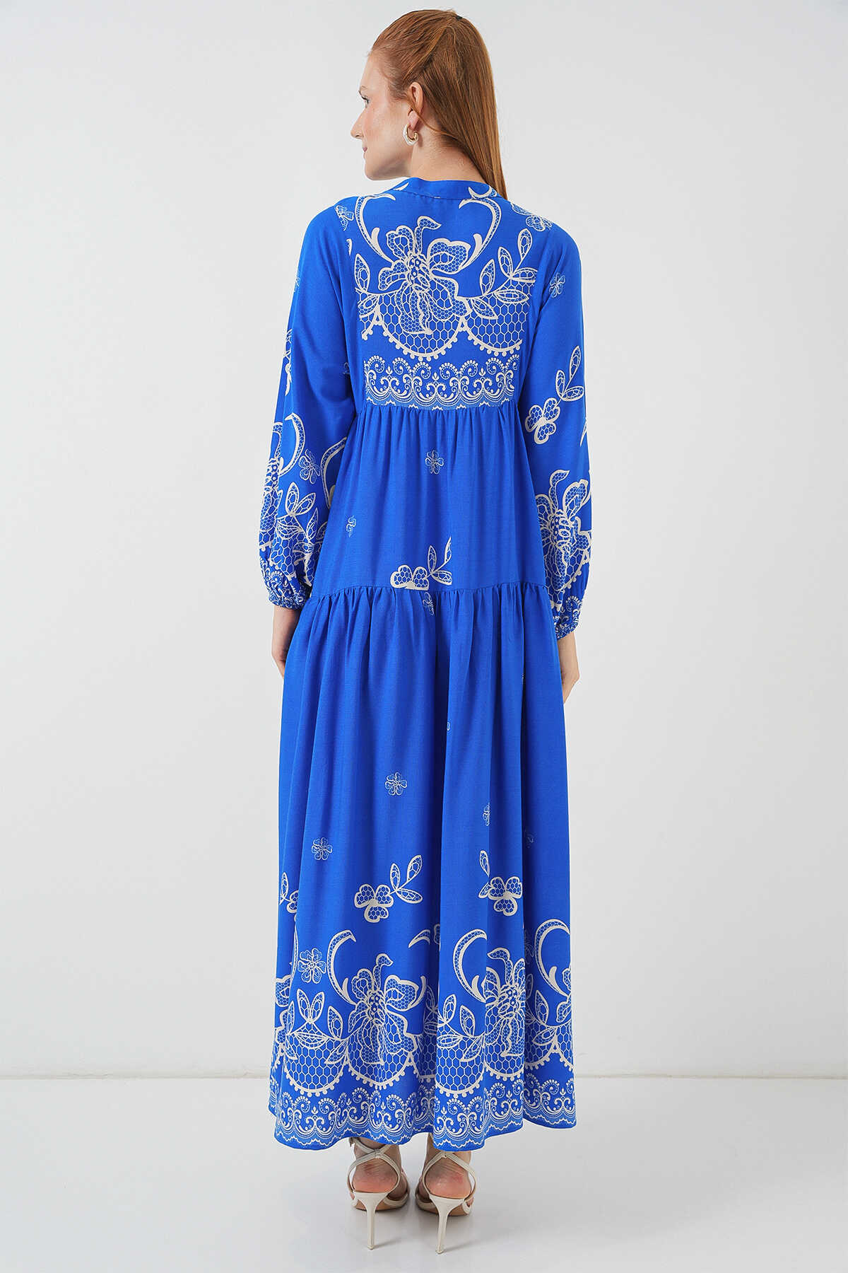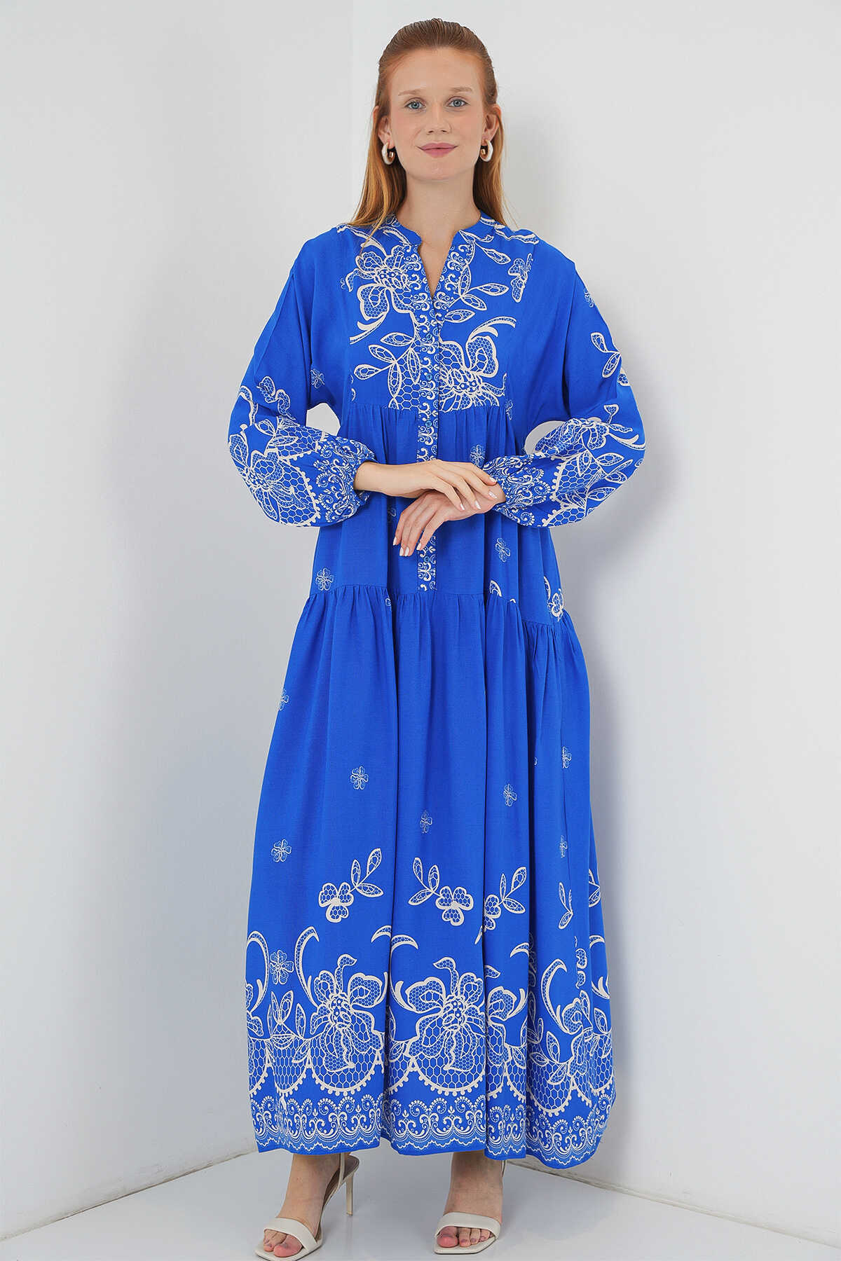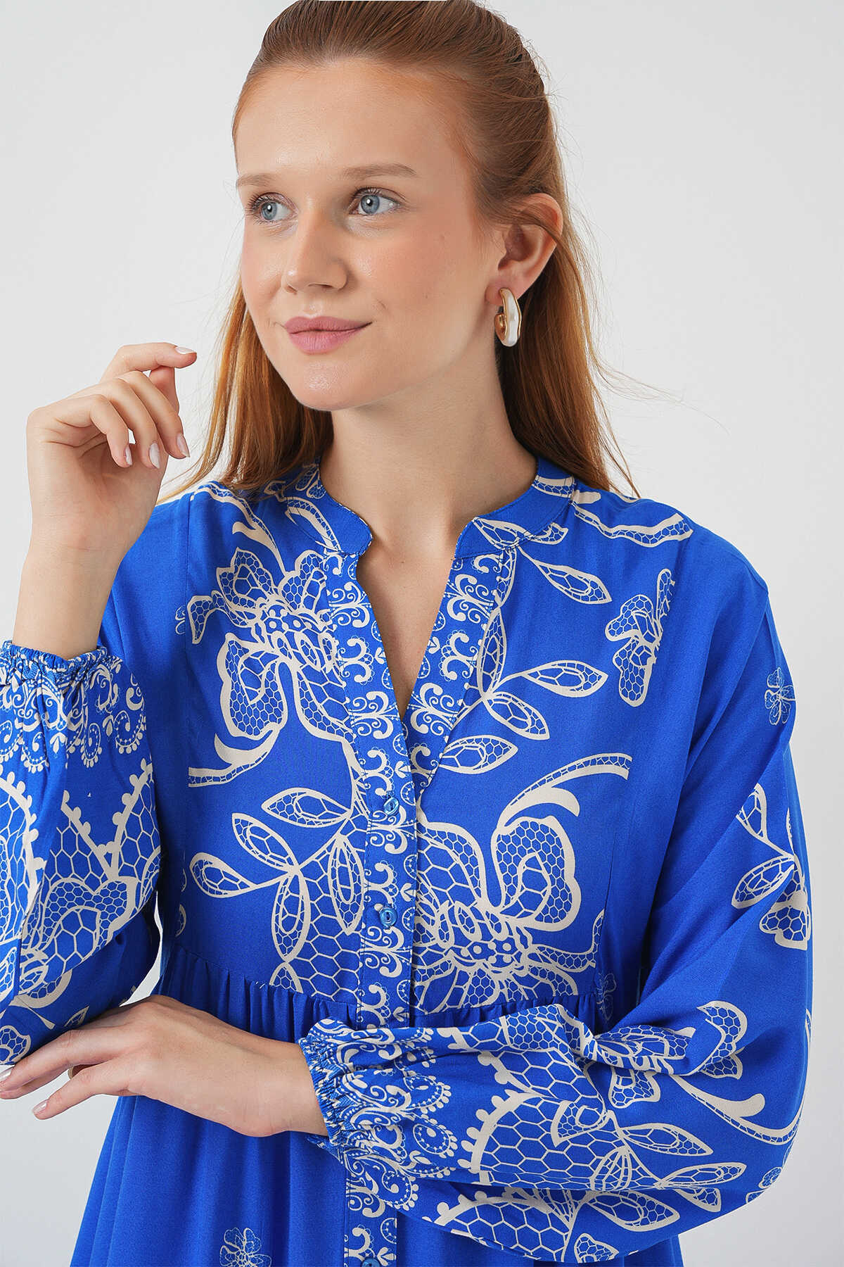 Kadın Desenli Uzun Tesettür Elbise 2585 - Saks - Kombin