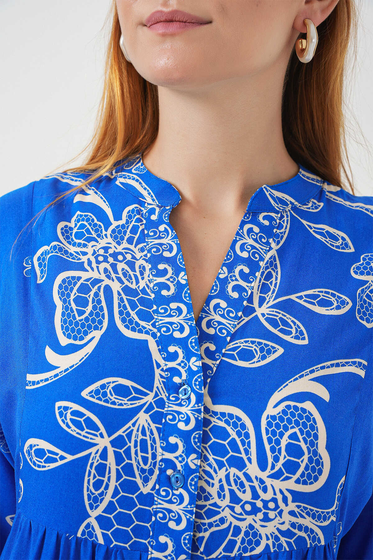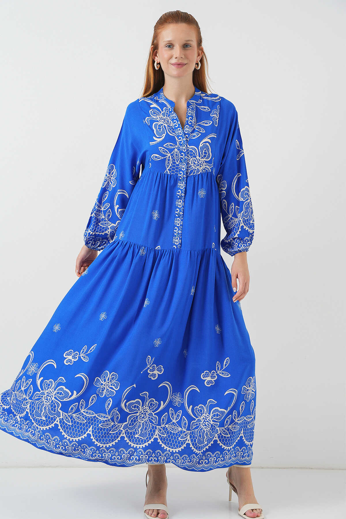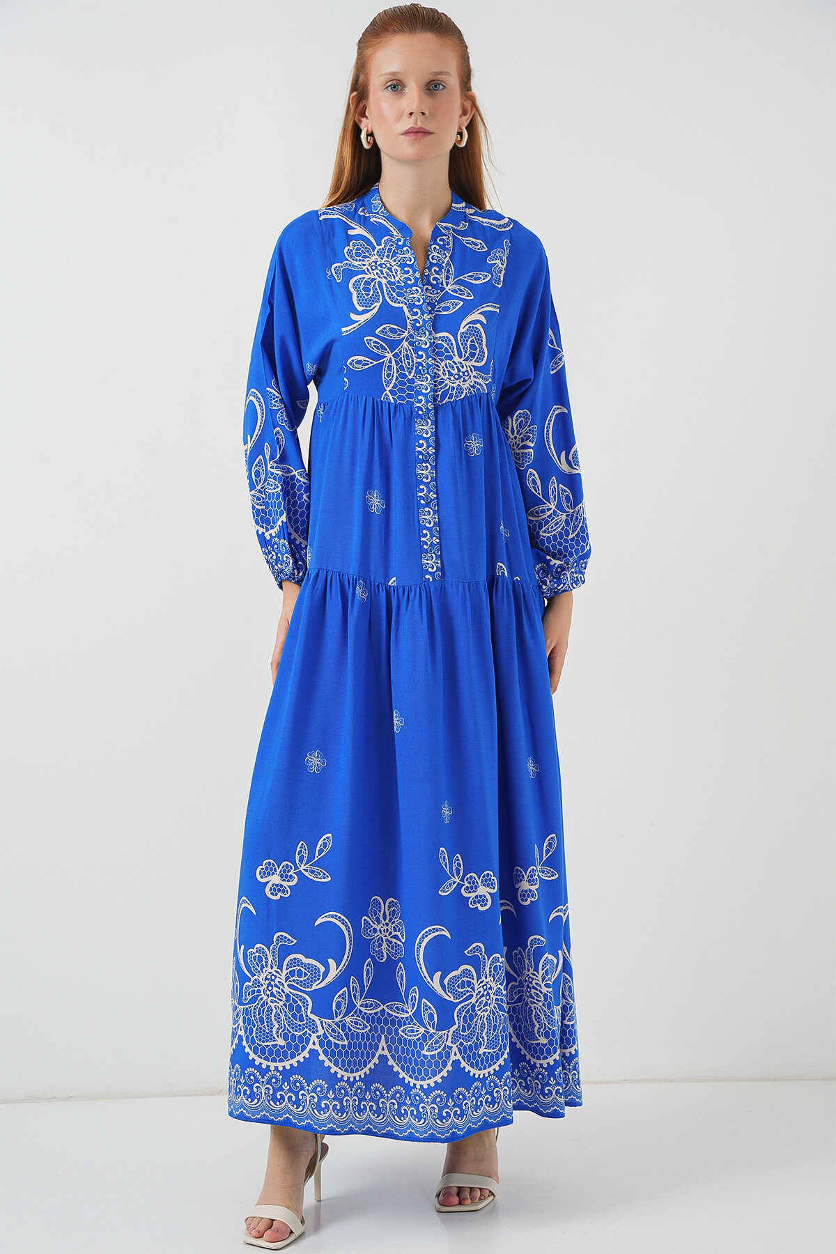 Kadın Desenli Uzun Tesettür Elbise 2585 - Saks - Kombin