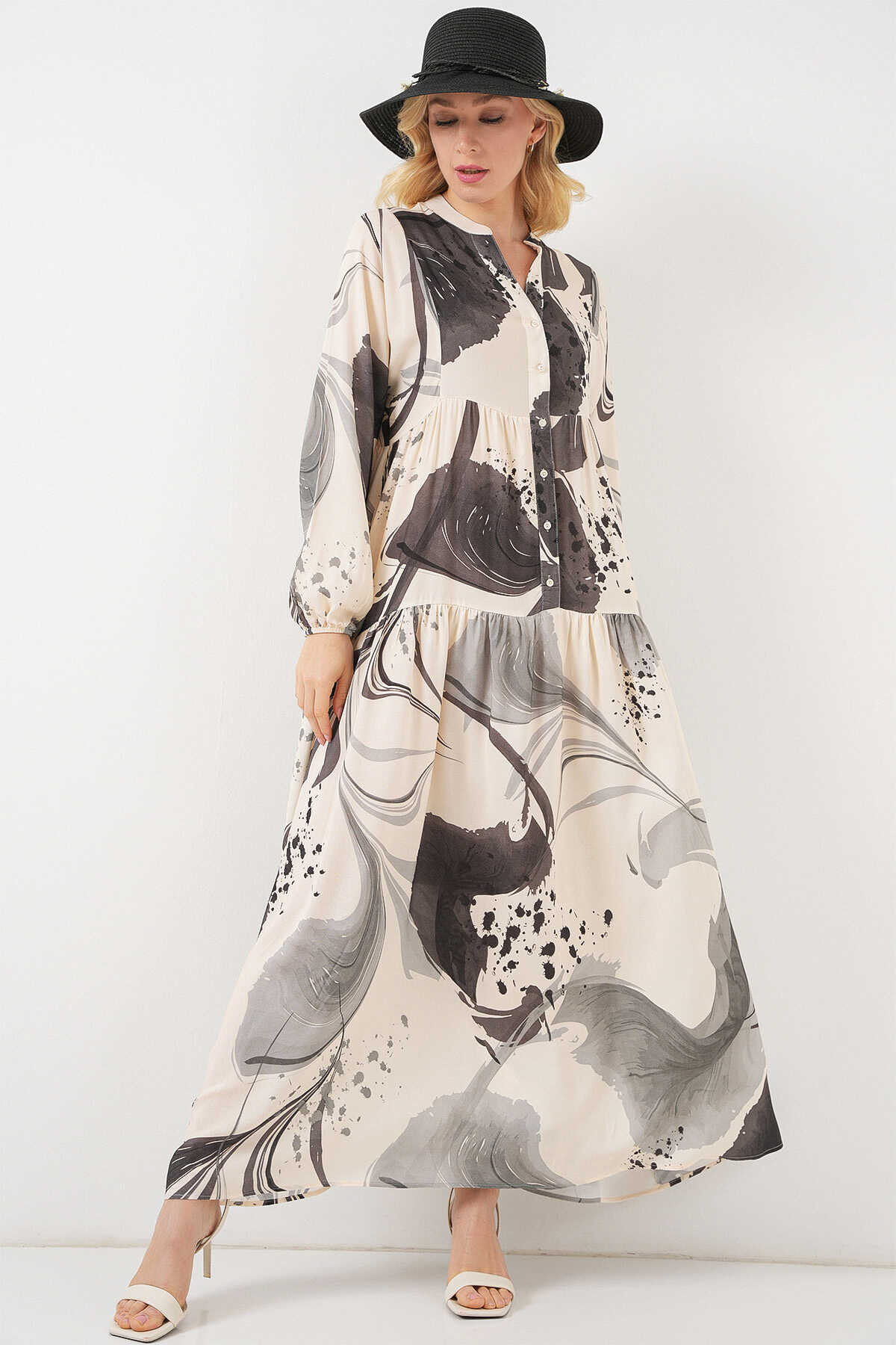 Kadın Desenli Uzun Tesettür Elbise 2585 - Siyah - Kombin