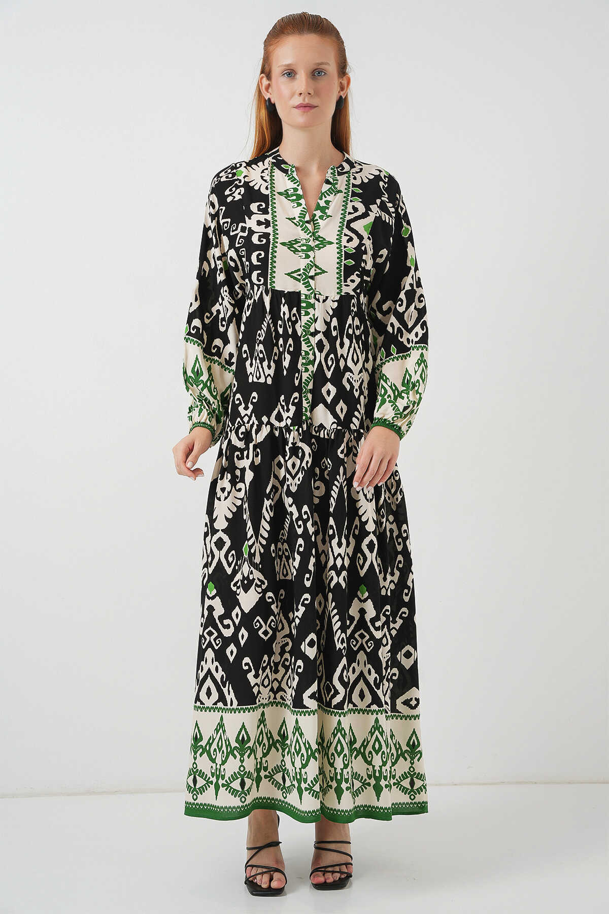Kadın Desenli Uzun Tesettür Elbise 2585 - Siyah - Yeşil - Kombin