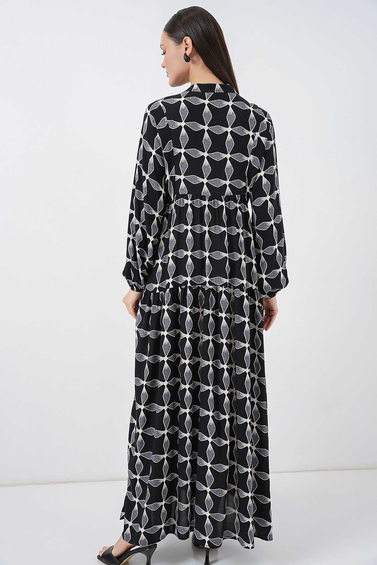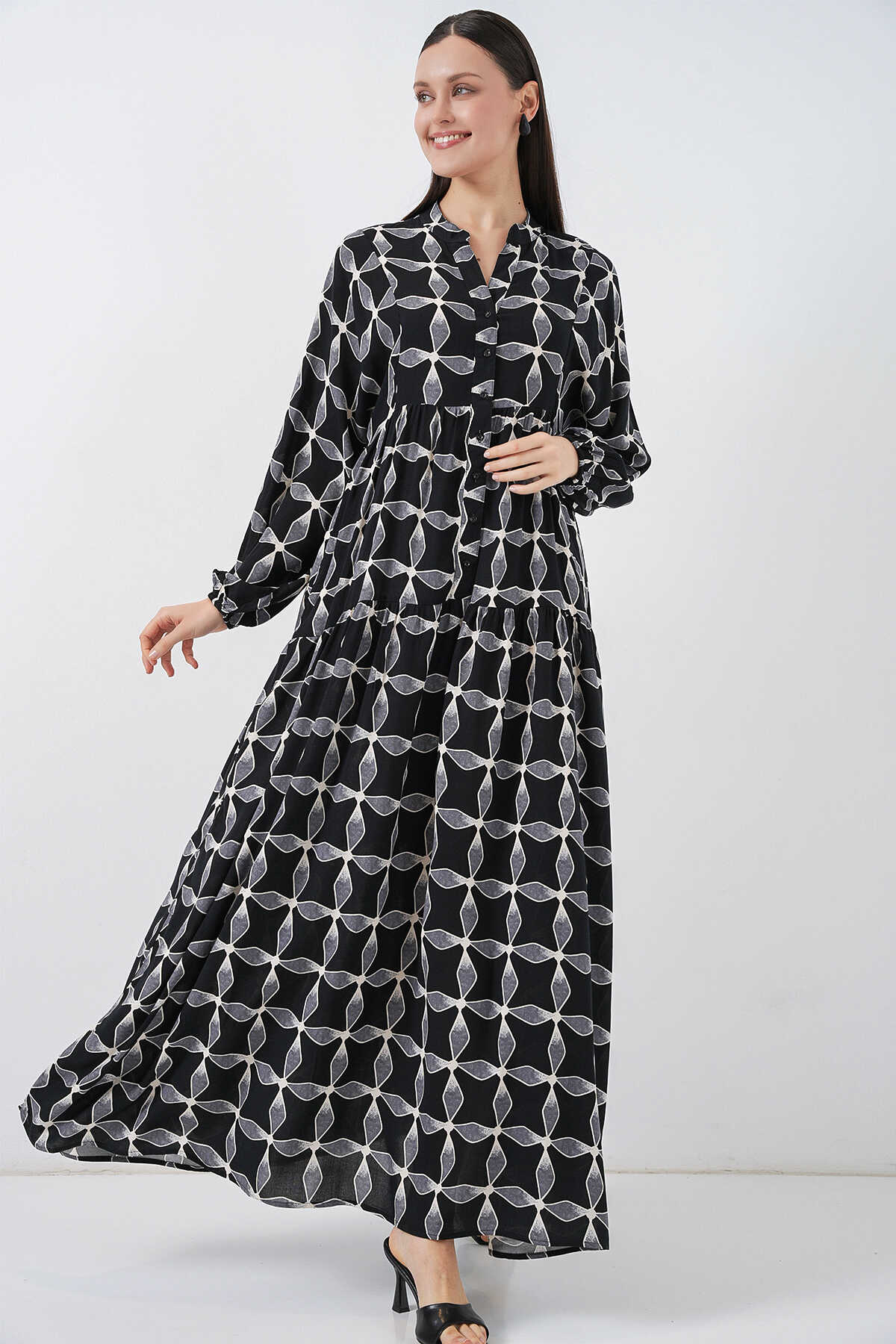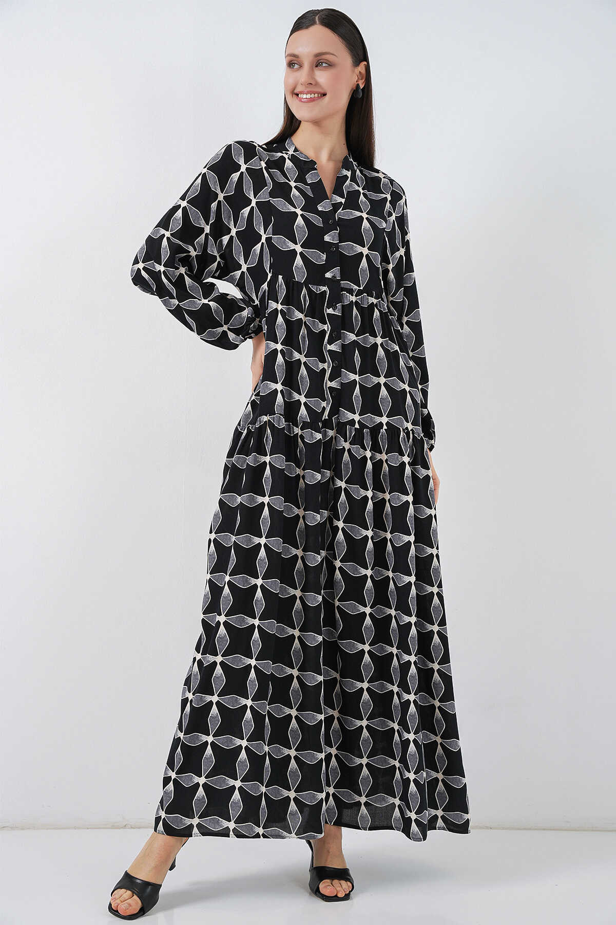 Kadın Desenli Uzun Tesettür Elbise 2585 - Siyah1 - Kombin