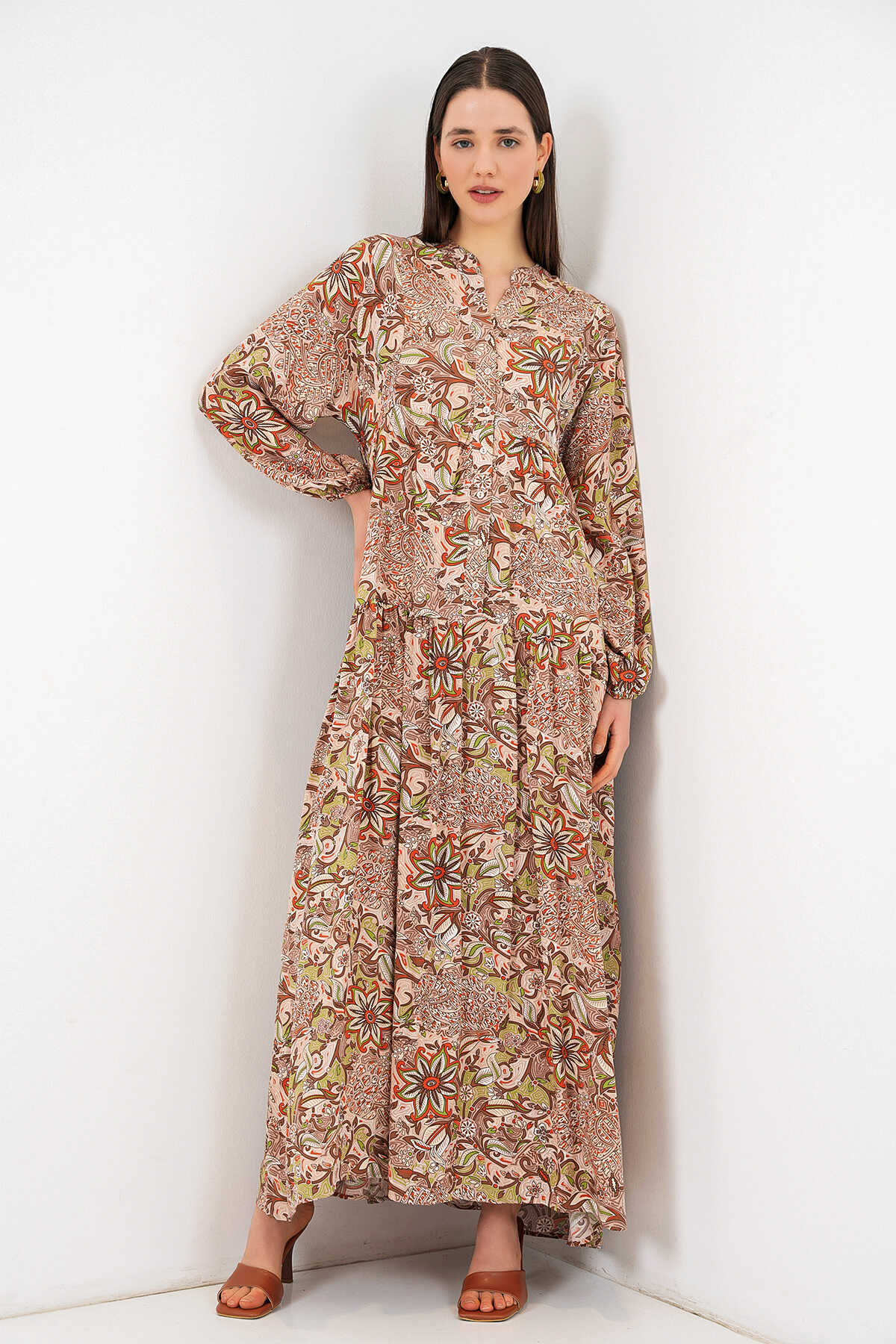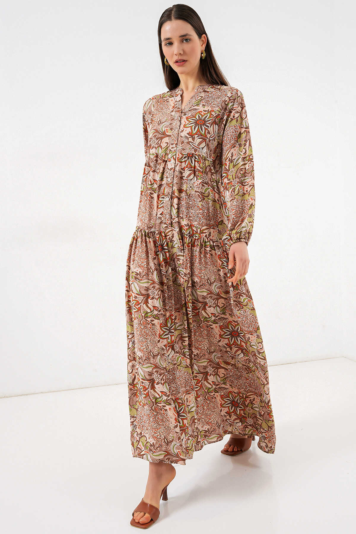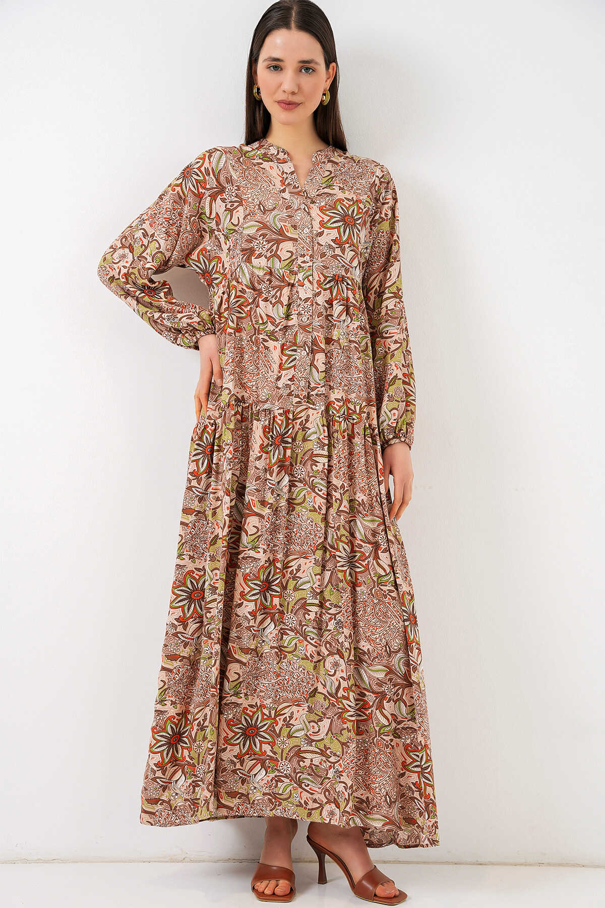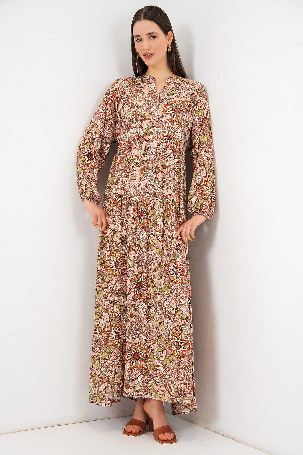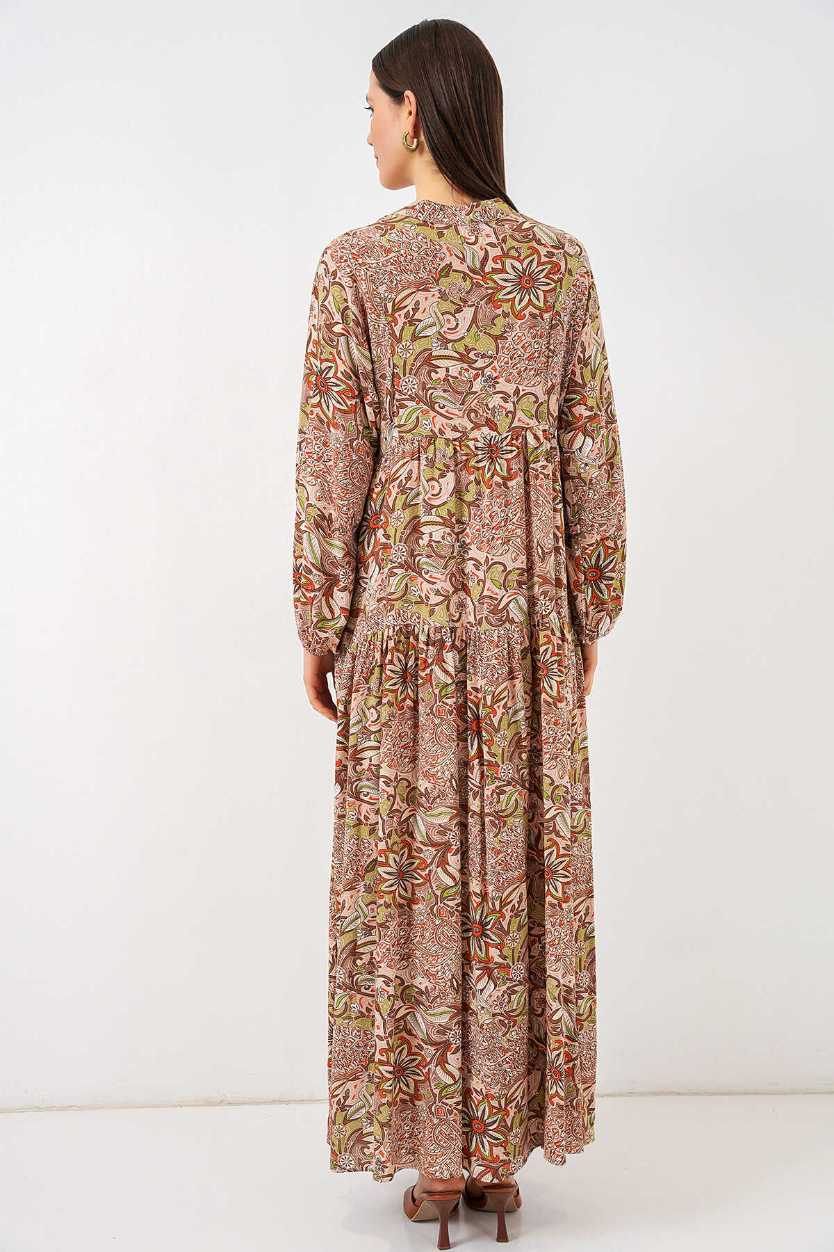 Kadın Desenli Uzun Tesettür Elbise 2585 - Sütlü Kahve - Kombin