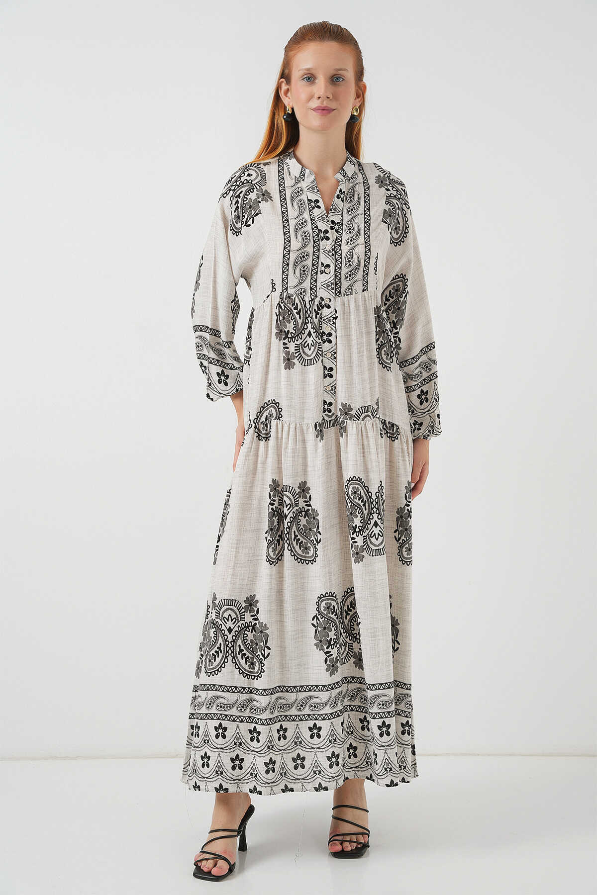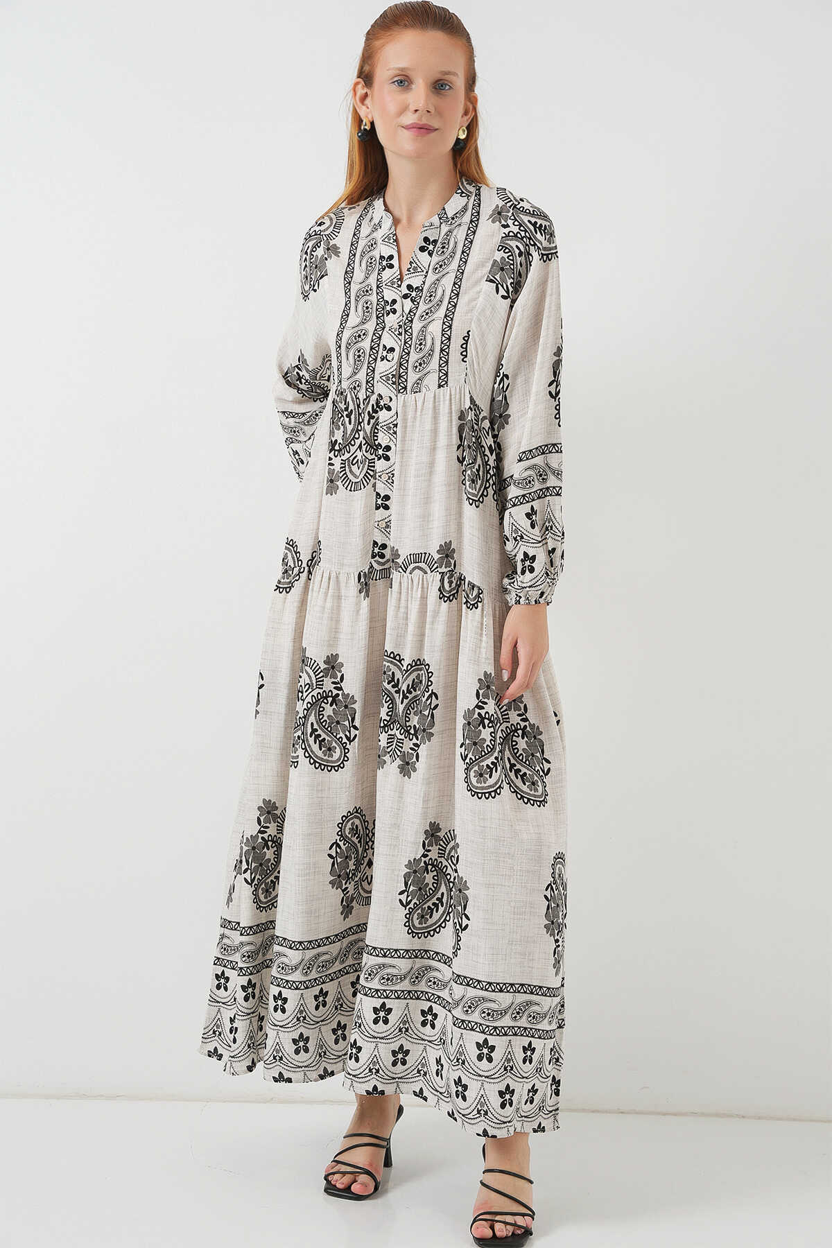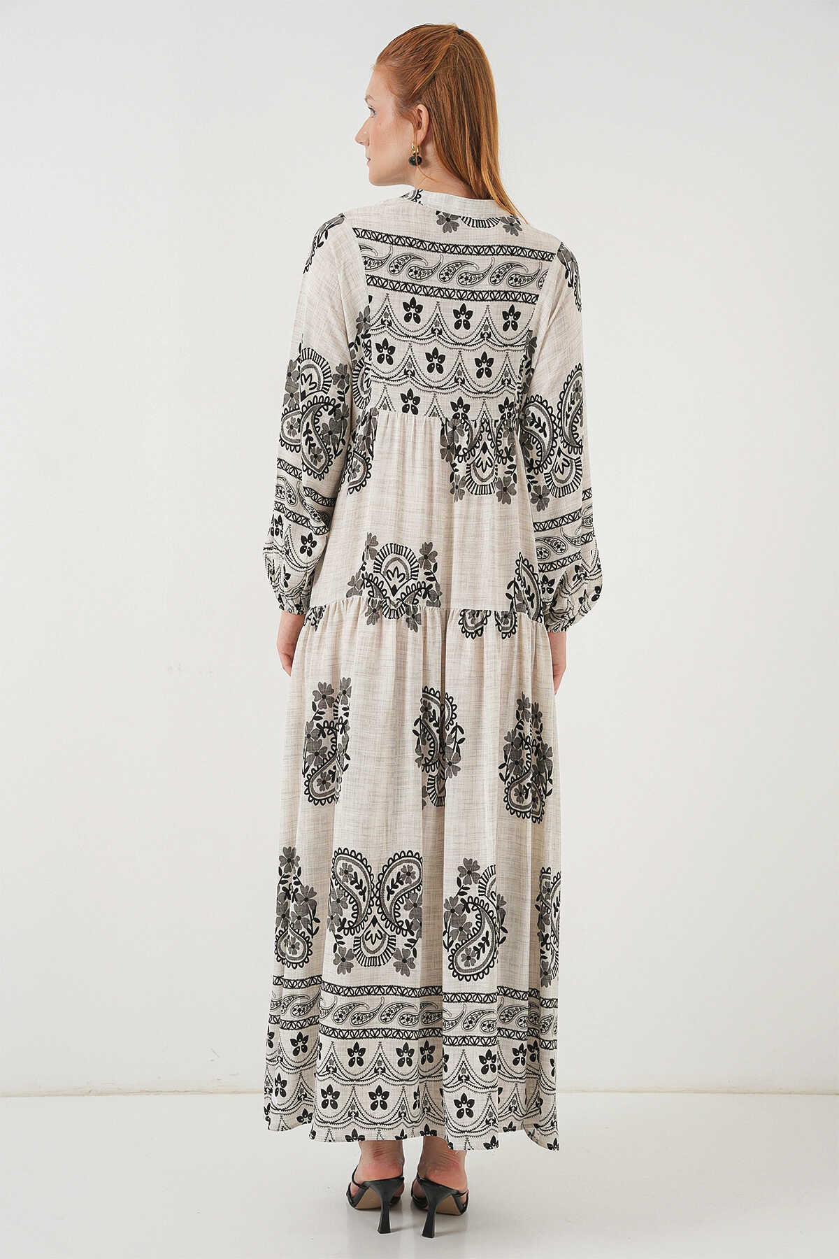 Kadın Desenli Uzun Tesettür Elbise 2585 - Taş