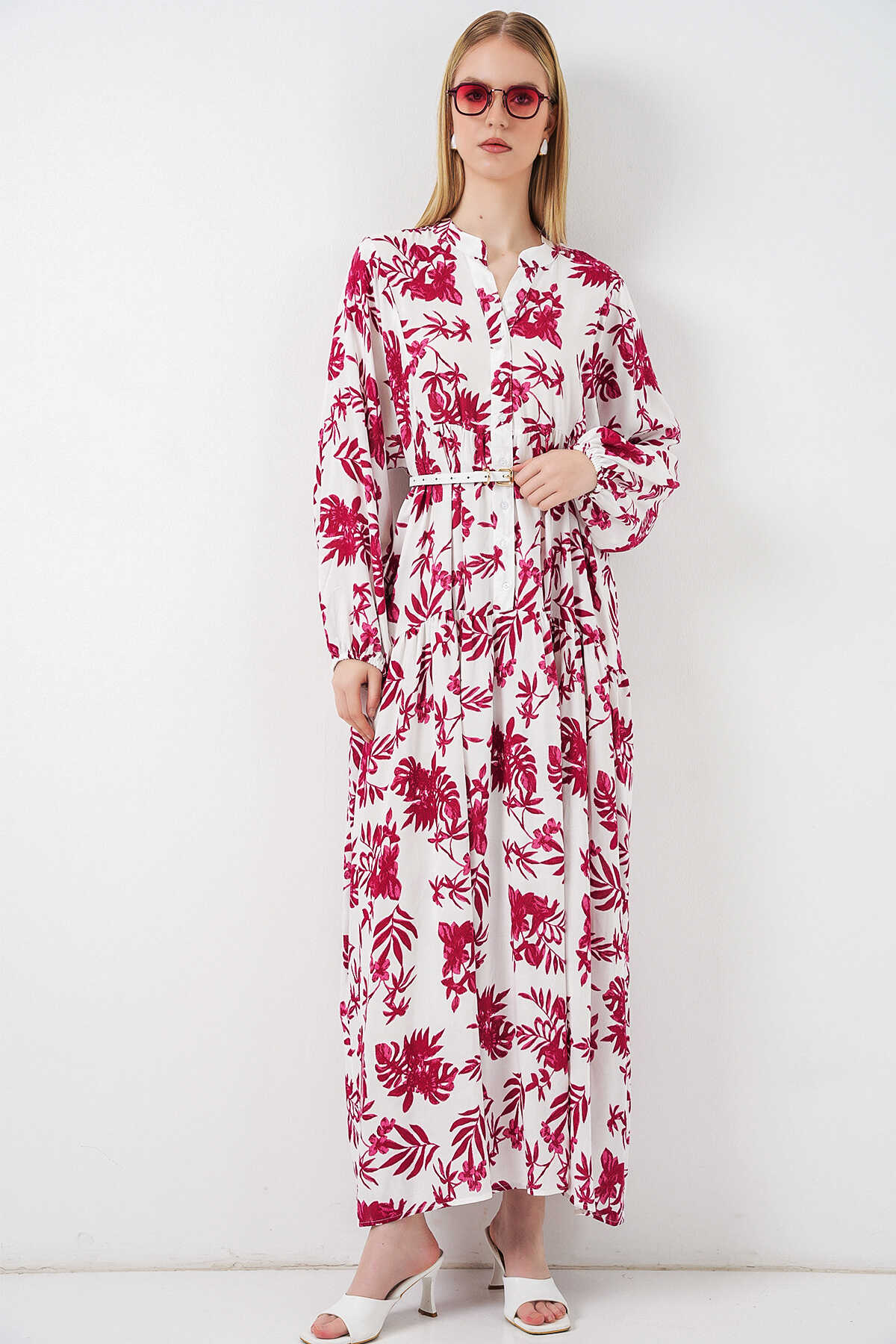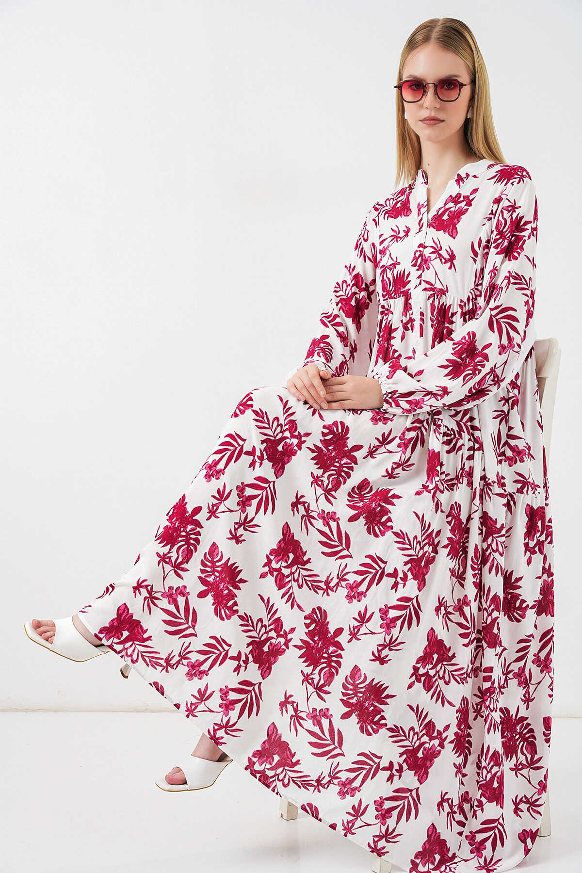 Kadın Desenli Uzun Tesettür Elbise 2585 - V. Kırmızı - Kombin