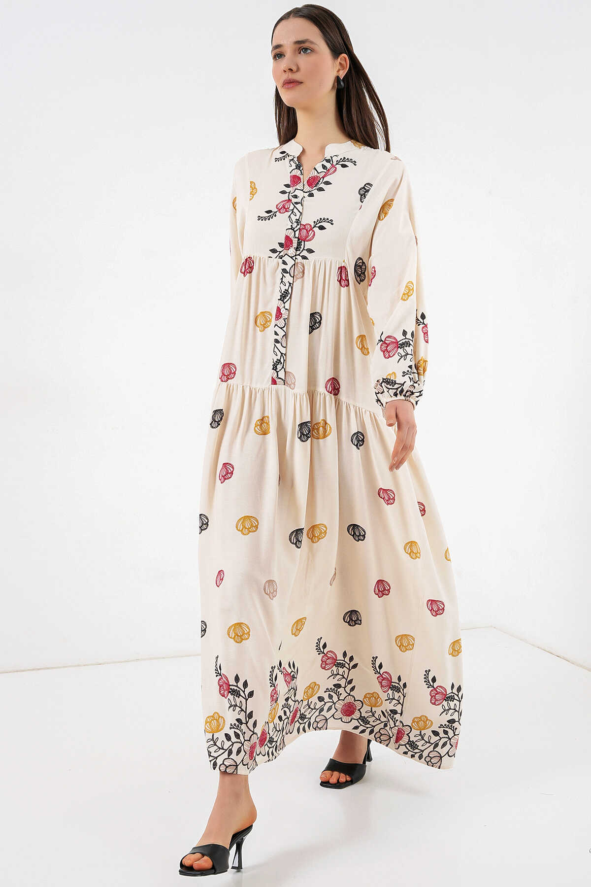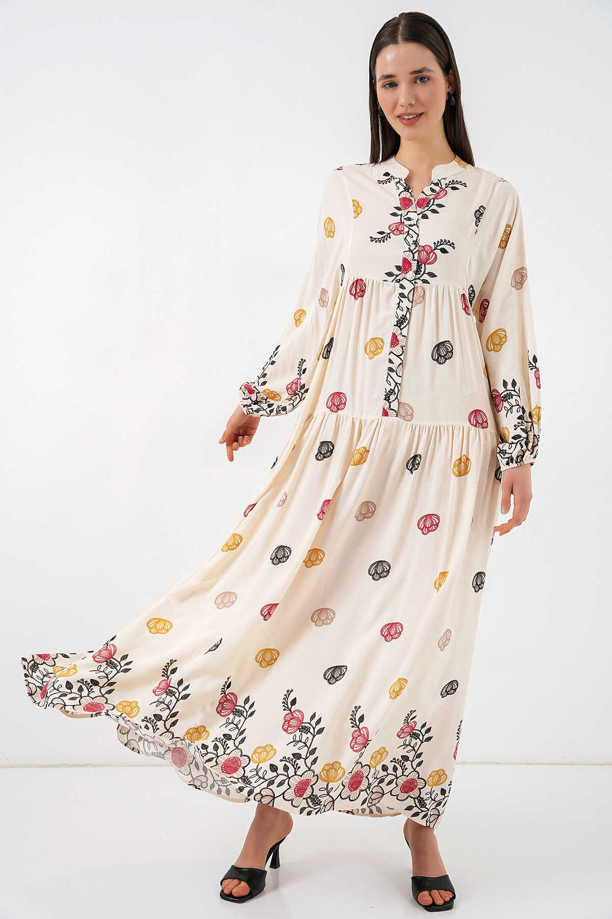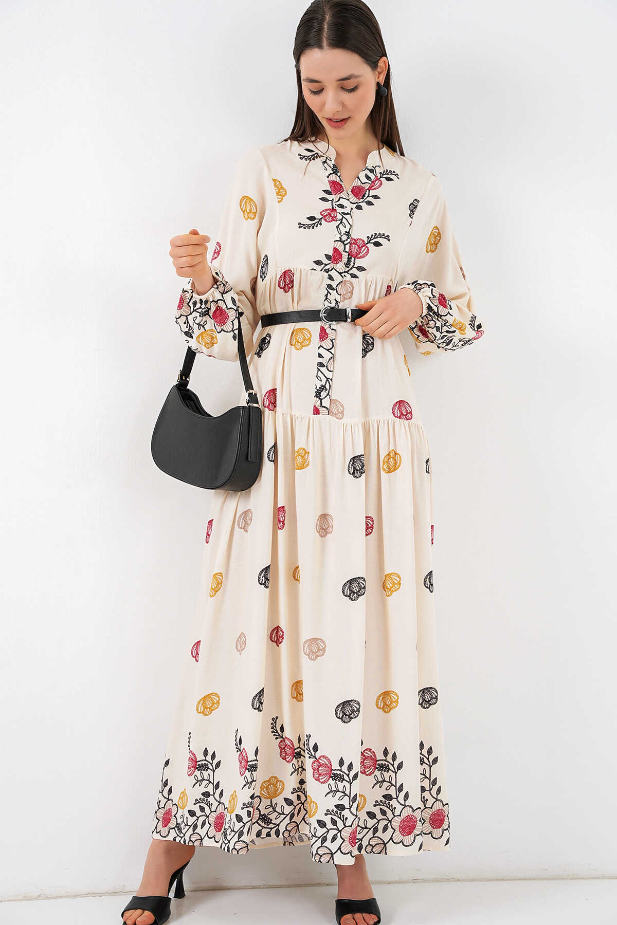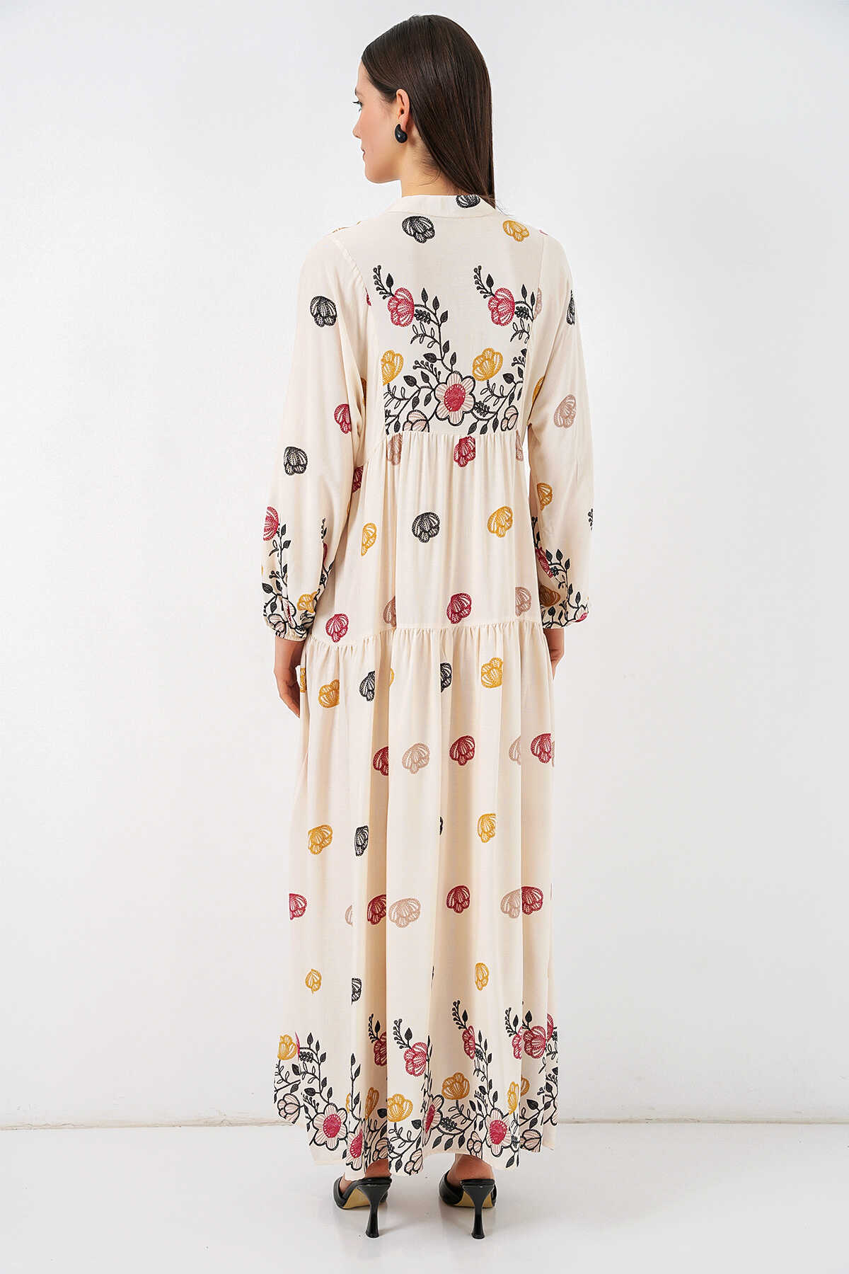 Kadın Desenli Uzun Tesettür Elbise 2585 - Y.Bej - Kombin