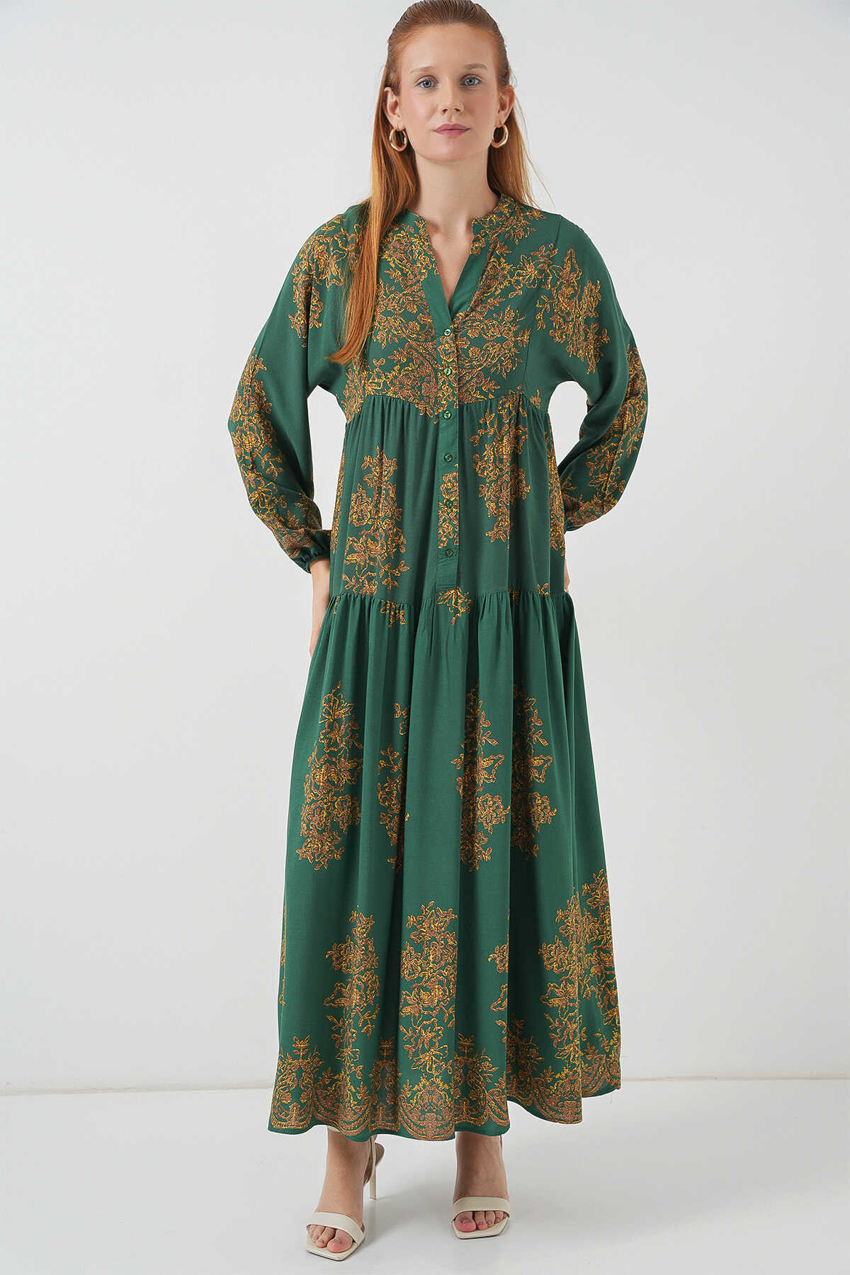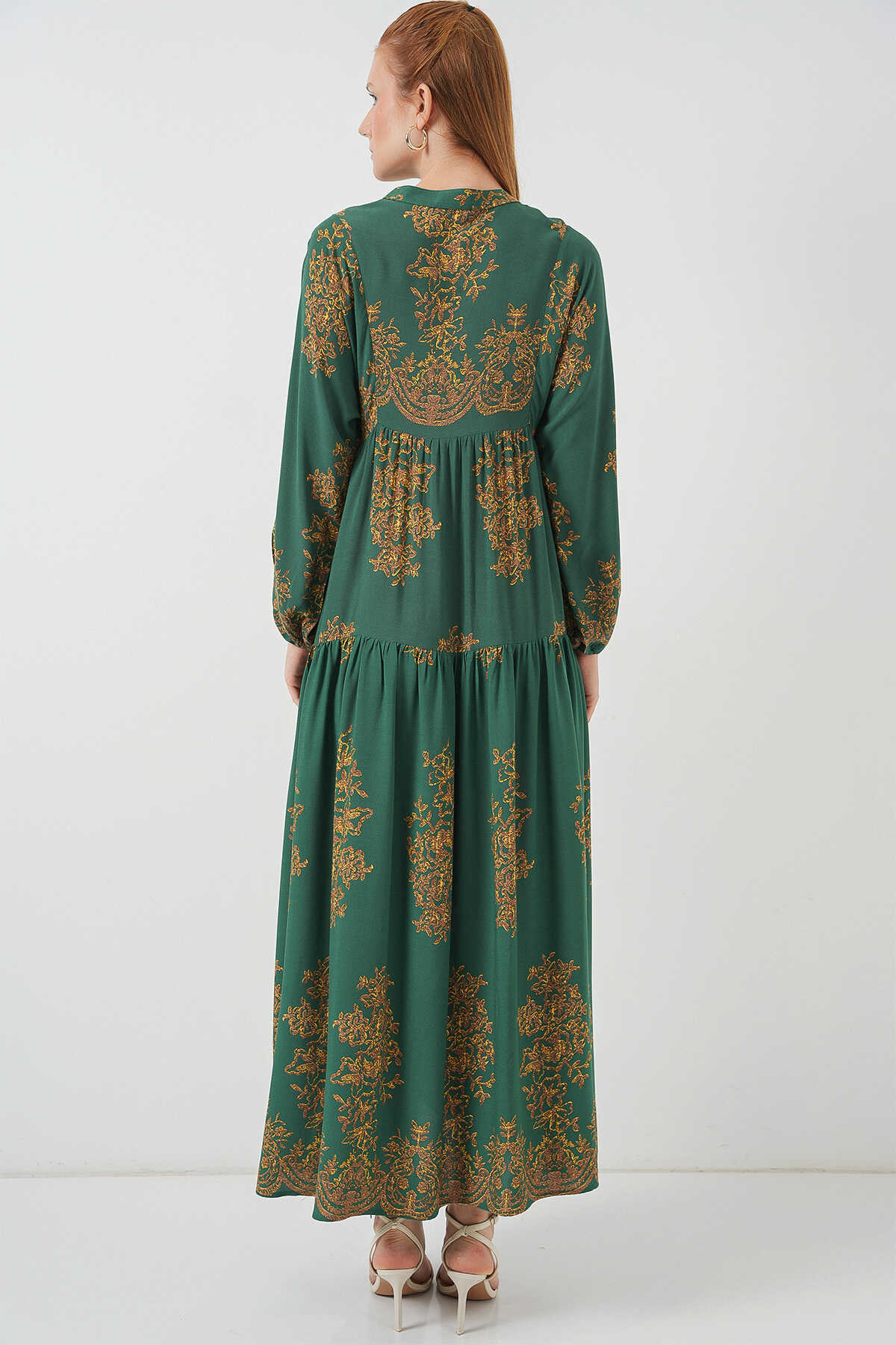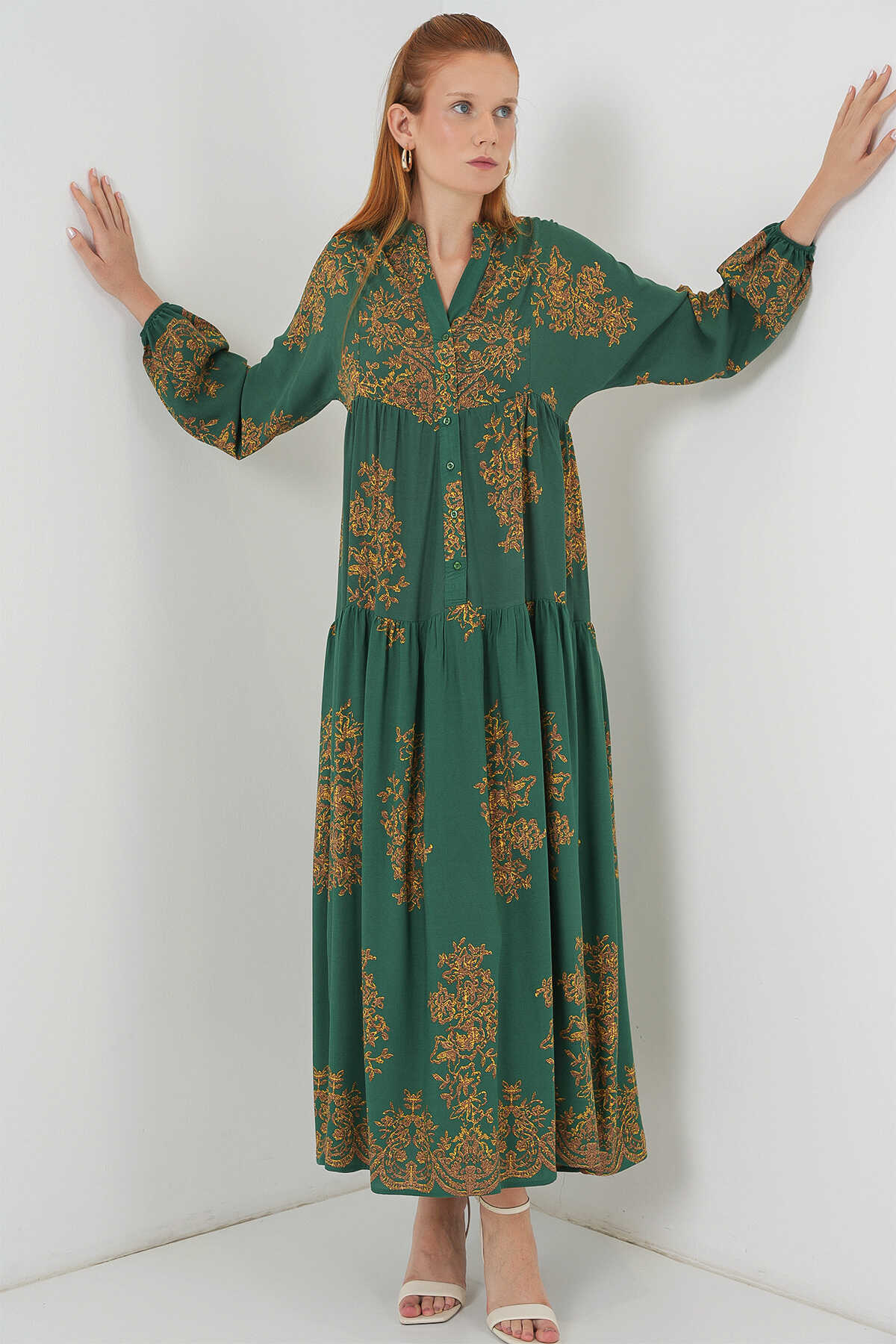 Kadın Desenli Uzun Tesettür Elbise 2585 - Y.Zümrüt - Kombin