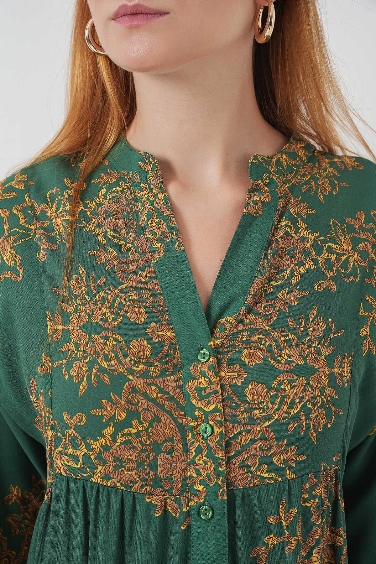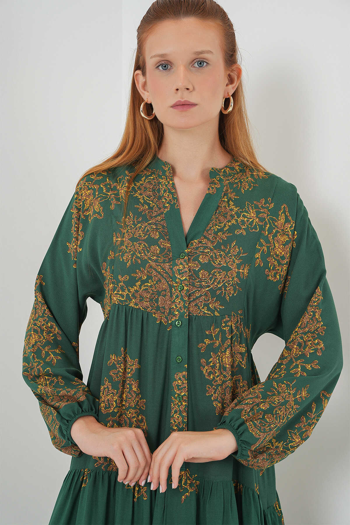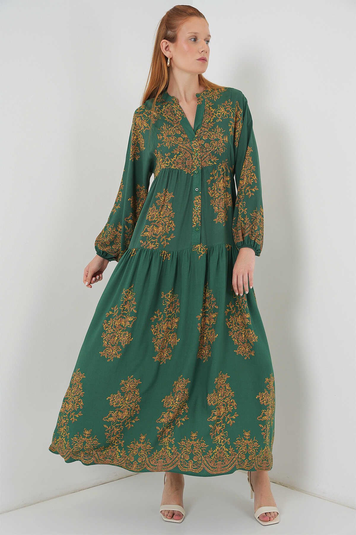 Kadın Desenli Uzun Tesettür Elbise 2585 - Y.Zümrüt - Kombin
