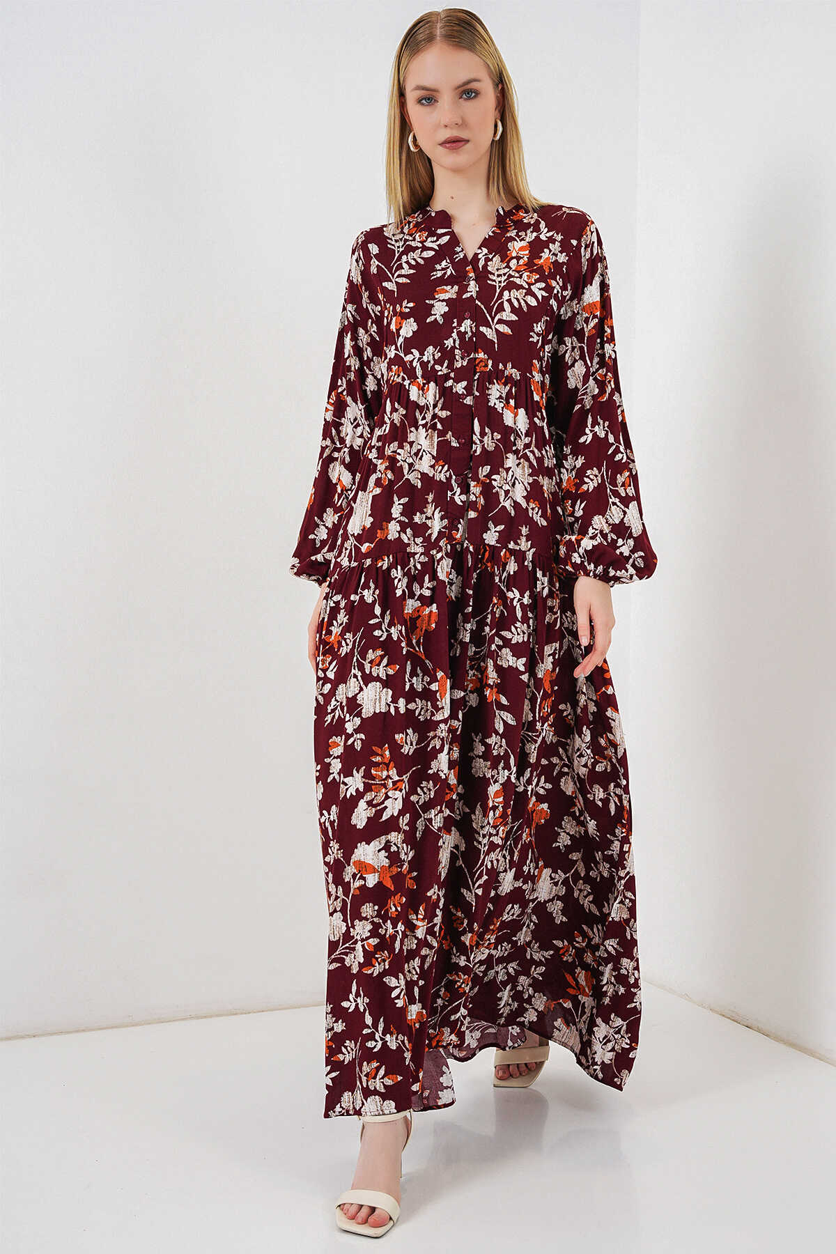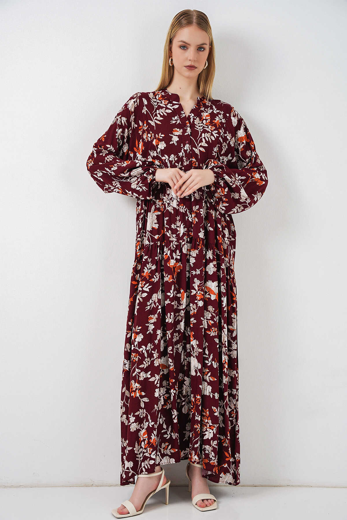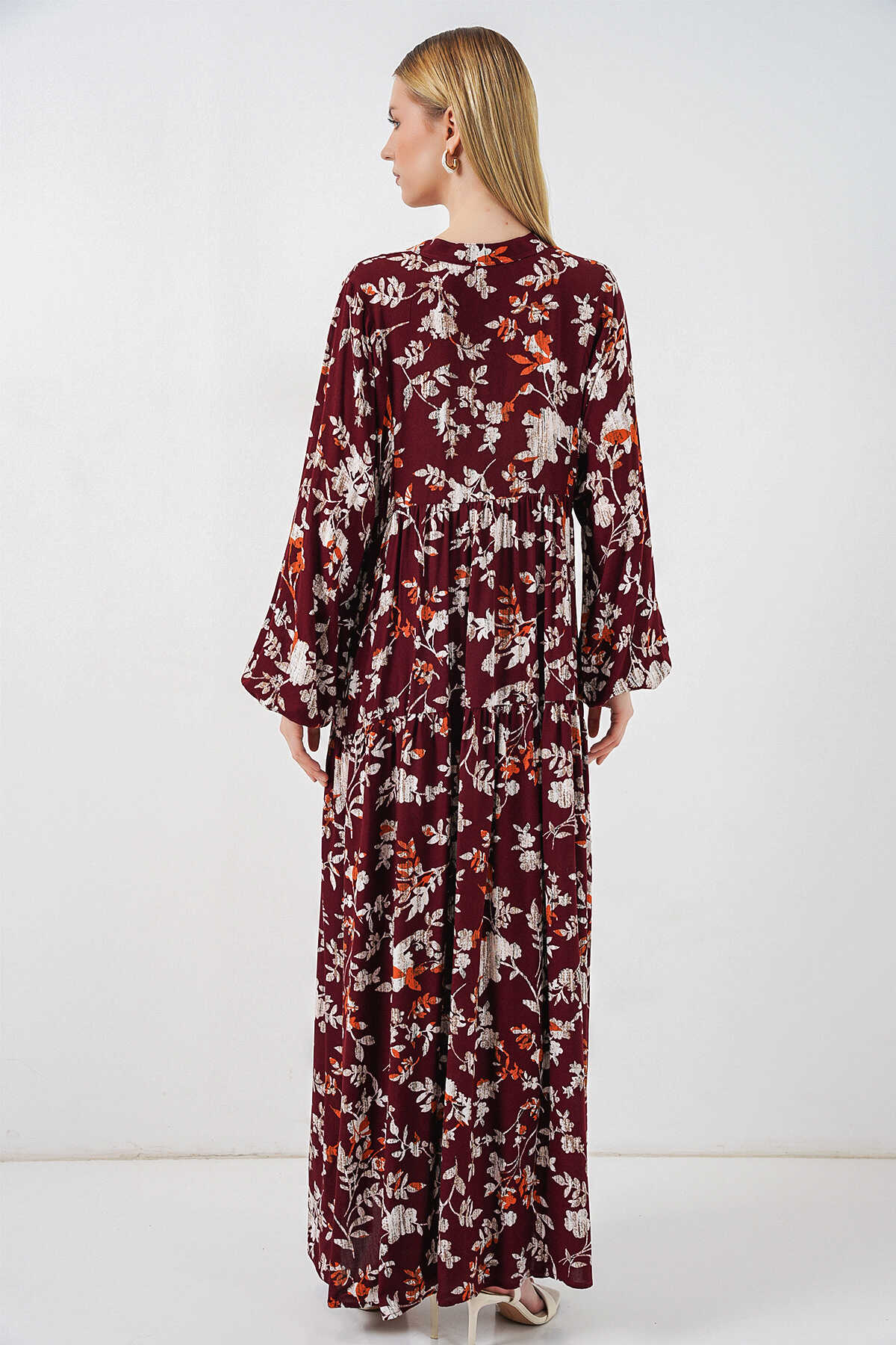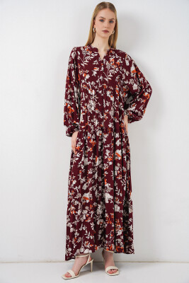 Kadın Desenli Uzun Tesettür Elbise 2585 - Z.Bordo - Kombin
