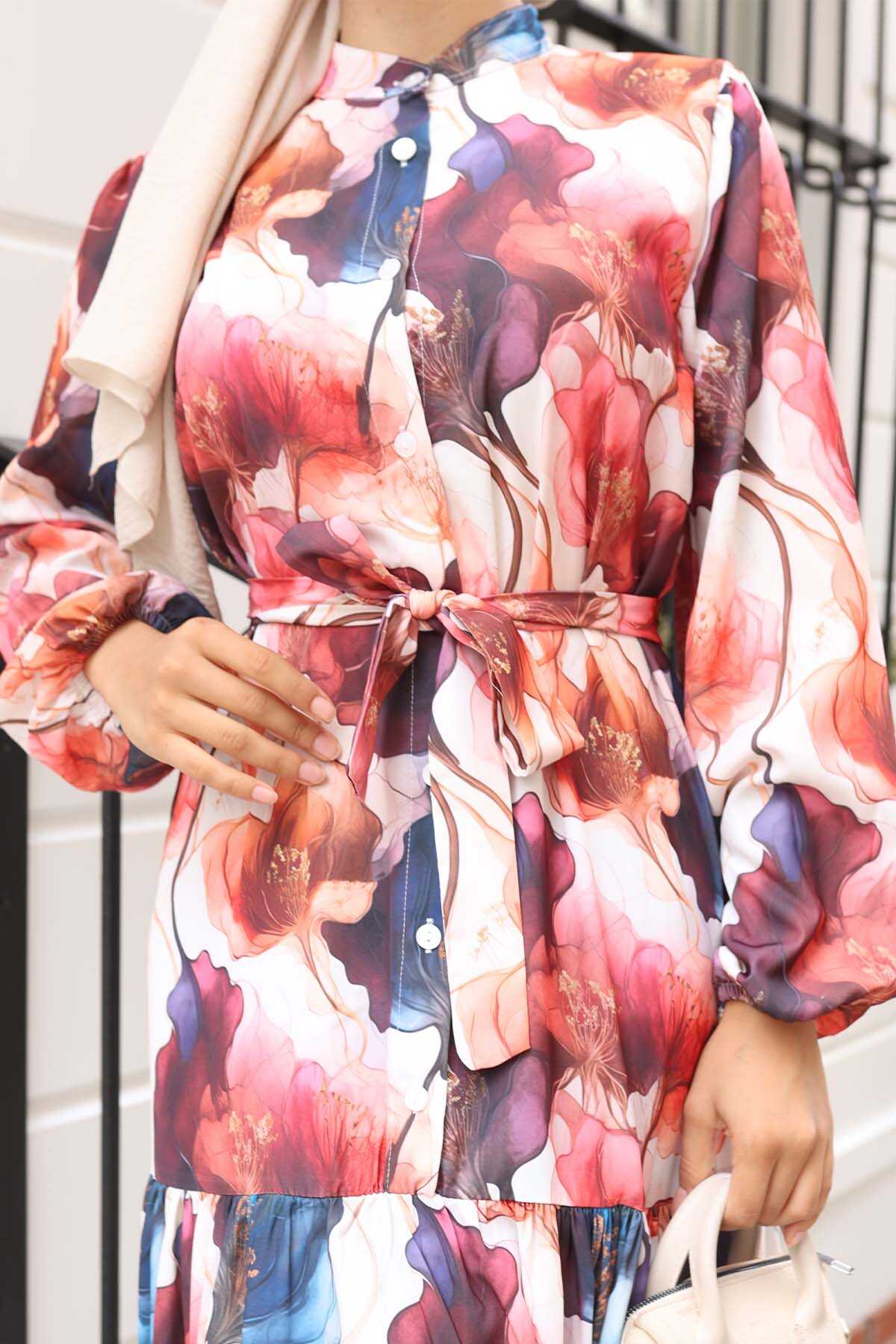 Kadın Desenli Uzun Tesettür Elbise 2586 - Bordo - Kombin