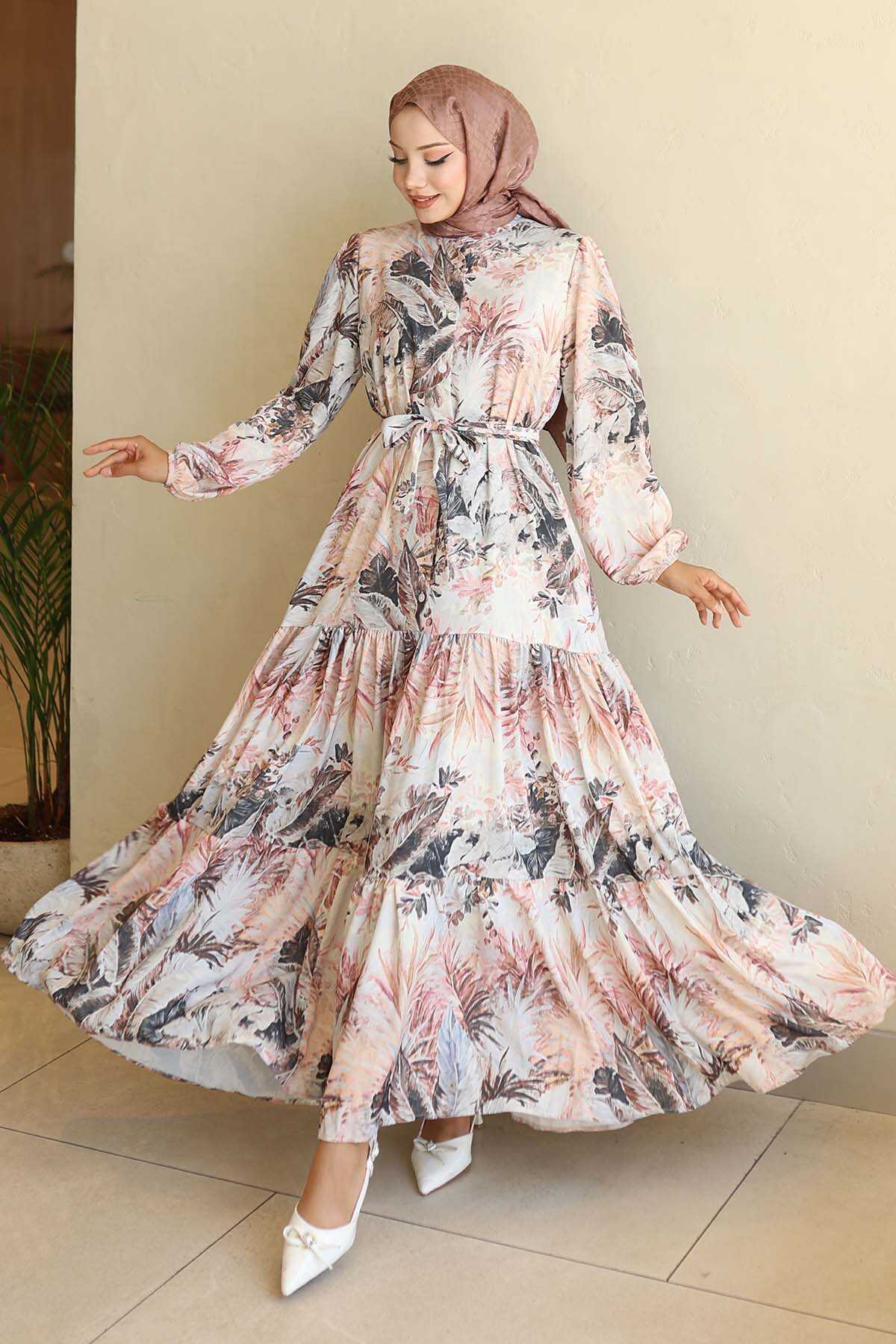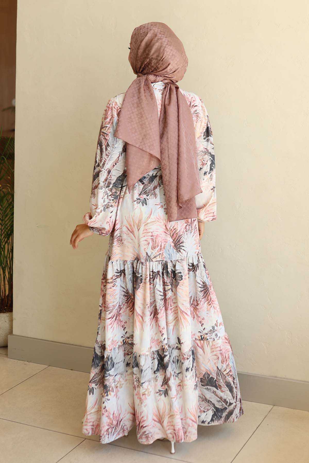 Kadın Desenli Uzun Tesettür Elbise 2586 - Kahverengi - Kombin