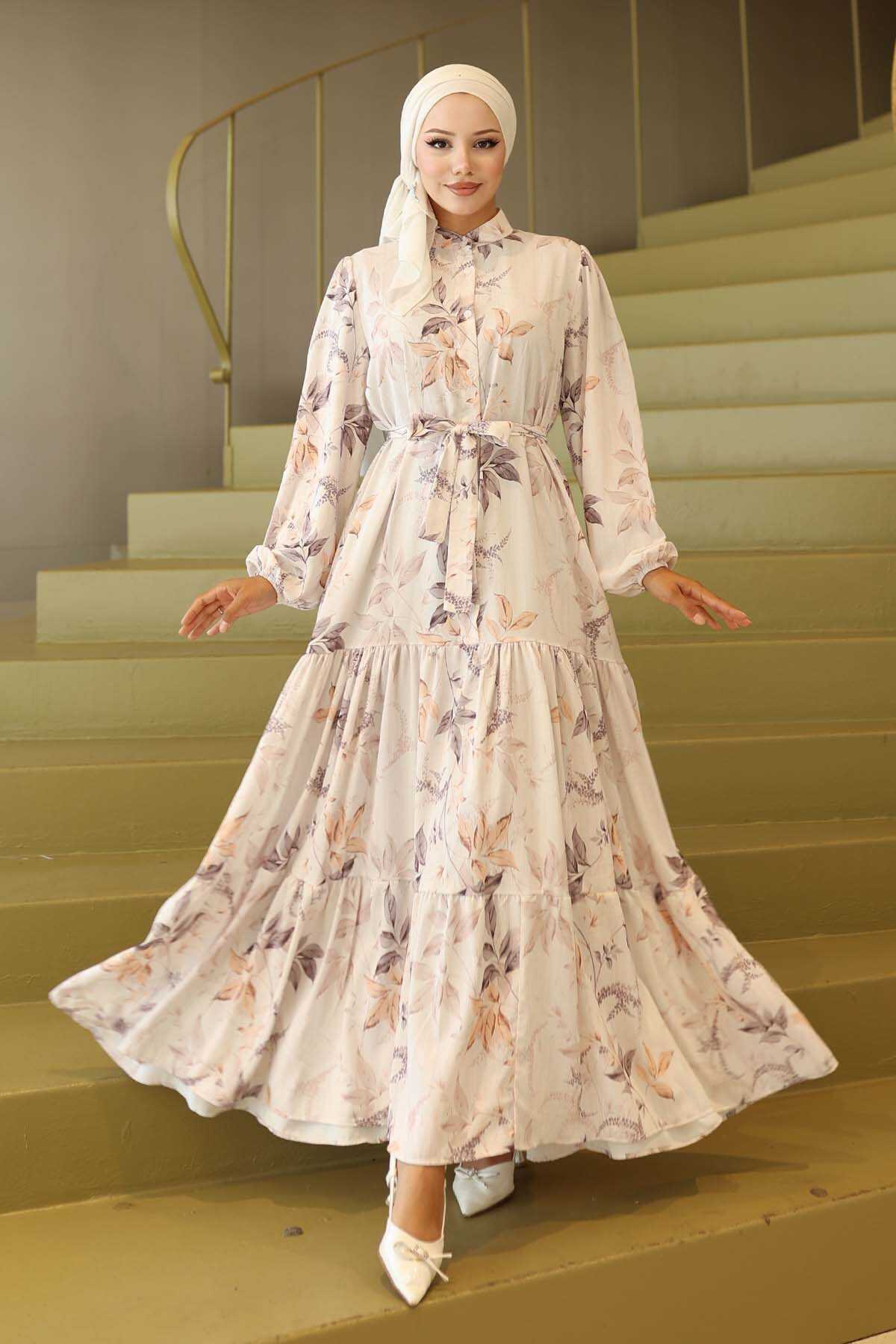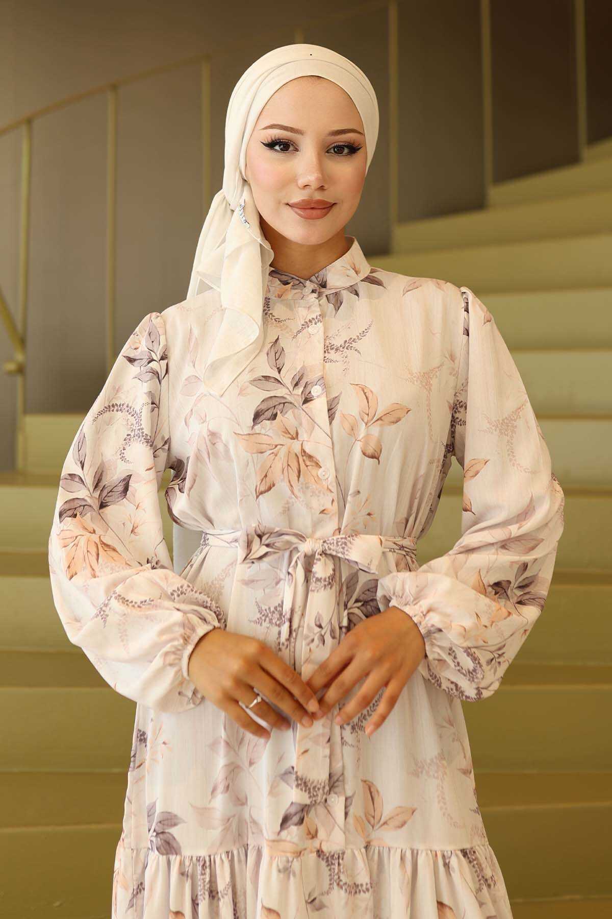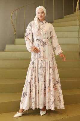 Kadın Desenli Uzun Tesettür Elbise 2586 - Krem - Kombin