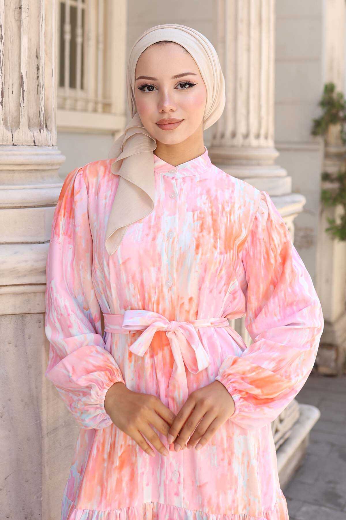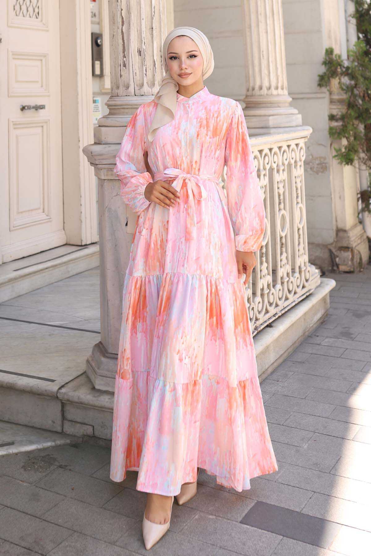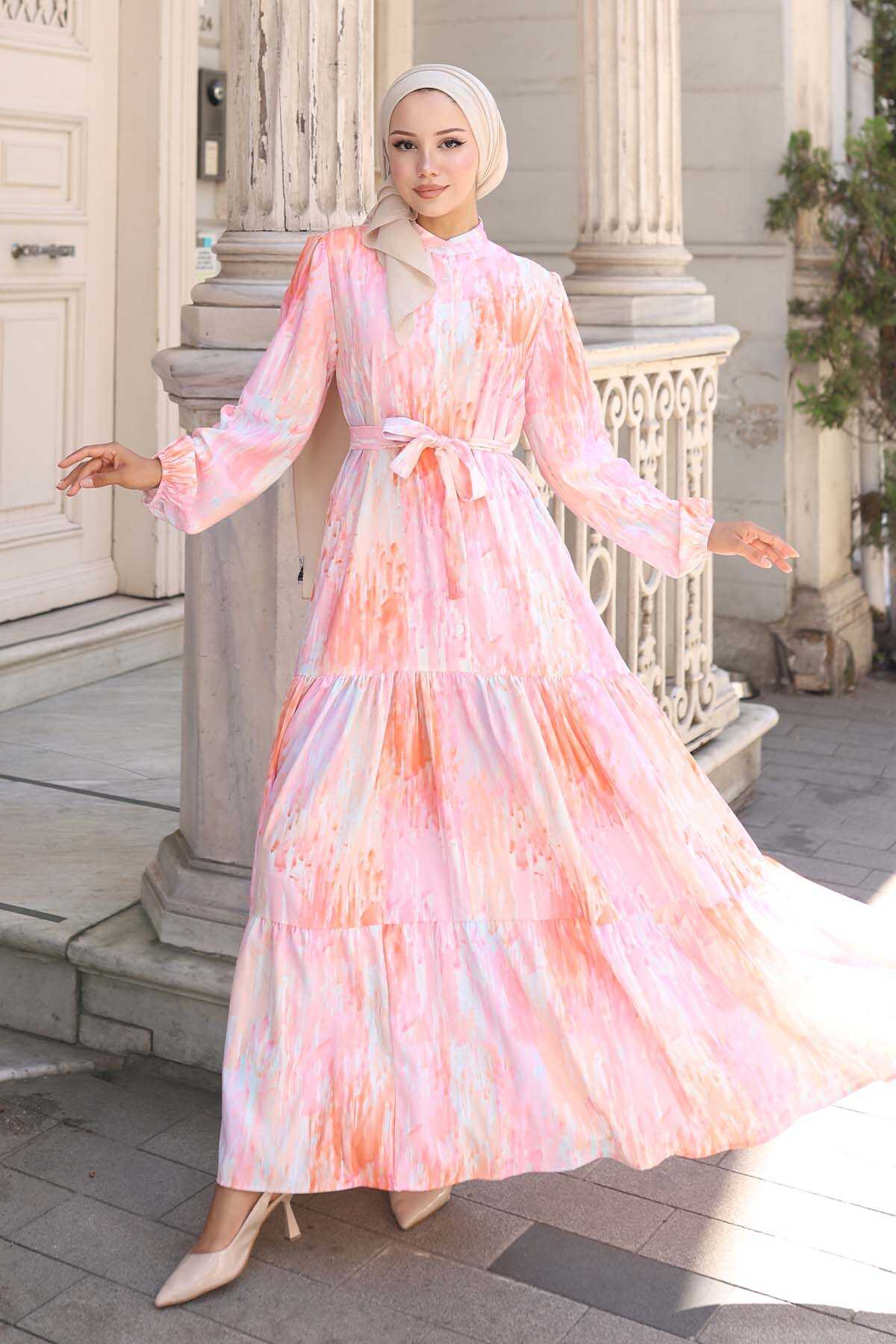 Kadın Desenli Uzun Tesettür Elbise 2586 - Pembe - Kombin