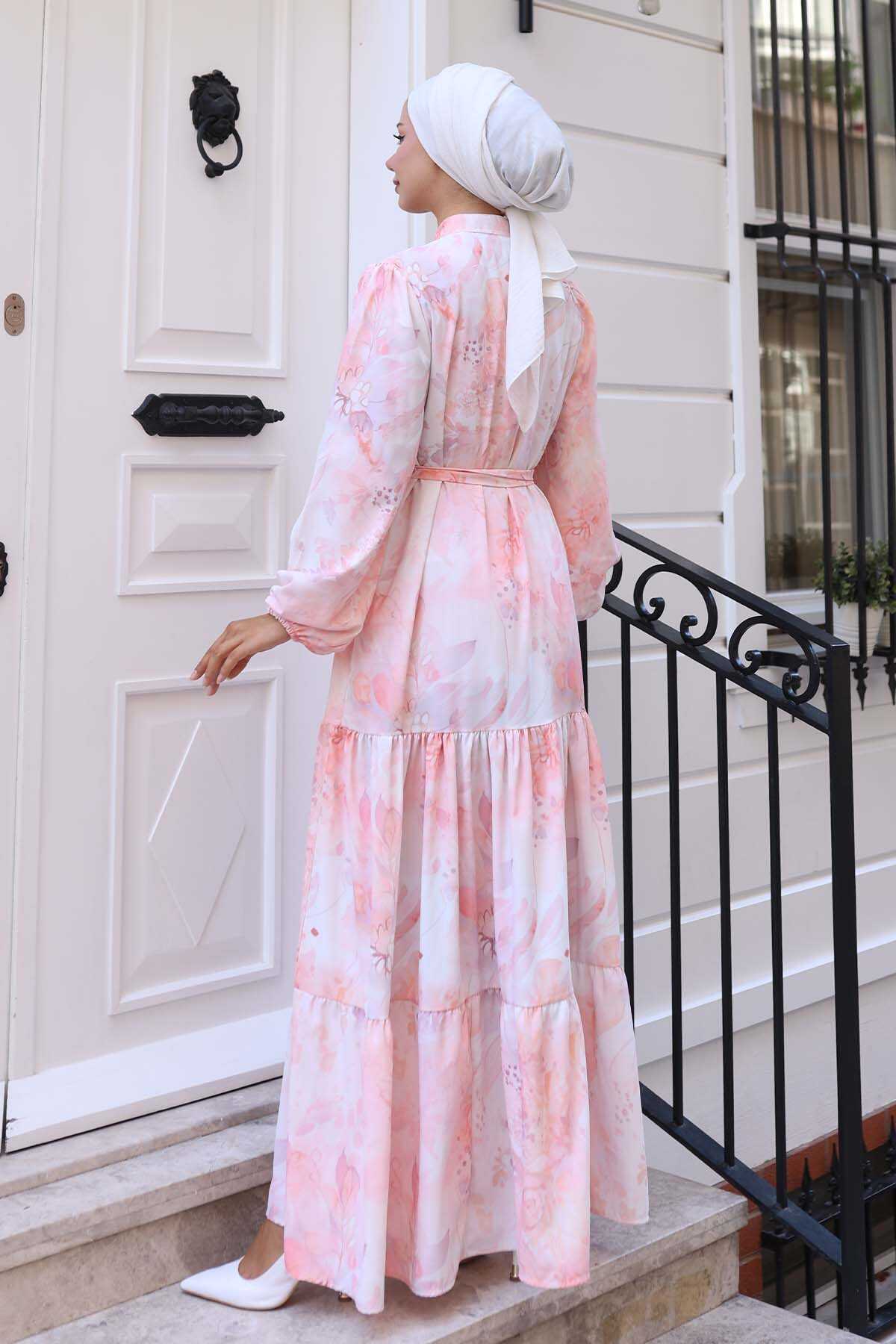 Kadın Desenli Uzun Tesettür Elbise 2586 - Pudra - Kombin