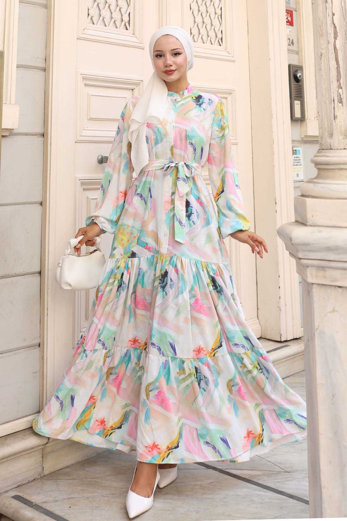 Kadın Desenli Uzun Tesettür Elbise 2586 - Turkuaz - Kombin