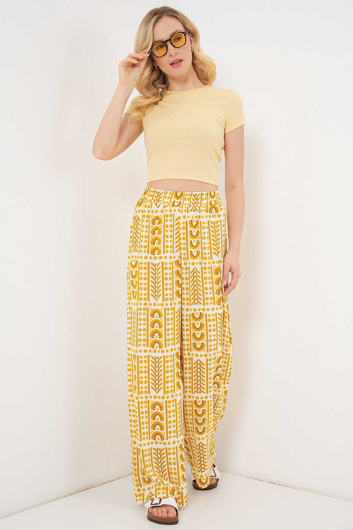Kadın Desenli Viskon Pantolon 6749 - Sarı - Kombin