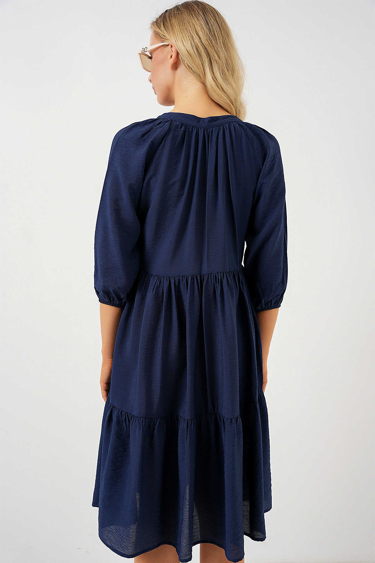 Kadın Düğmeli Kısa Kol Elbise 2559 - Lacivert - Kombin