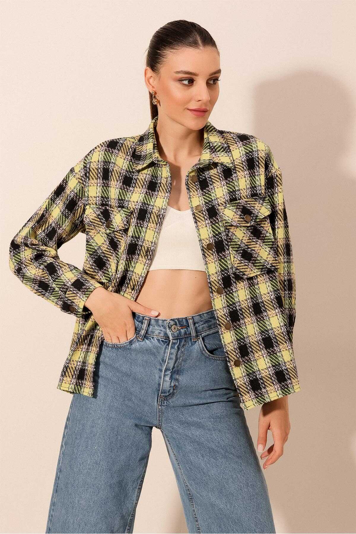 Kadın Ekose Desen Oversize Oduncu Gömlek 3854 - A.Yeşil - Kombin