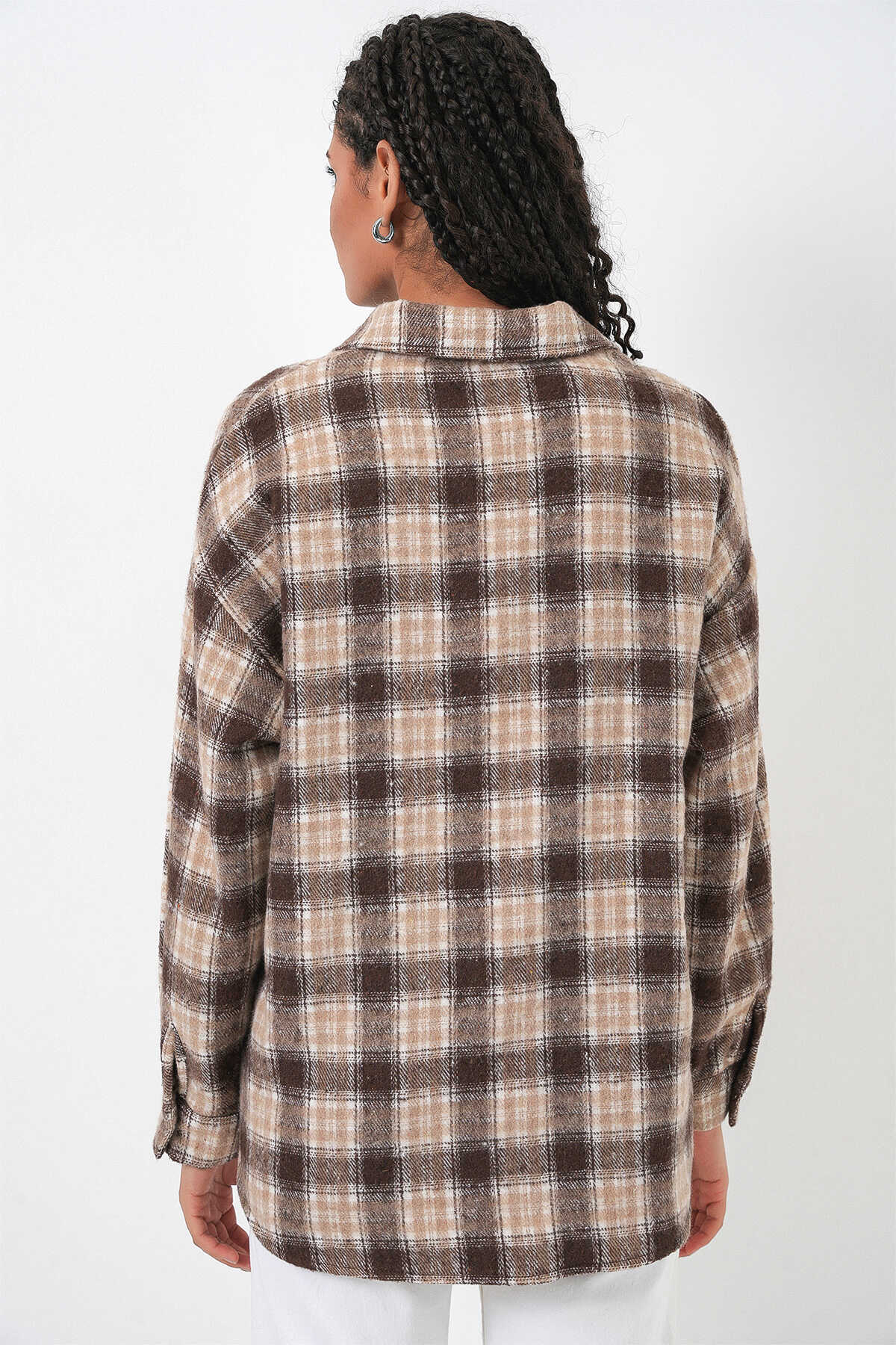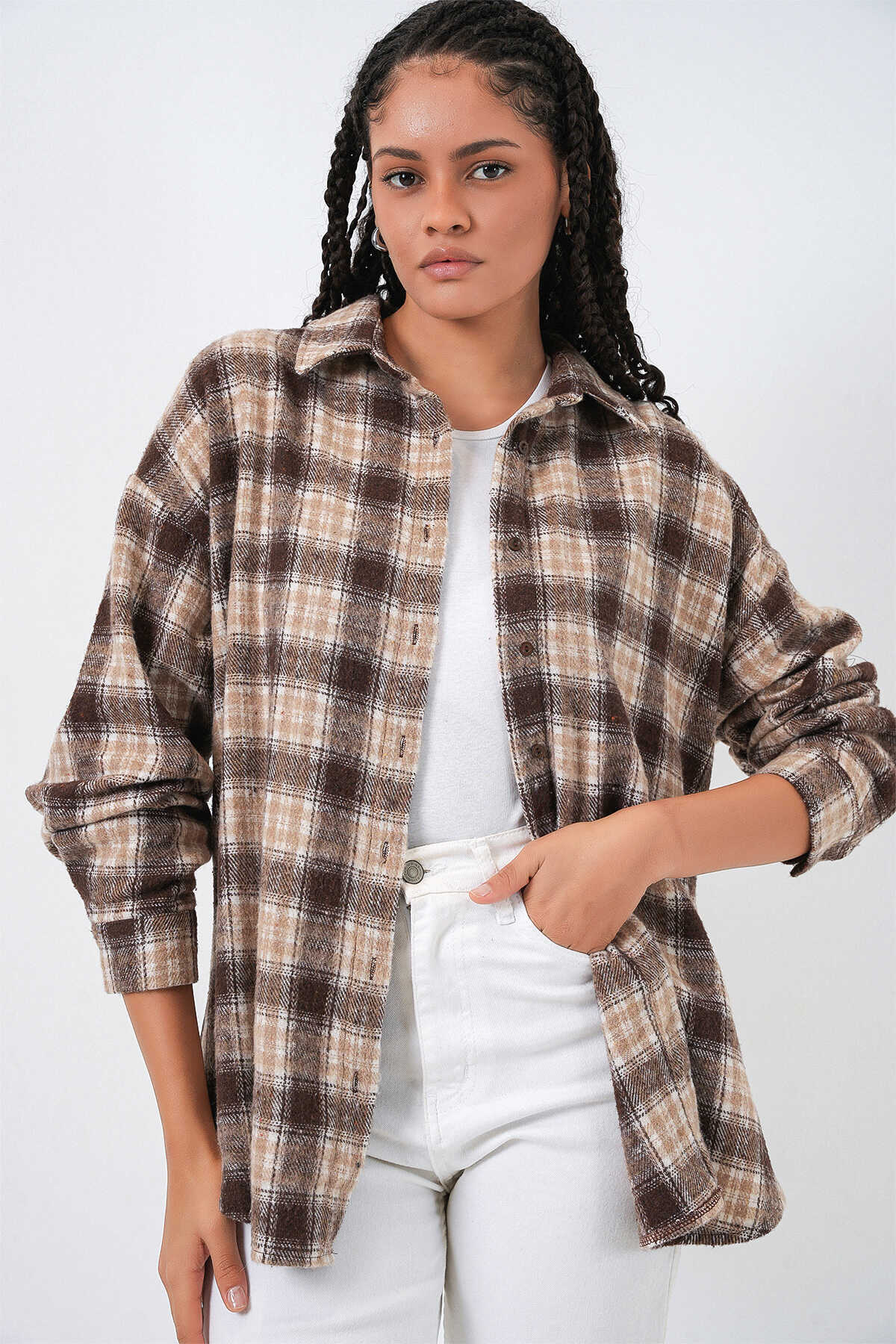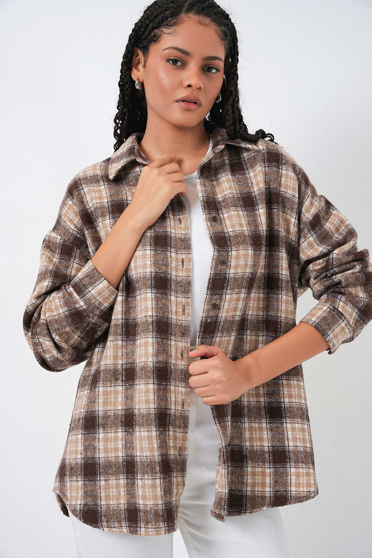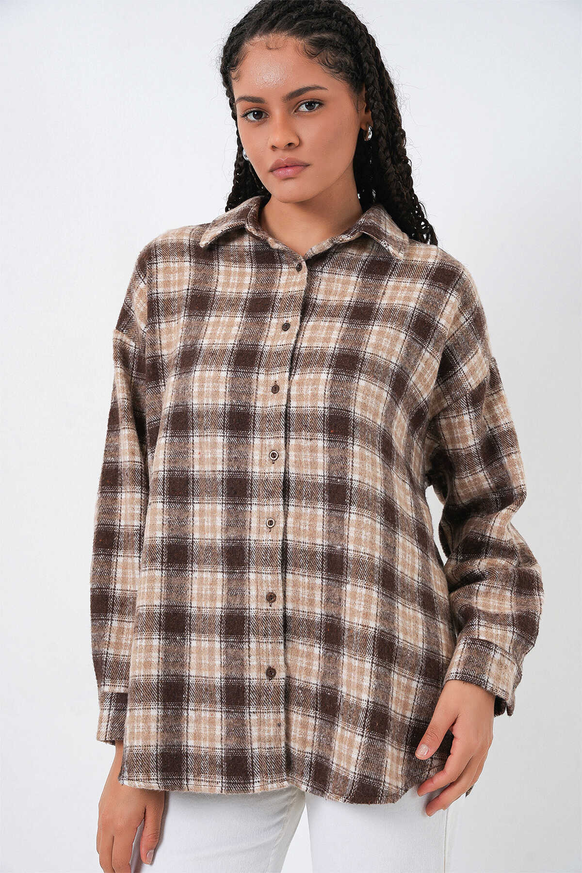 Kadin Ekose Desen Dügmeli Oversize Oduncu Gömlek