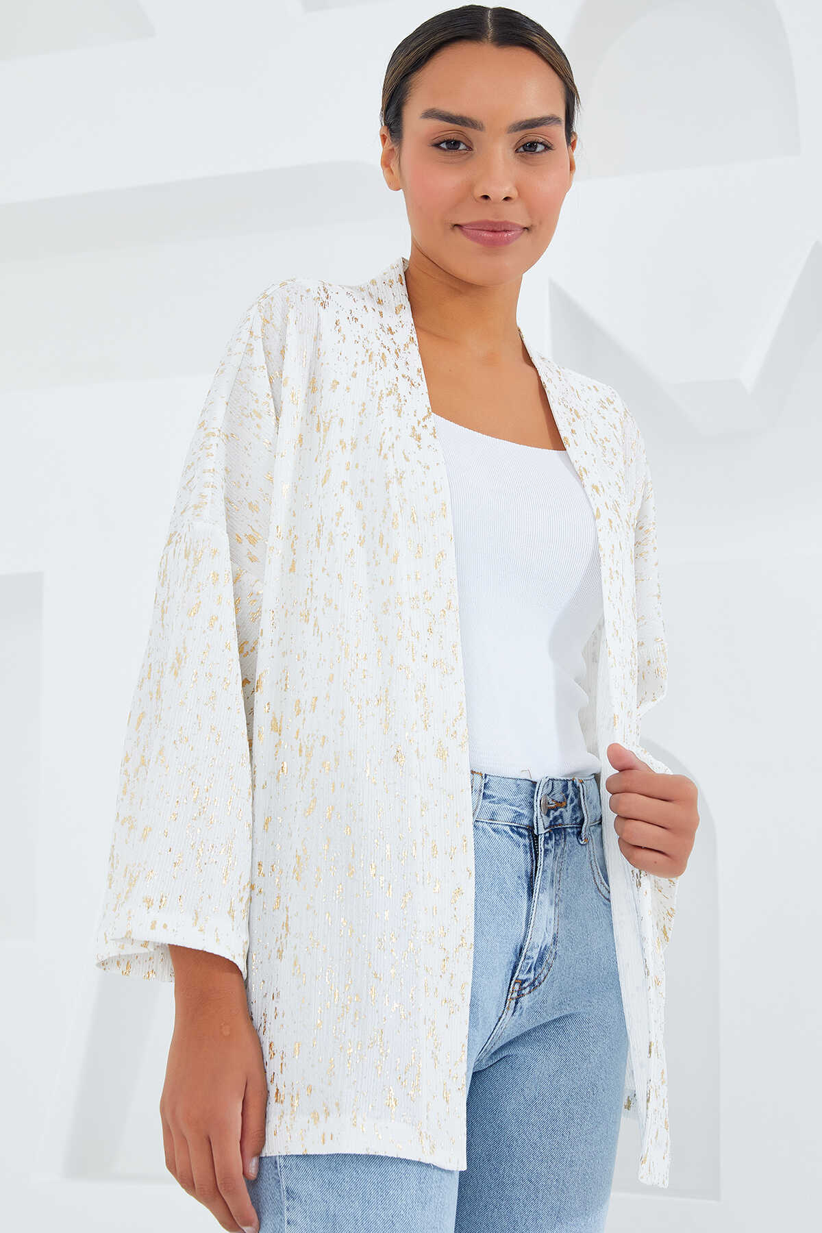 Kadın Ekru Varaklı Örme Kimono 5925 - Kombin