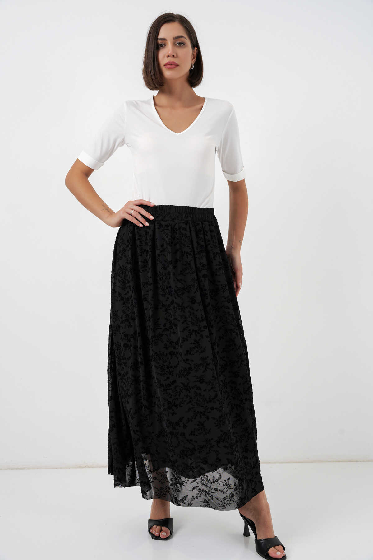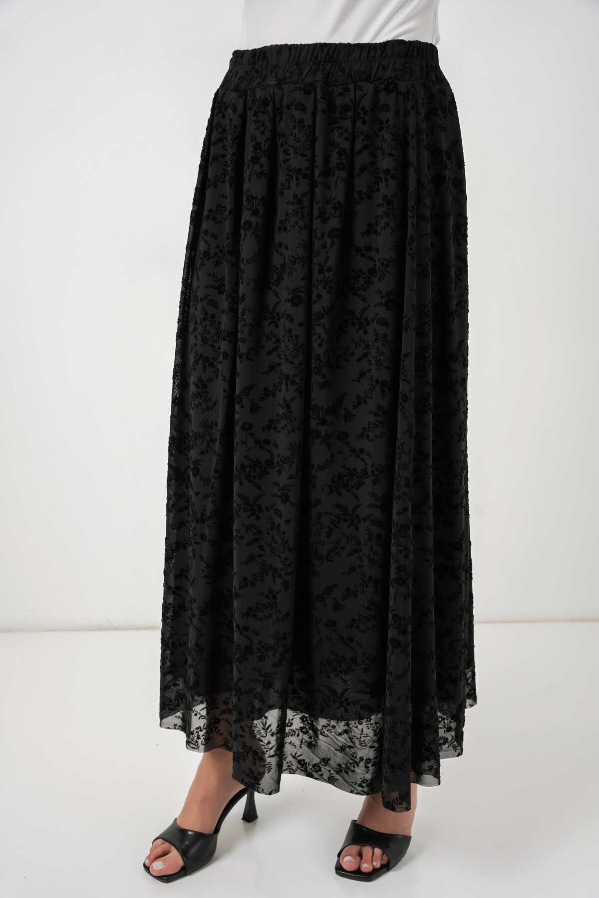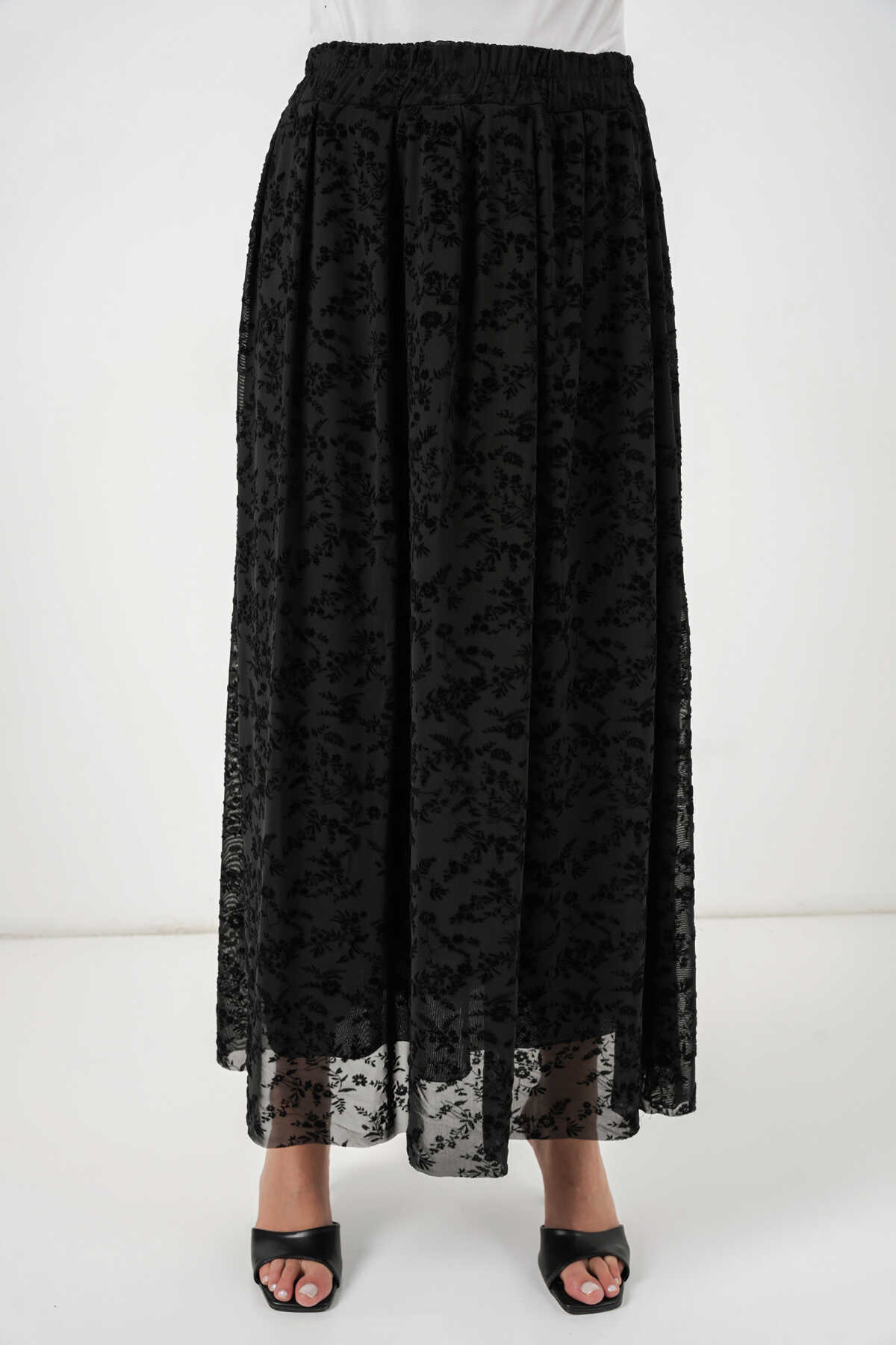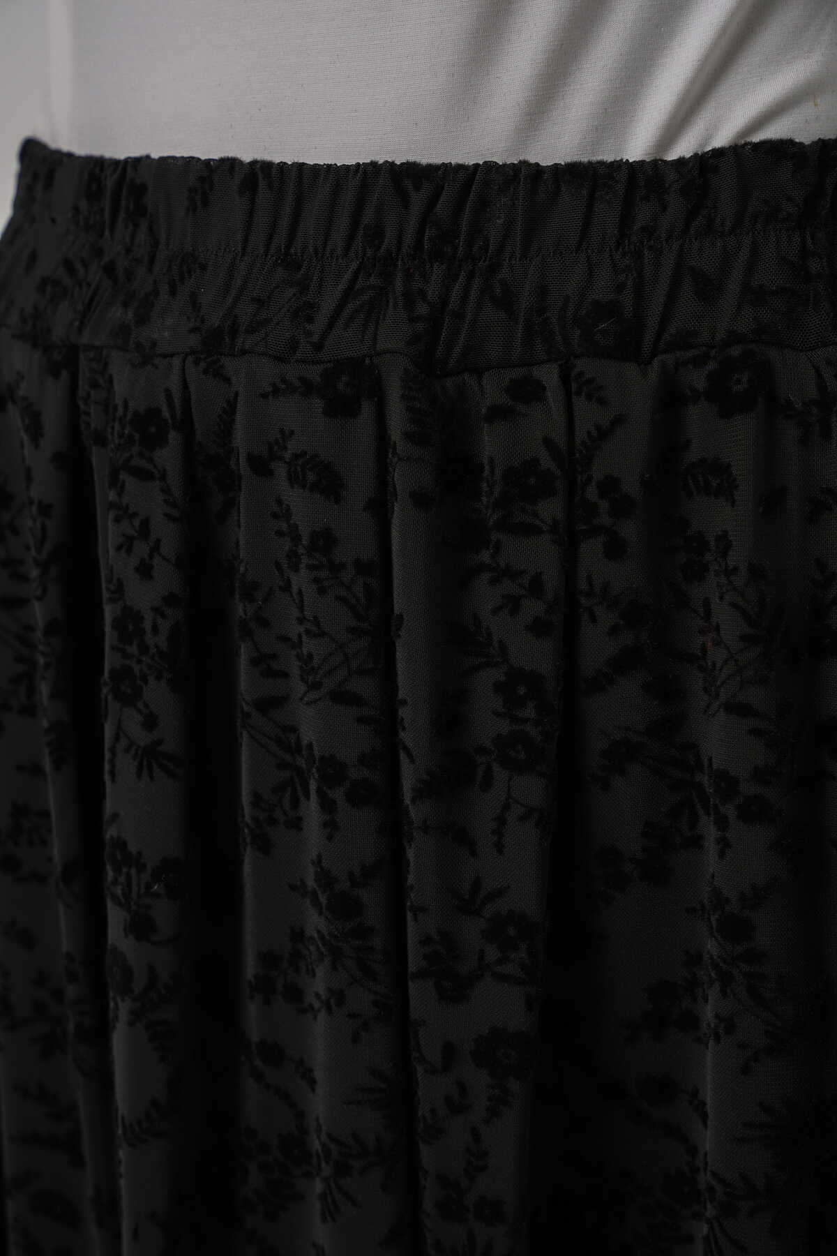 Kadın Flok Baskılı Astarlı Etek 8069 - Siyah - Kombin