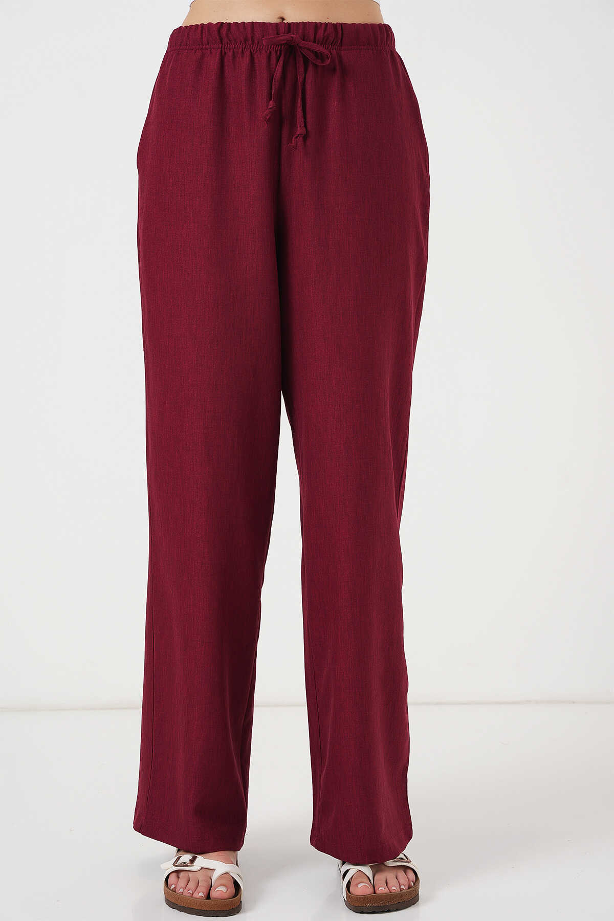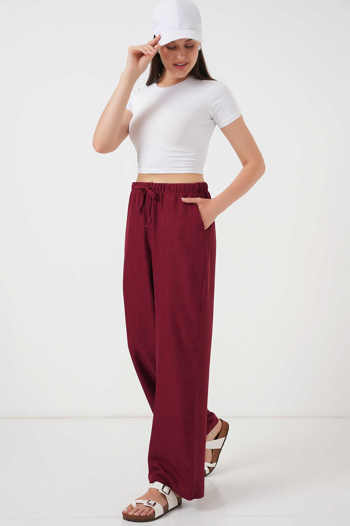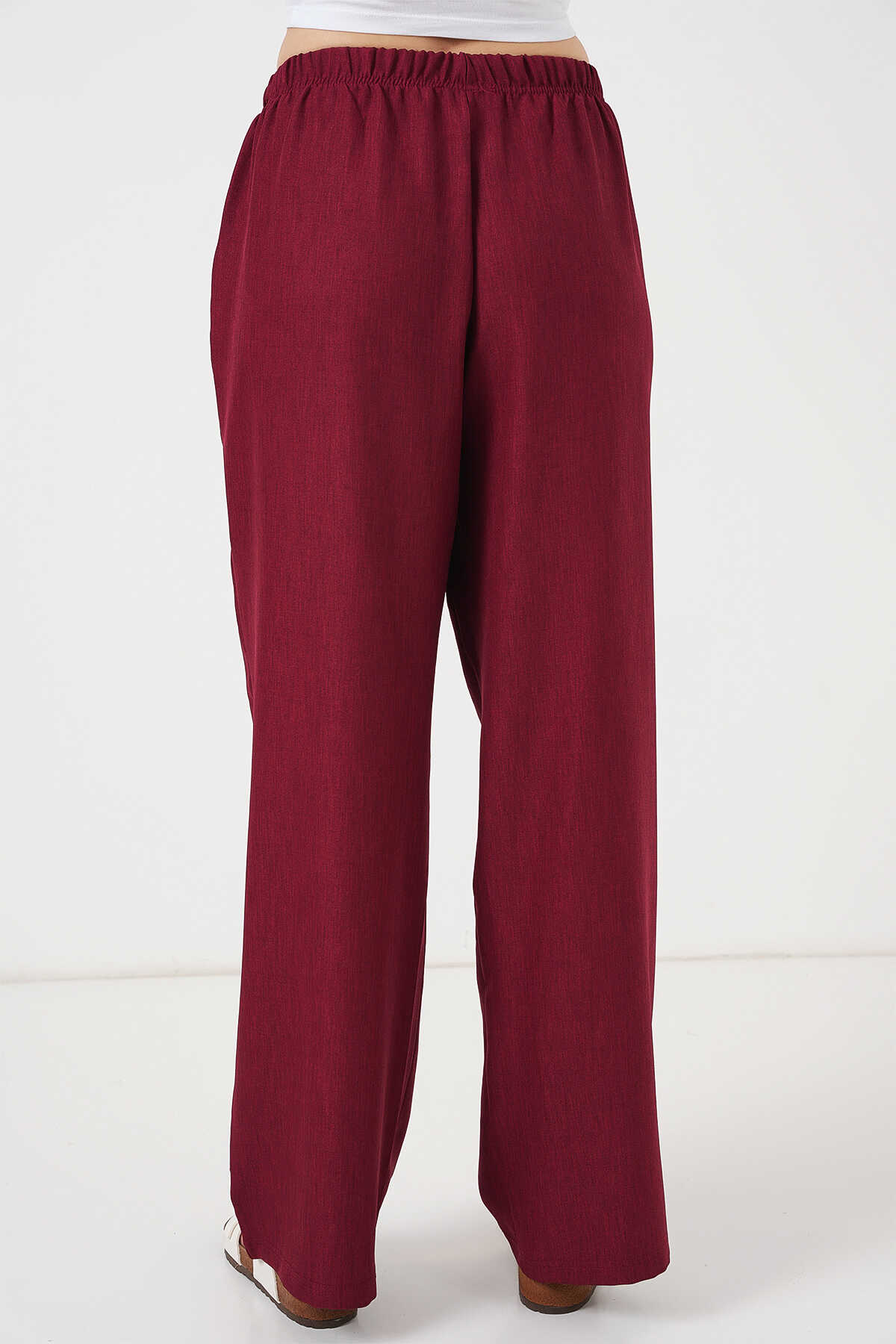 Kadın Geniş Paça Keten Pantolon 6735 - Bordo - Kombin