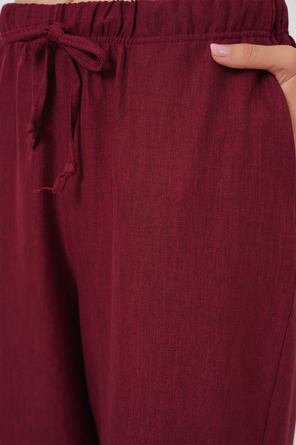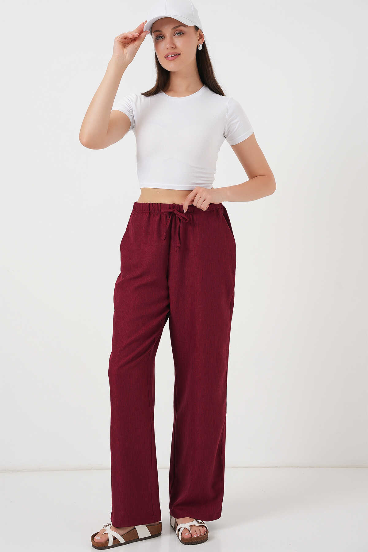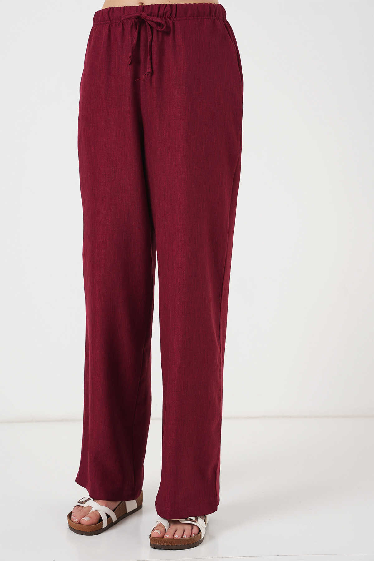 Kadın Geniş Paça Keten Pantolon 6735 - Bordo - Kombin