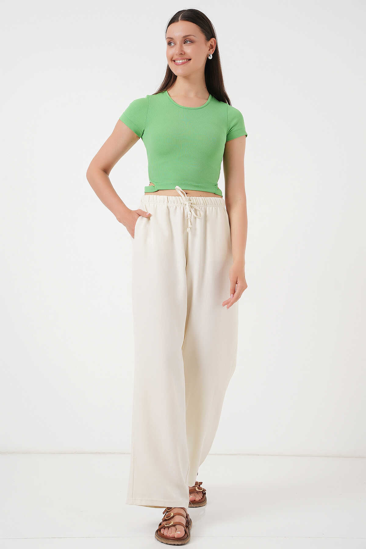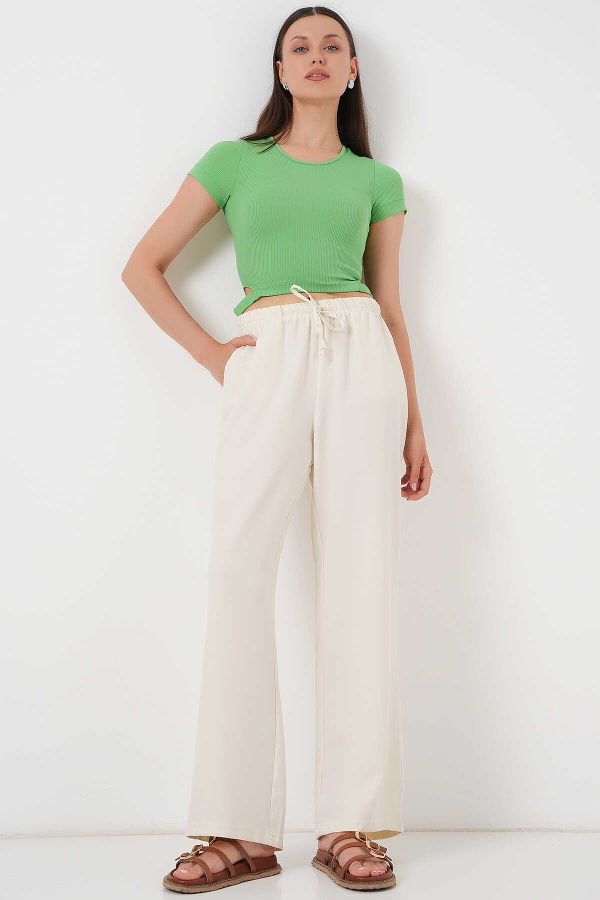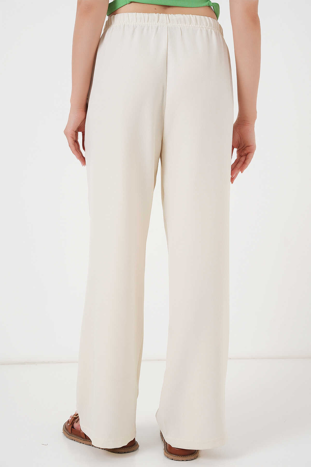 Kadın Geniş Paça Keten Pantolon 6735 - Ekru - Kombin