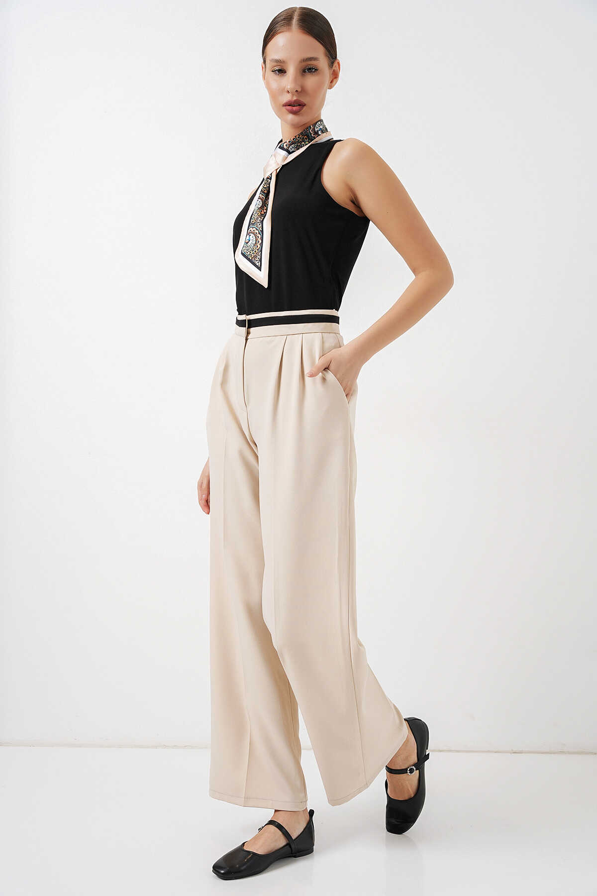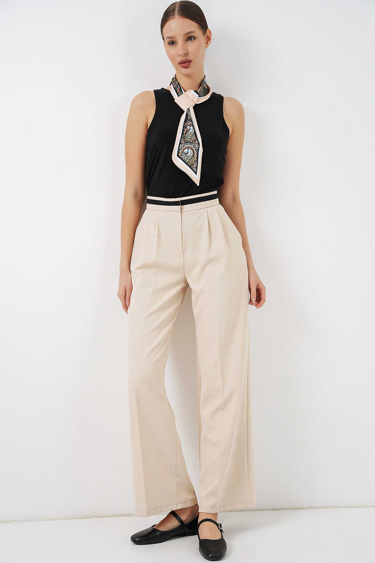Kadın Geniş Paça Kumaş Pantolon 30088 - Krem - Kombin