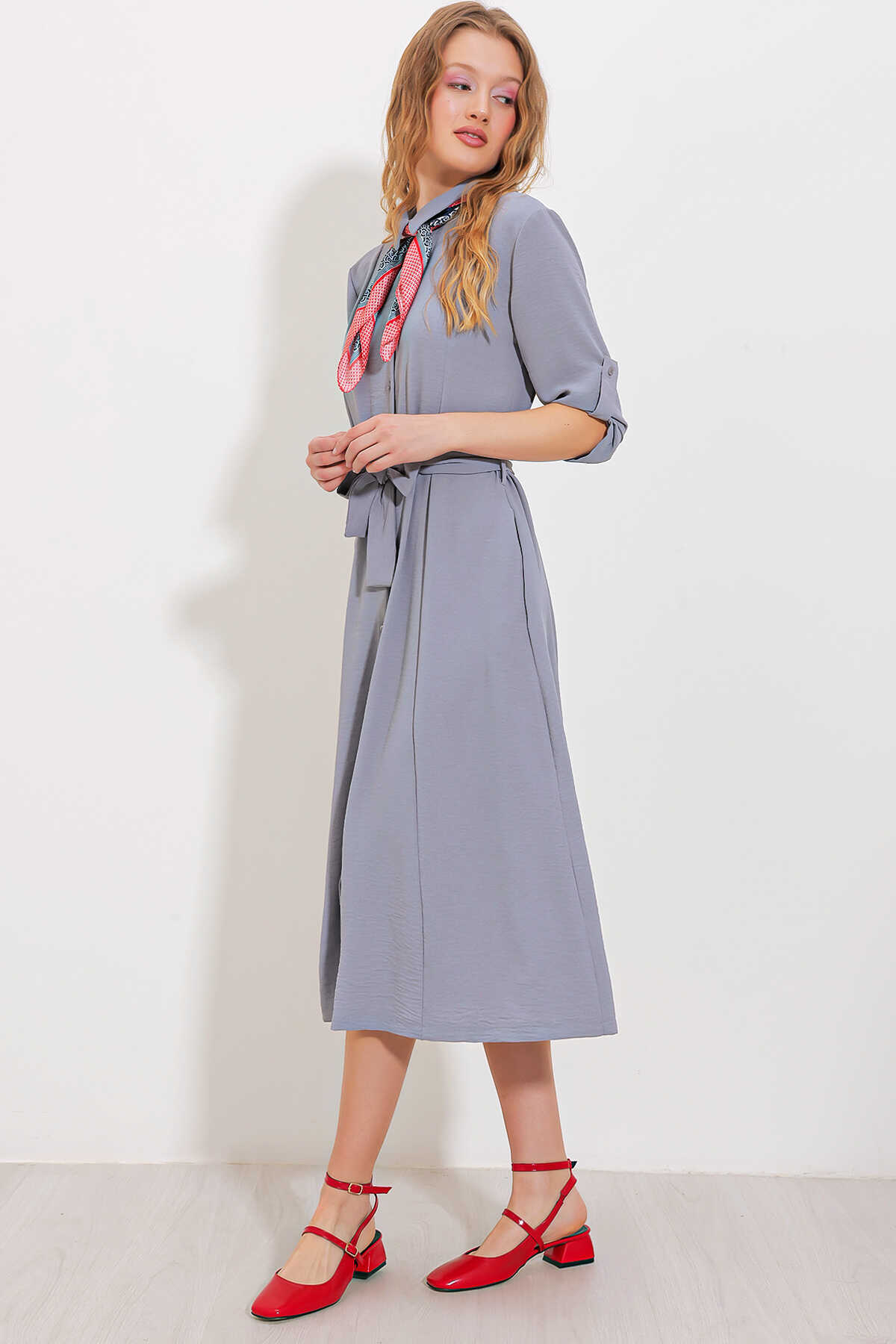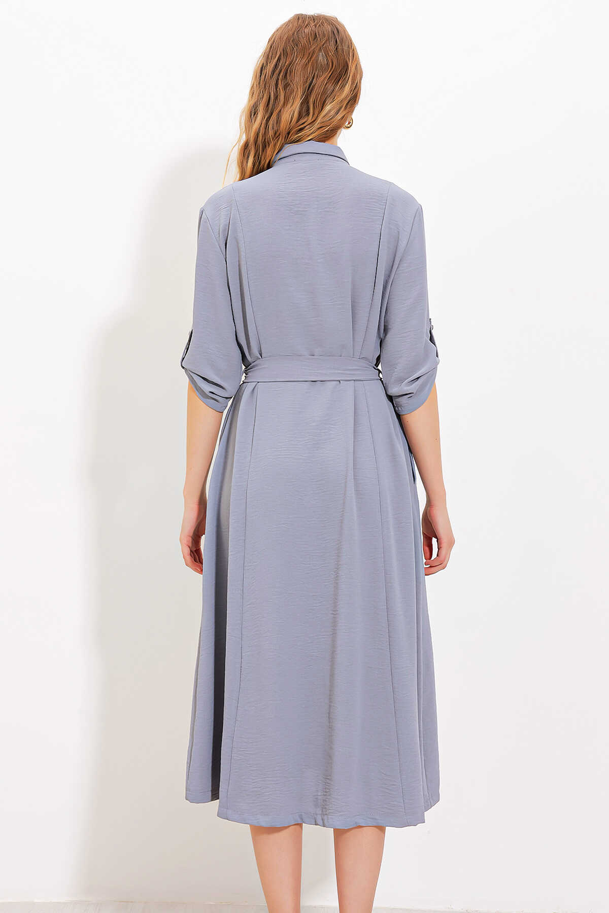 Kadın Gri Kuşaklı Gömlek Elbise 2442 - Kombin