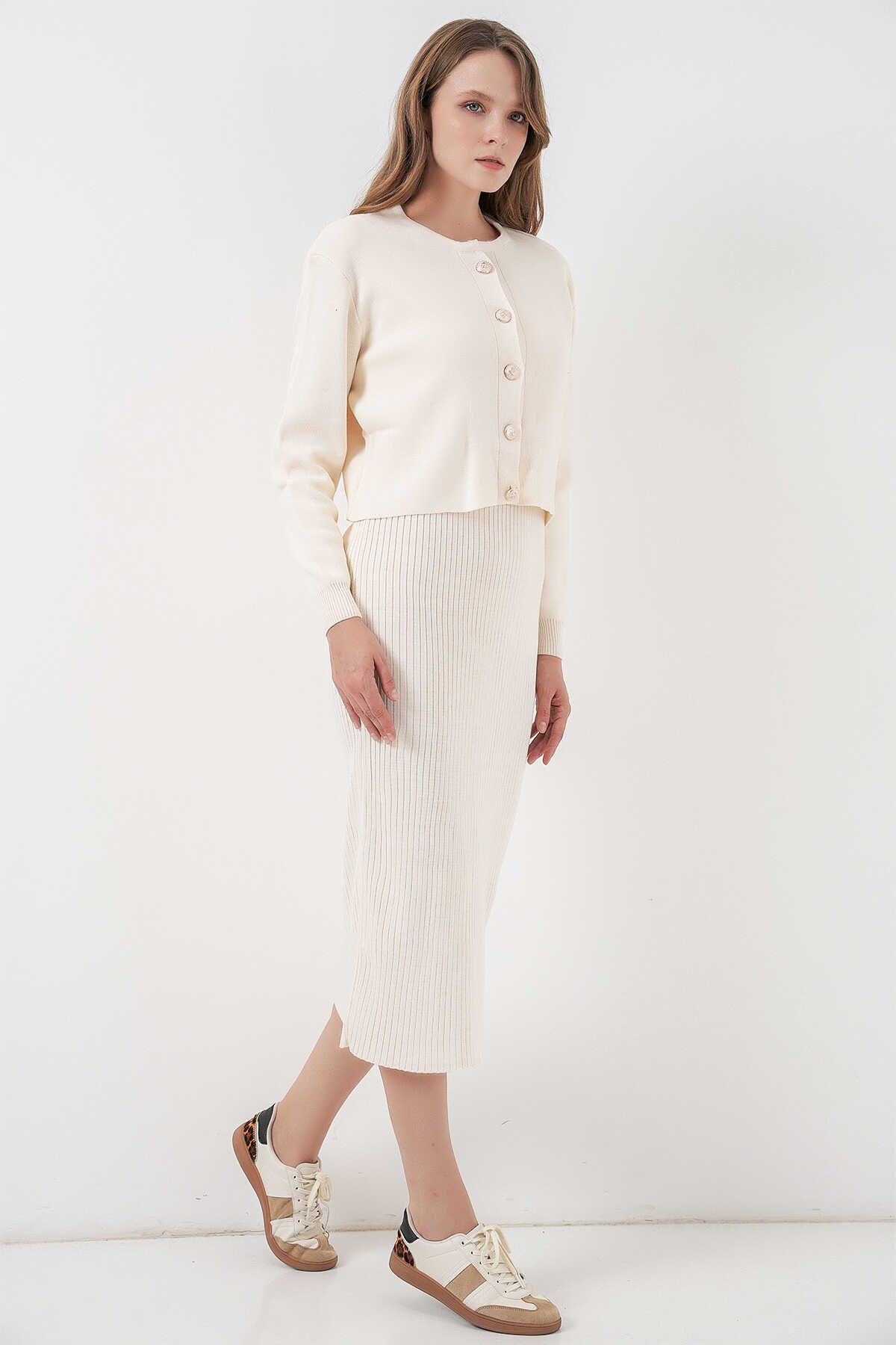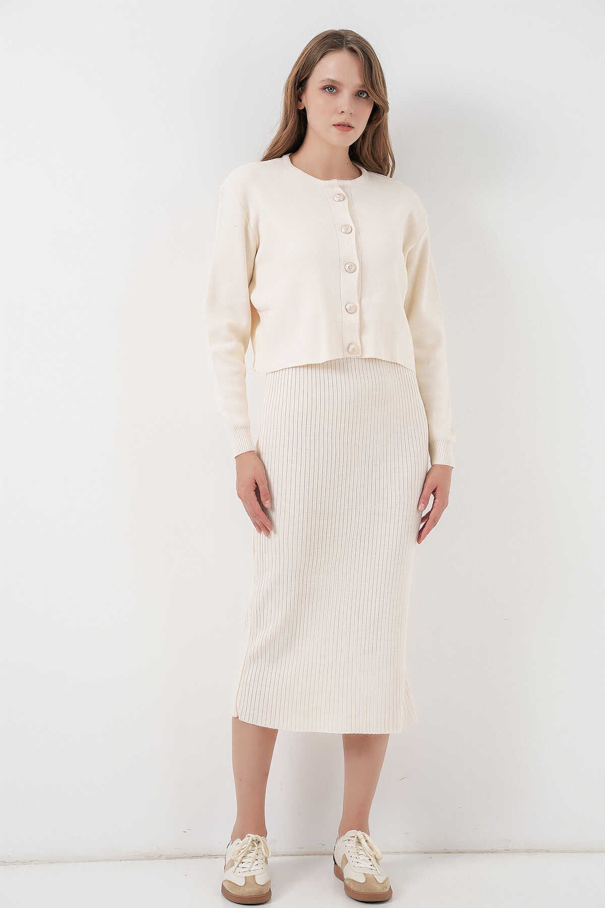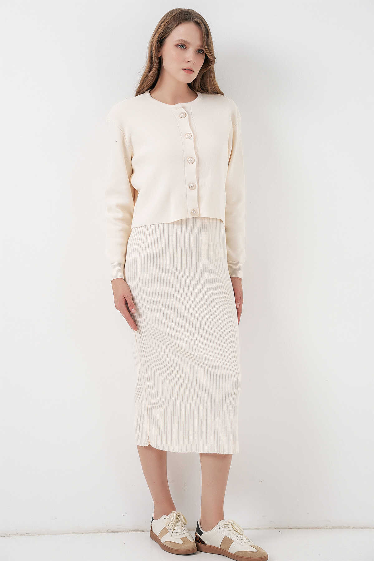 Kadın Hırka Elbise Triko İkili Takım 15960 - Ekru