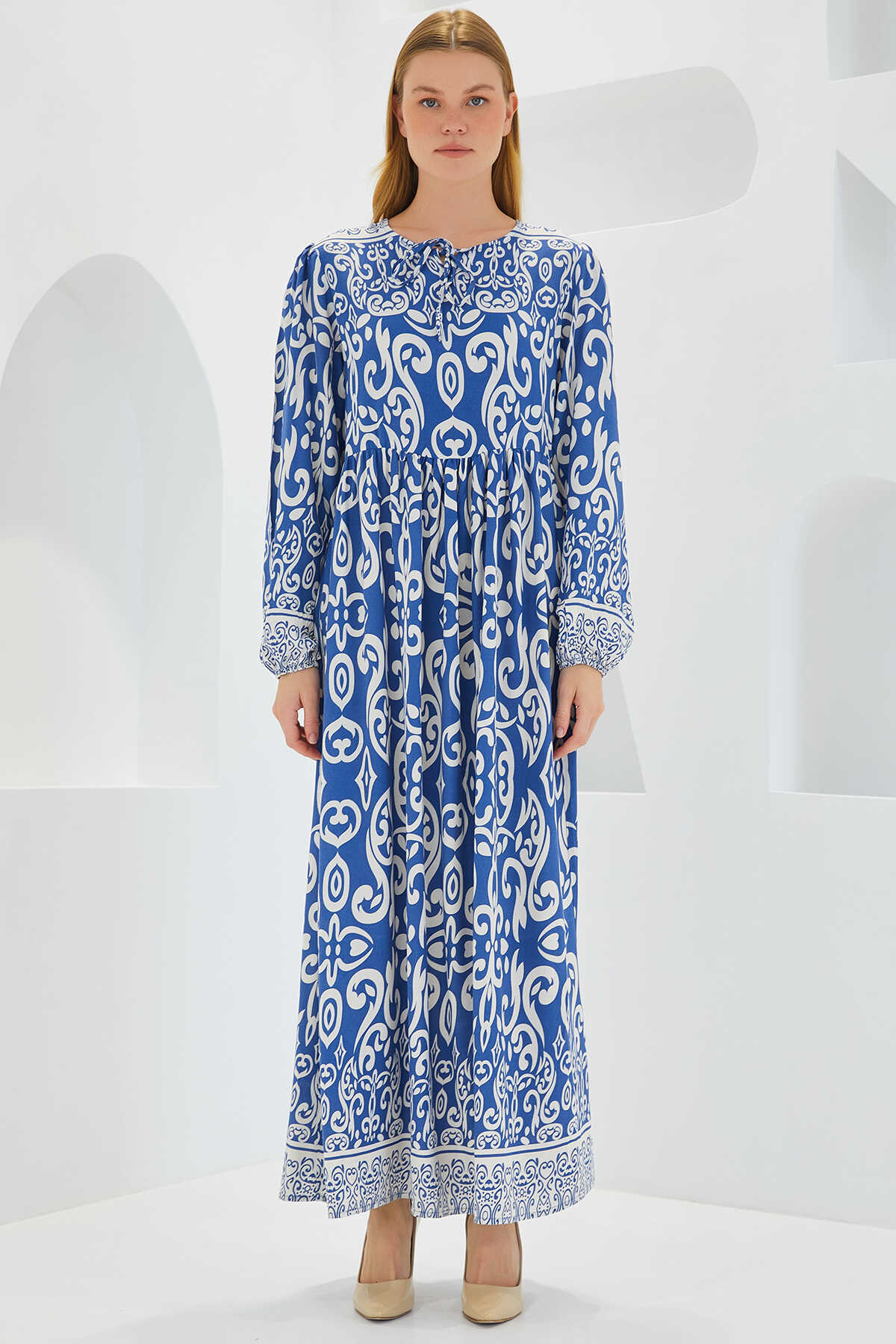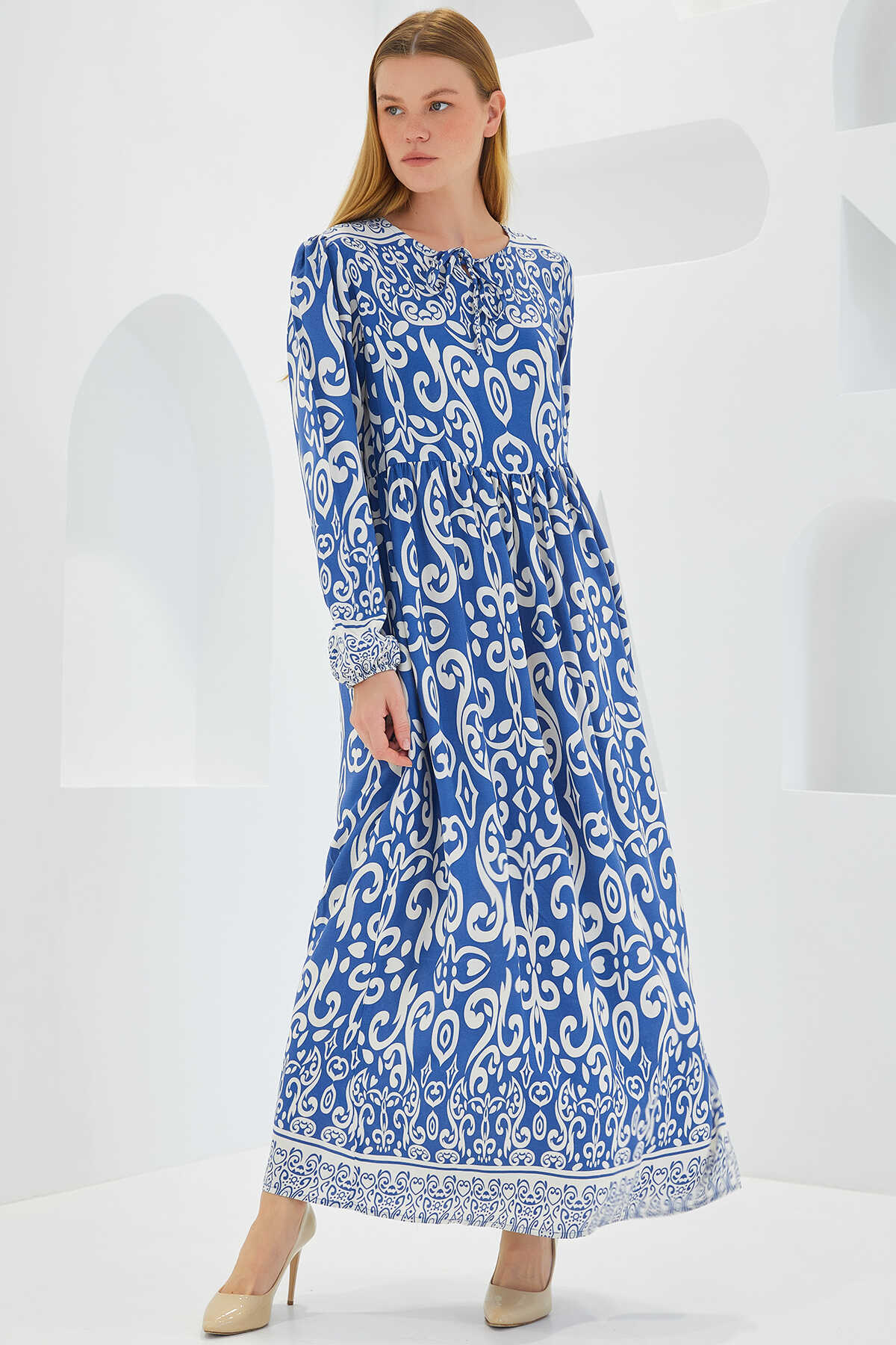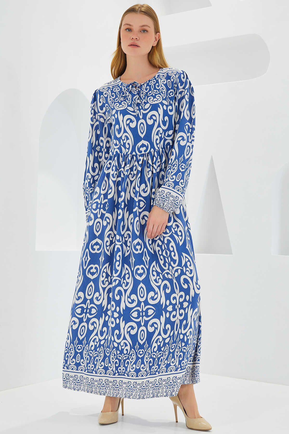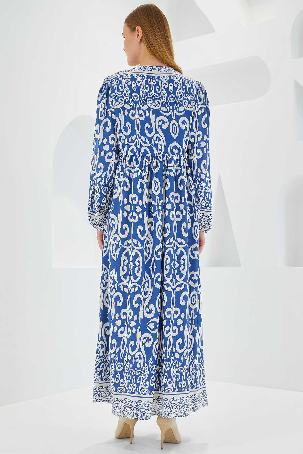 Kadın İndigo Ekru Desenli Uzun Viskon Elbise 1947 - Kombin