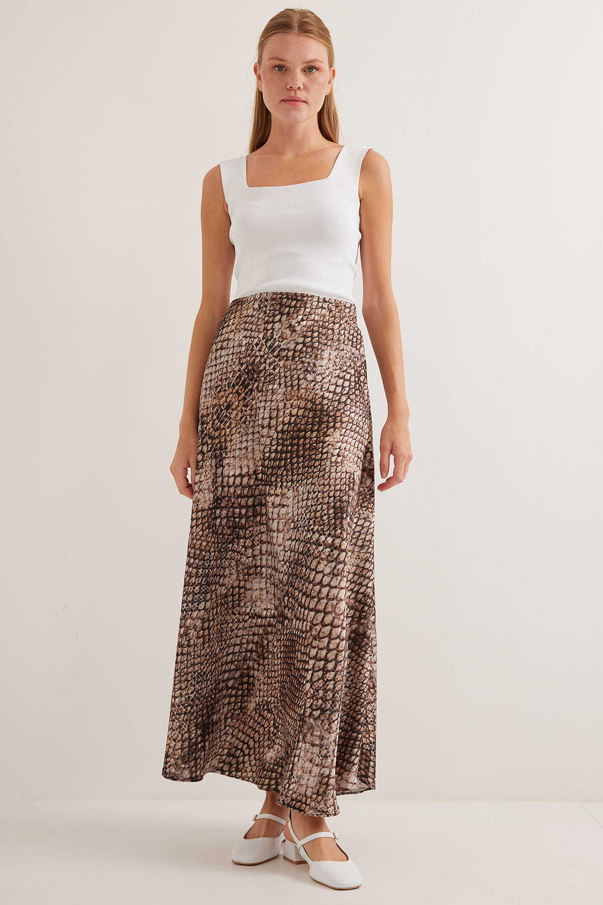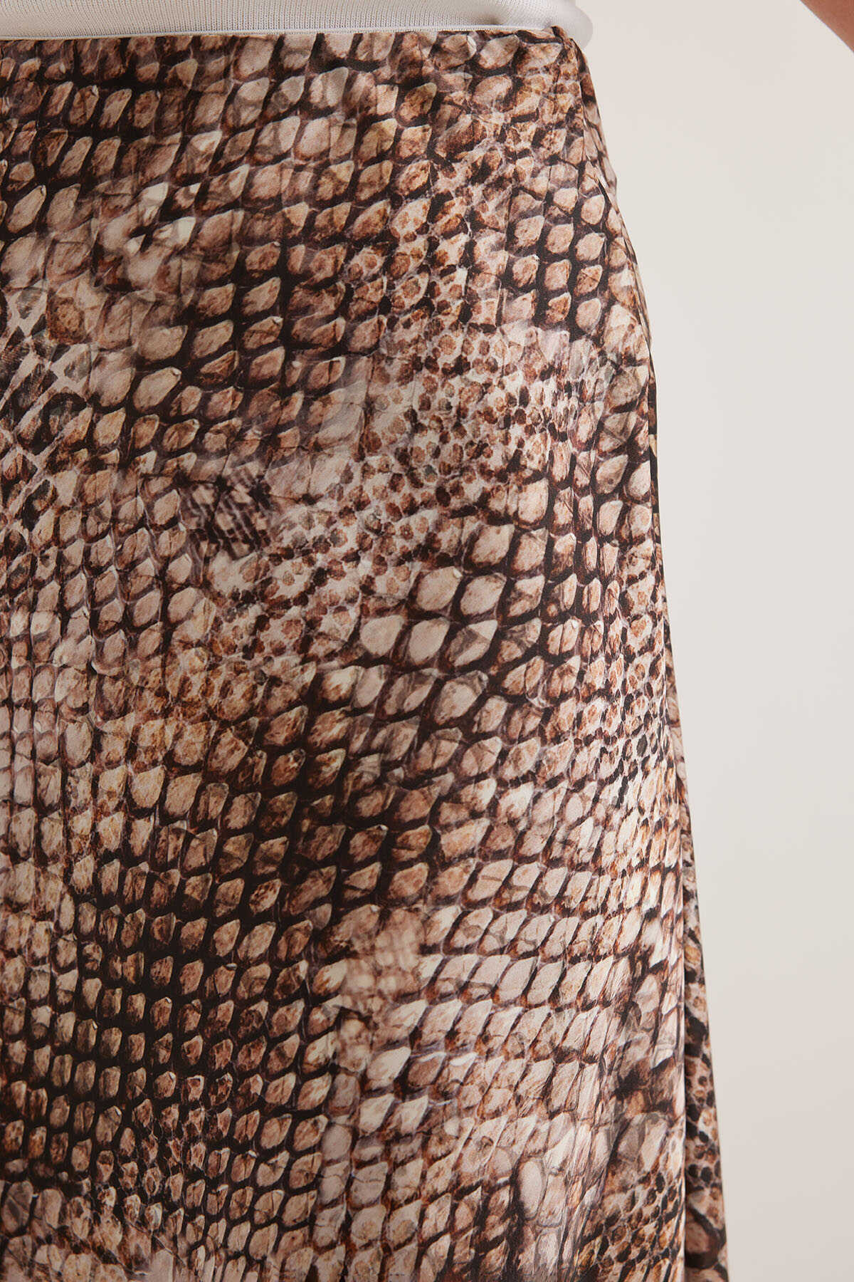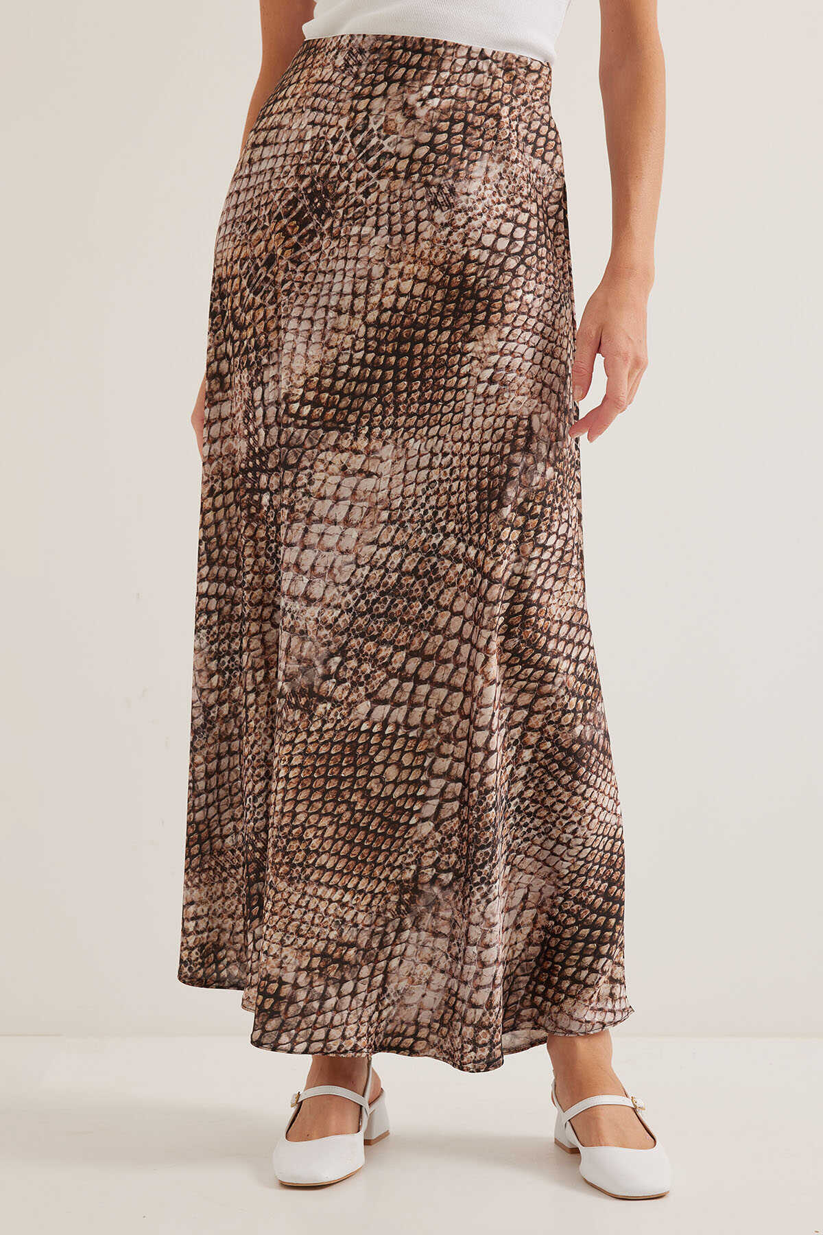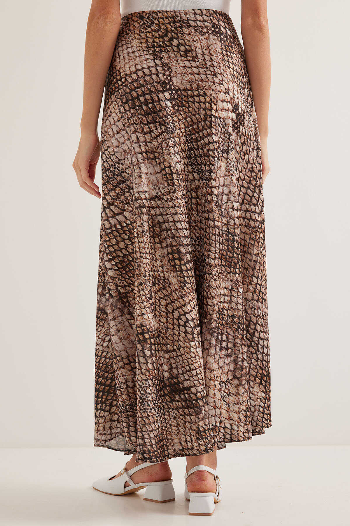 Kadın Kahve Bej Desenli Saten Etek 15877 - Kombin